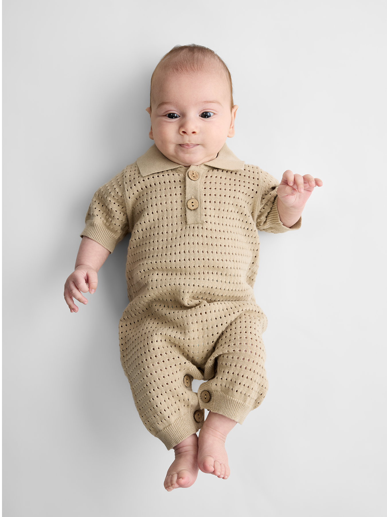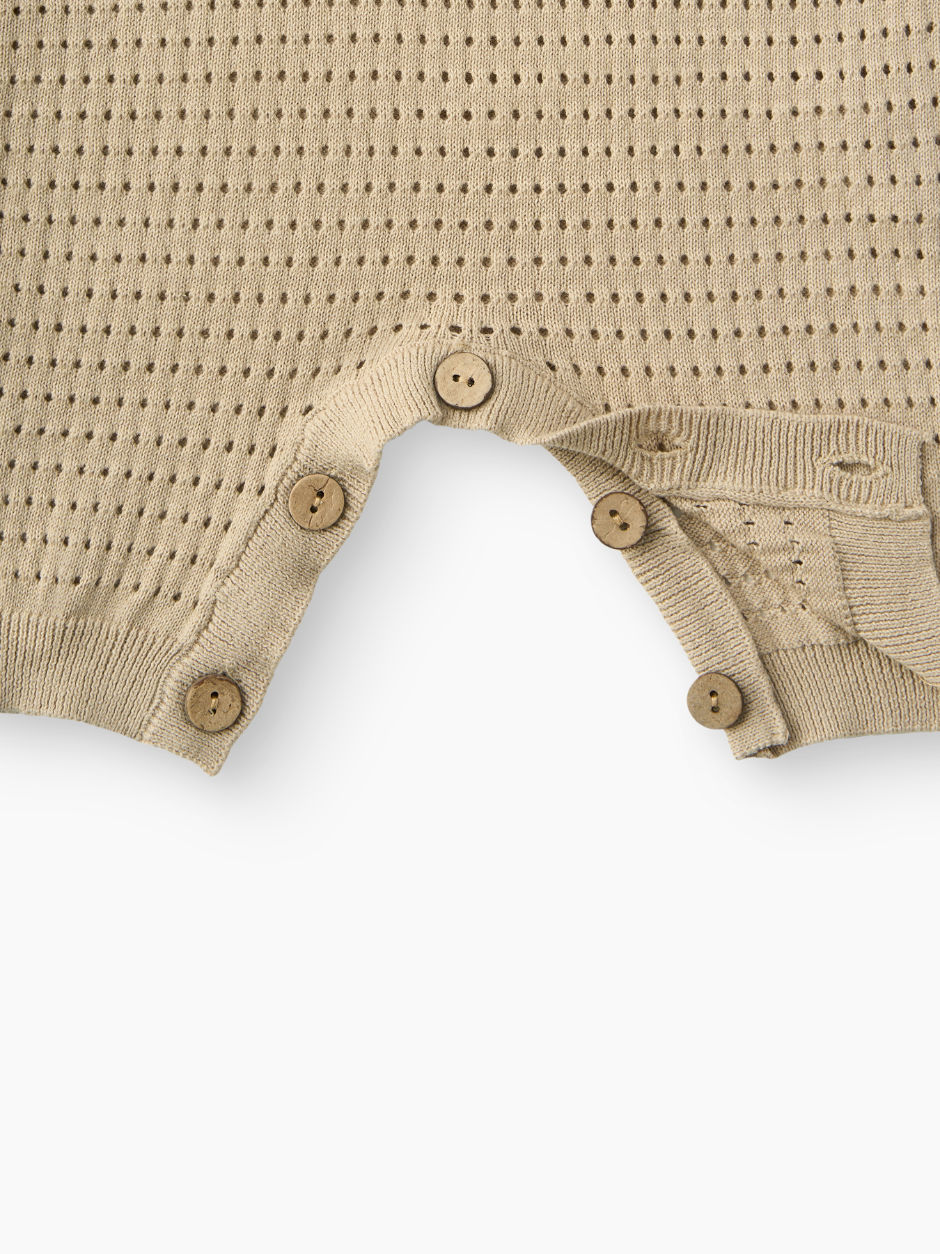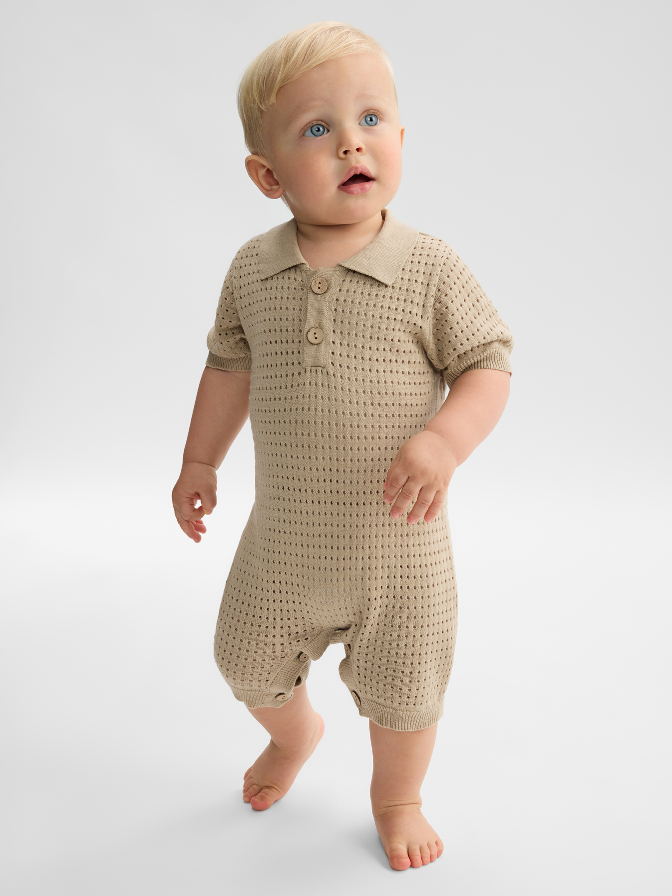 Вязаный комбинезон-песочник с отложным воротничком и рукавами-фонариками обеспечивает стиль с самого рождения. Благодаря пуговицам у горловины комбинезон легко надевать и снимать. Кнопки снизу облегчают смену подгузника. Связан из 100% хлопка. Натуральный материал дарит комфорт в жаркую погоду, дышит, защищает от перегрева. Стильный песочник подходит для сладкого сна и активного бодрствования.