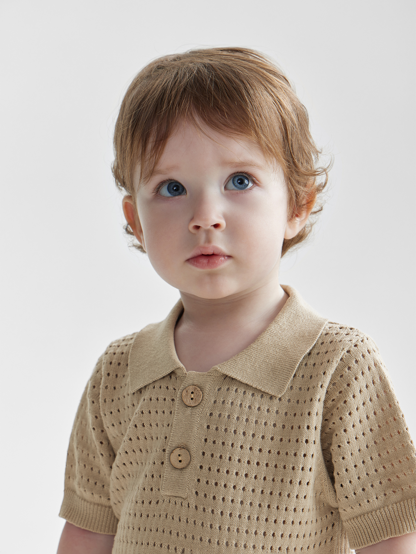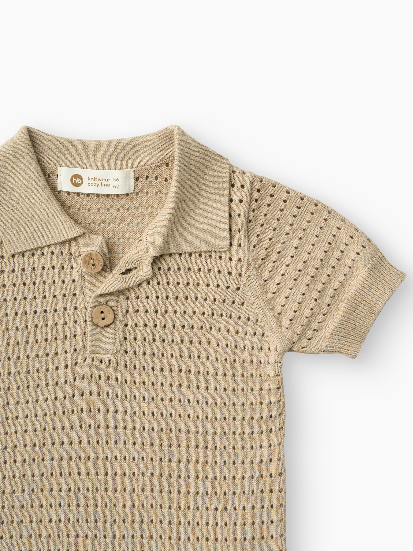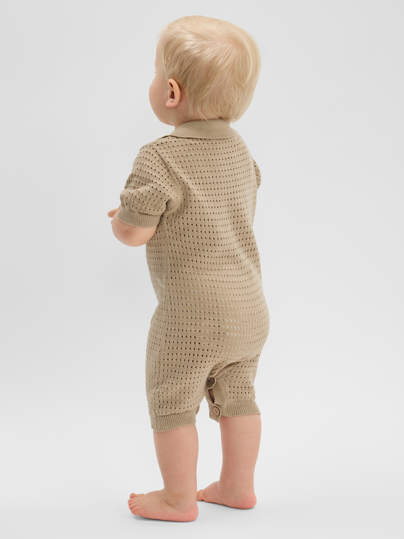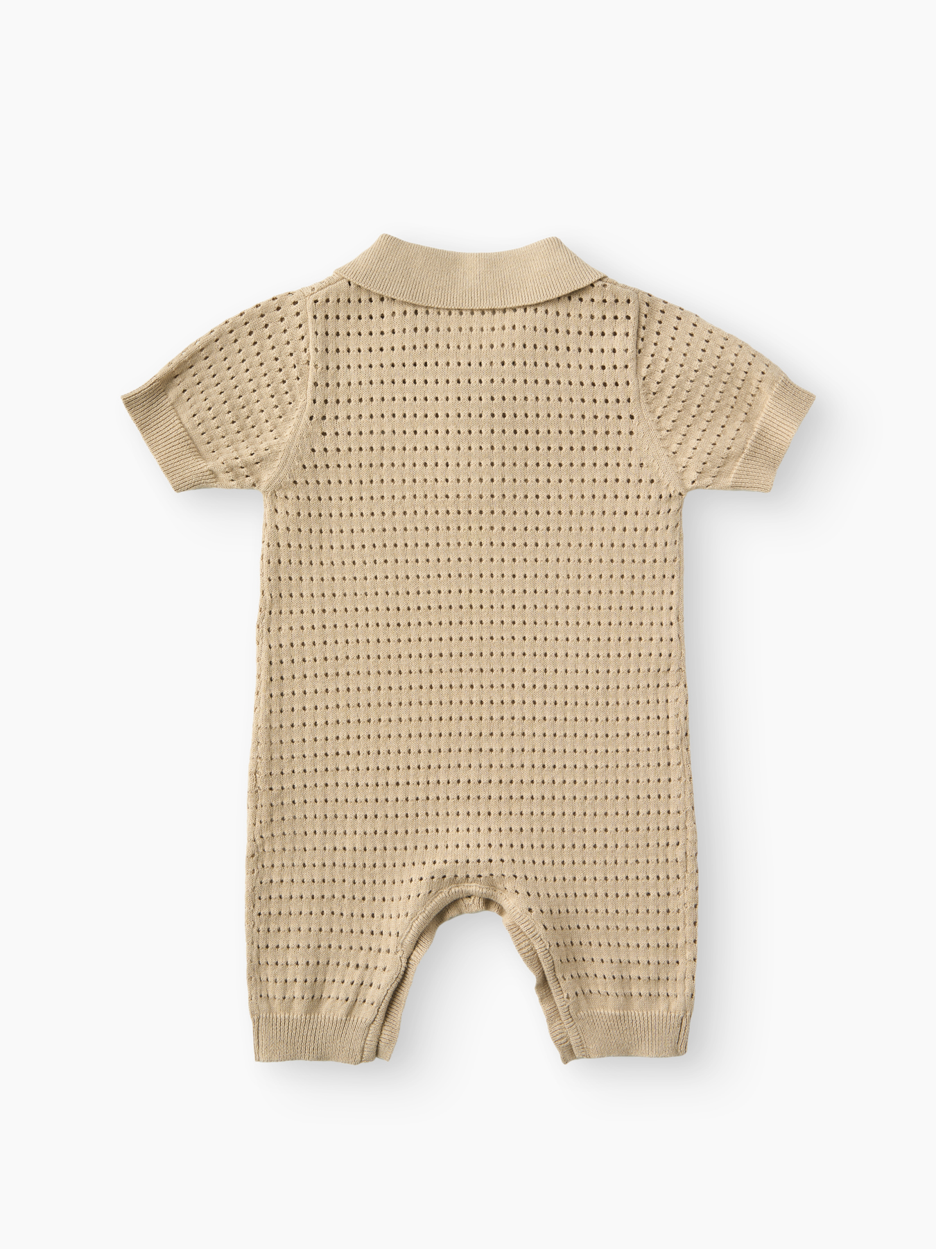 Вязаный комбинезон-песочник с отложным воротничком и рукавами-фонариками обеспечивает стиль с самого рождения. Благодаря пуговицам у горловины комбинезон легко надевать и снимать. Кнопки снизу облегчают смену подгузника. Связан из 100% хлопка. Натуральный материал дарит комфорт в жаркую погоду, дышит, защищает от перегрева. Стильный песочник подходит для сладкого сна и активного бодрствования.