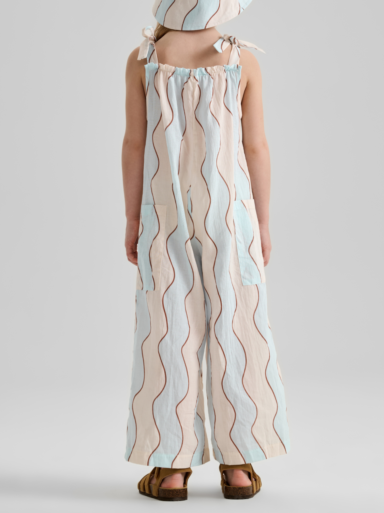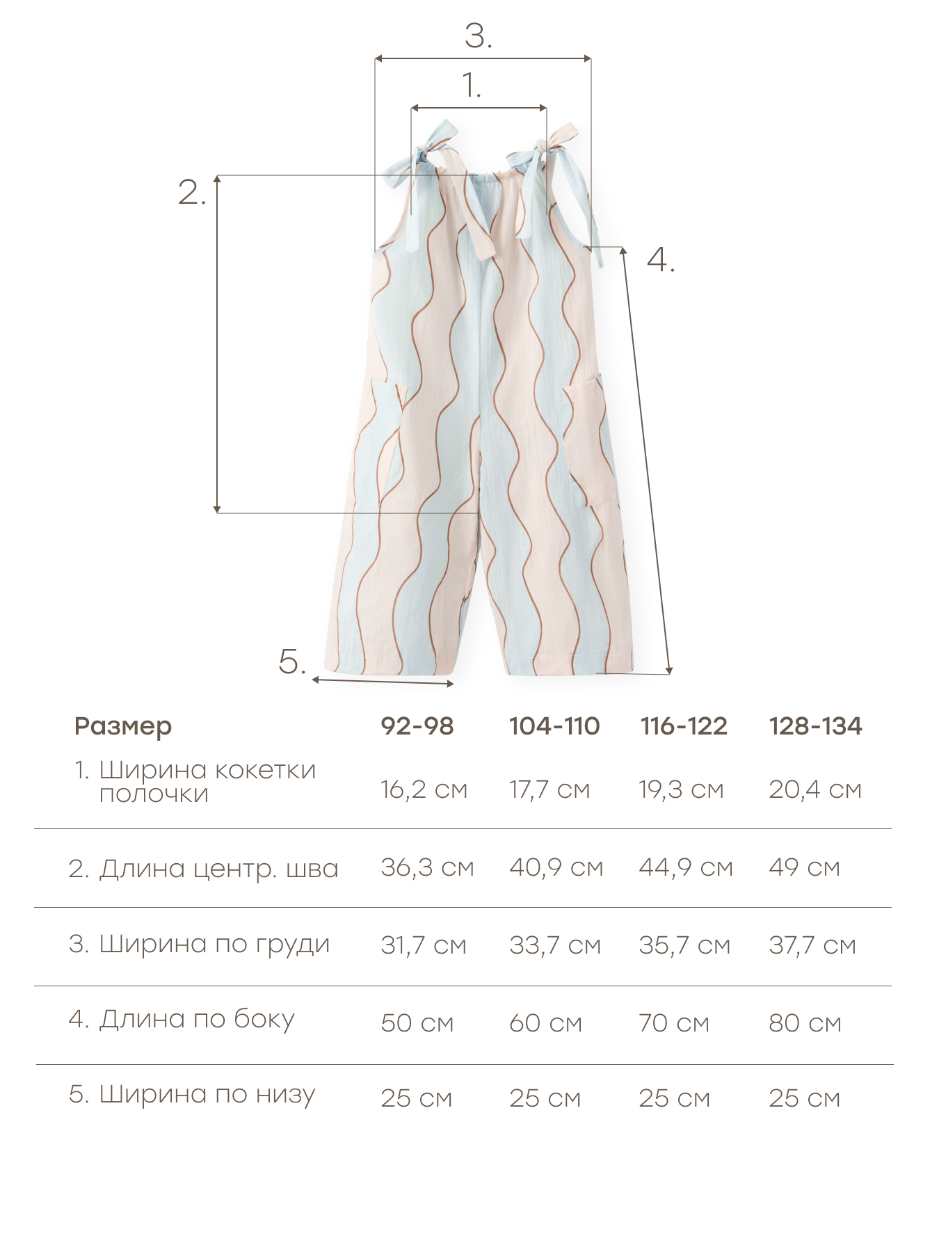 Хлопковый летний комбинезон можно носить как самостоятельный предмет гардероба, так и сочетать с любыми топами. Нежный дизайн создает романтичное настроение, при этом конструкция одежды позволяет смело бегать, лазить, сидеть на песке. Благодаря резинке и завязкам на лямках обеспечивается правильная посадка по фигуре. Натуральный материал, 100% хлопок, идеален для жаркой погоды – защищает от солнца и ветра, дышит, хорошо отводит влагу.