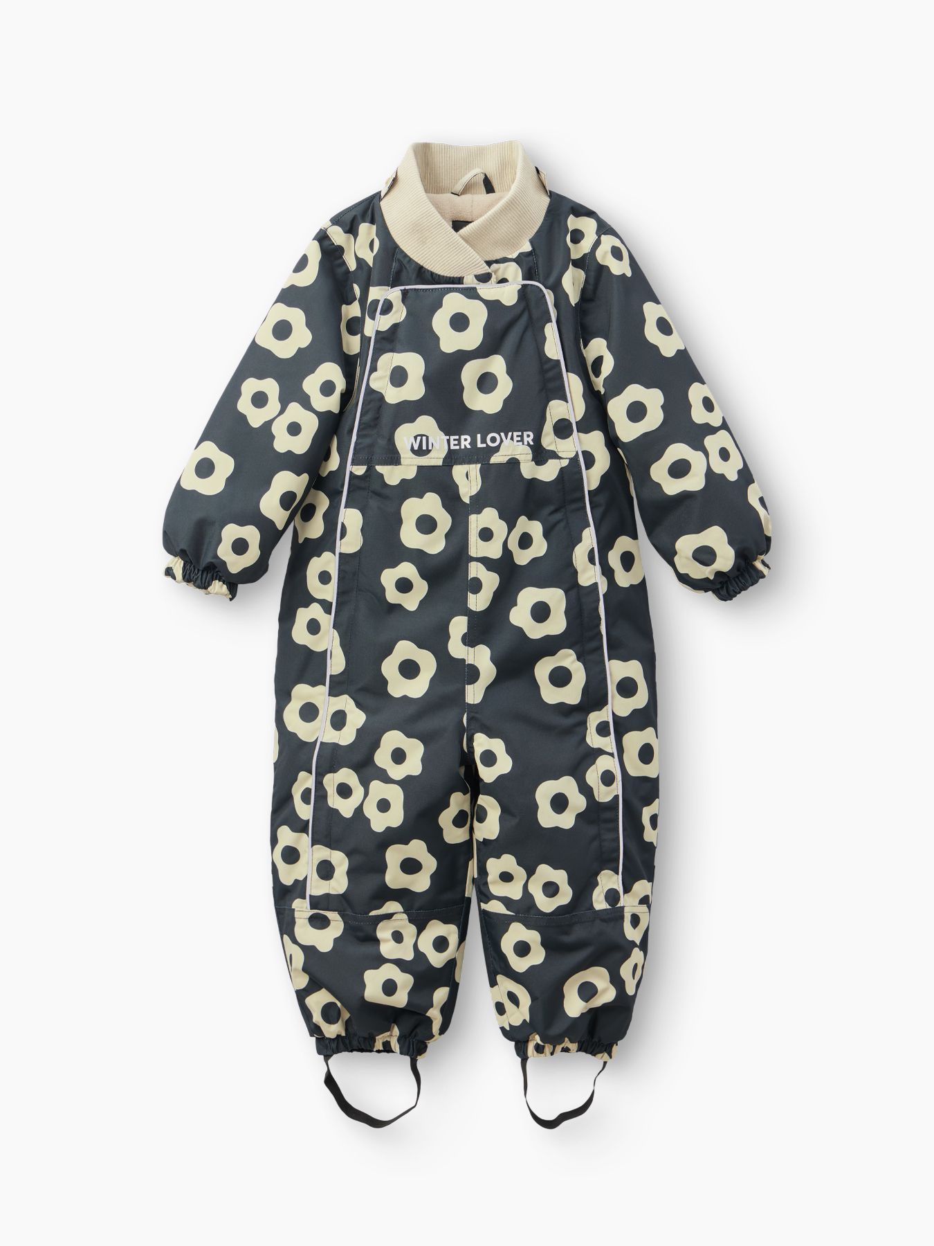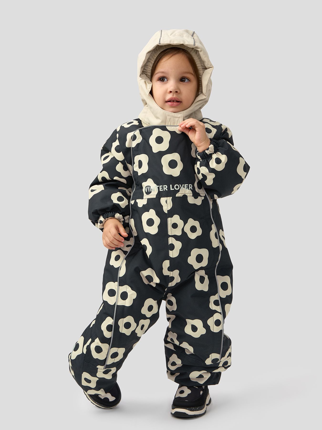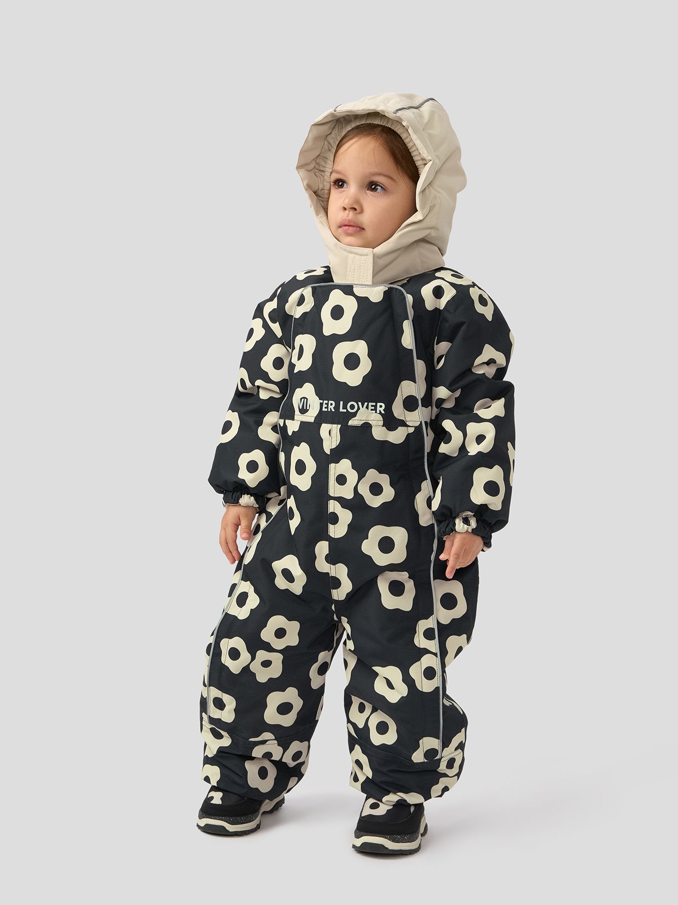 Рукава и штанины дополнены резинками, плотно прилегающими к телу малыша для предотвращения попадания снега внутрь. Материал верха устойчив к загрязнениям и легко очищается, что делает этот зимний костюм практичным выбором как для мальчиков, так и для девочек.