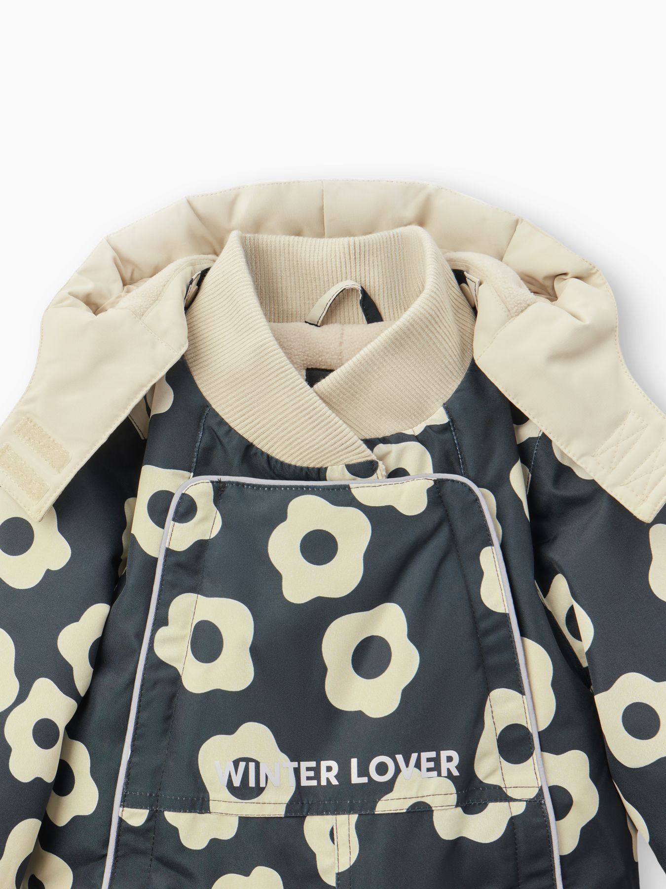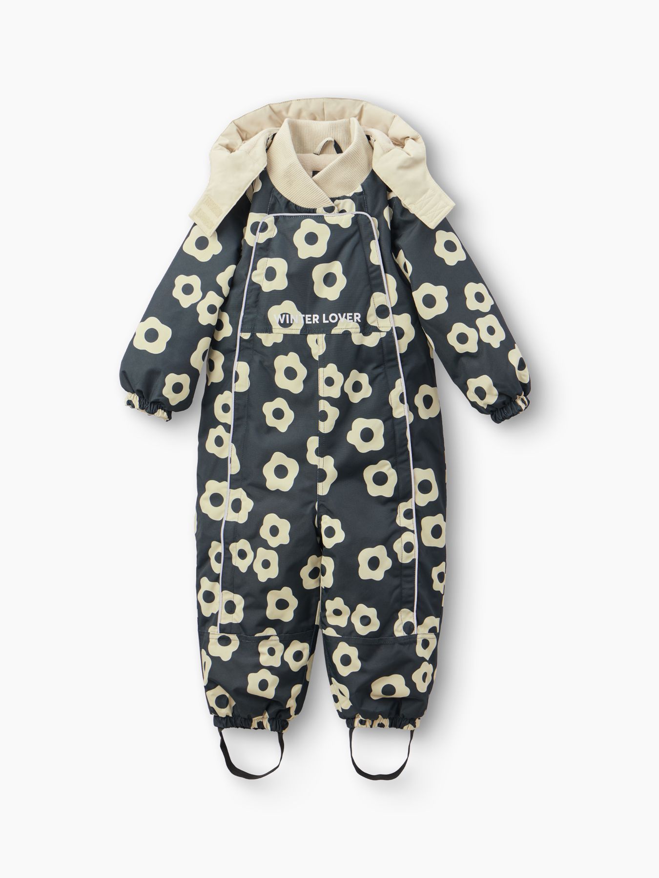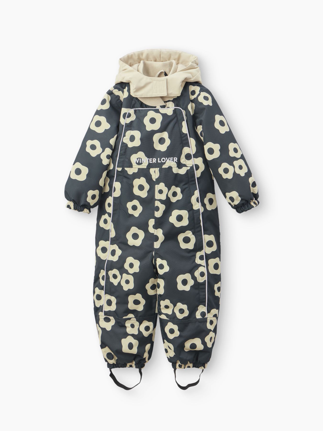 Рукава и штанины дополнены резинками, плотно прилегающими к телу малыша для предотвращения попадания снега внутрь. Материал верха устойчив к загрязнениям и легко очищается, что делает этот зимний костюм практичным выбором как для мальчиков, так и для девочек.