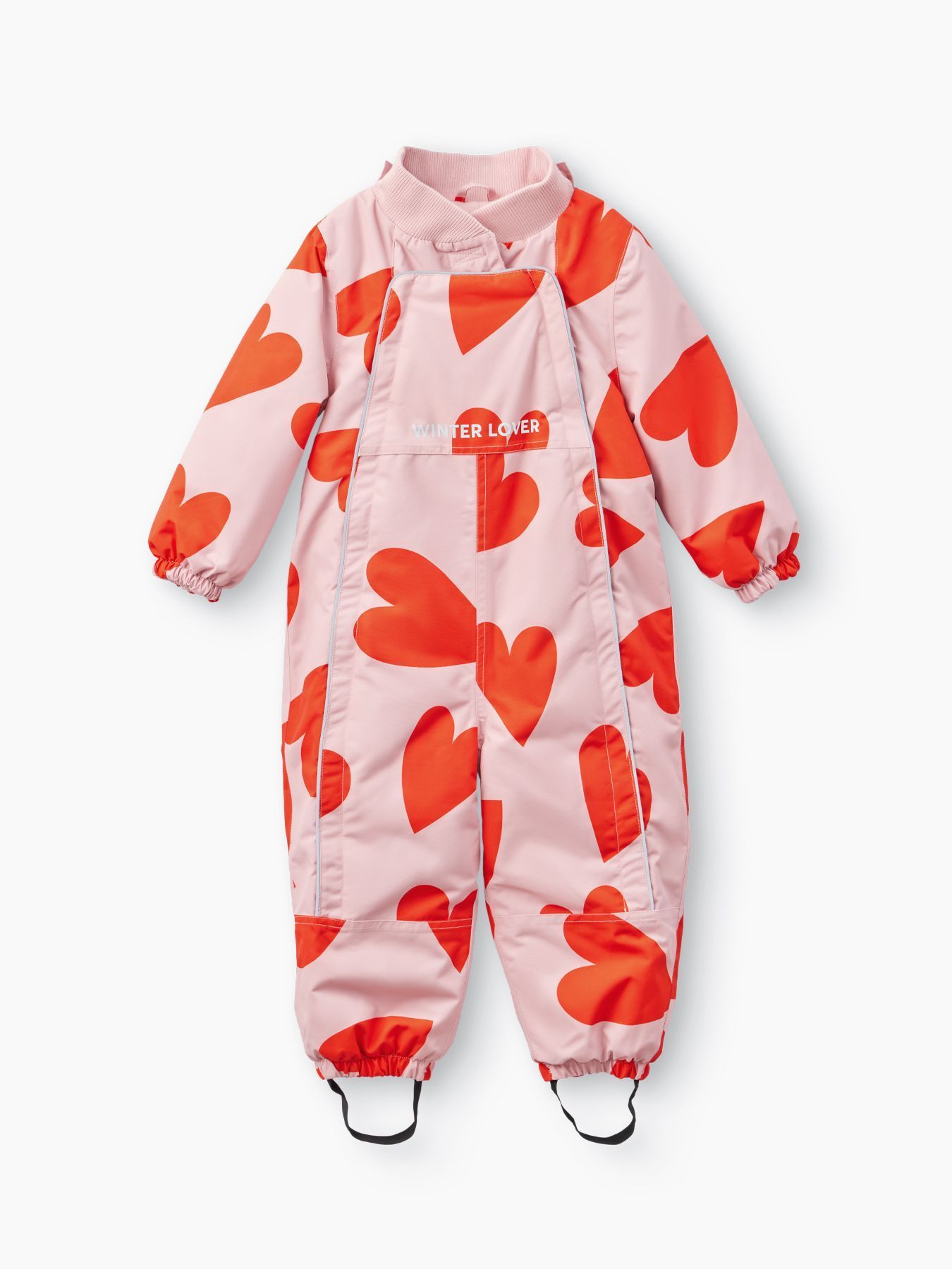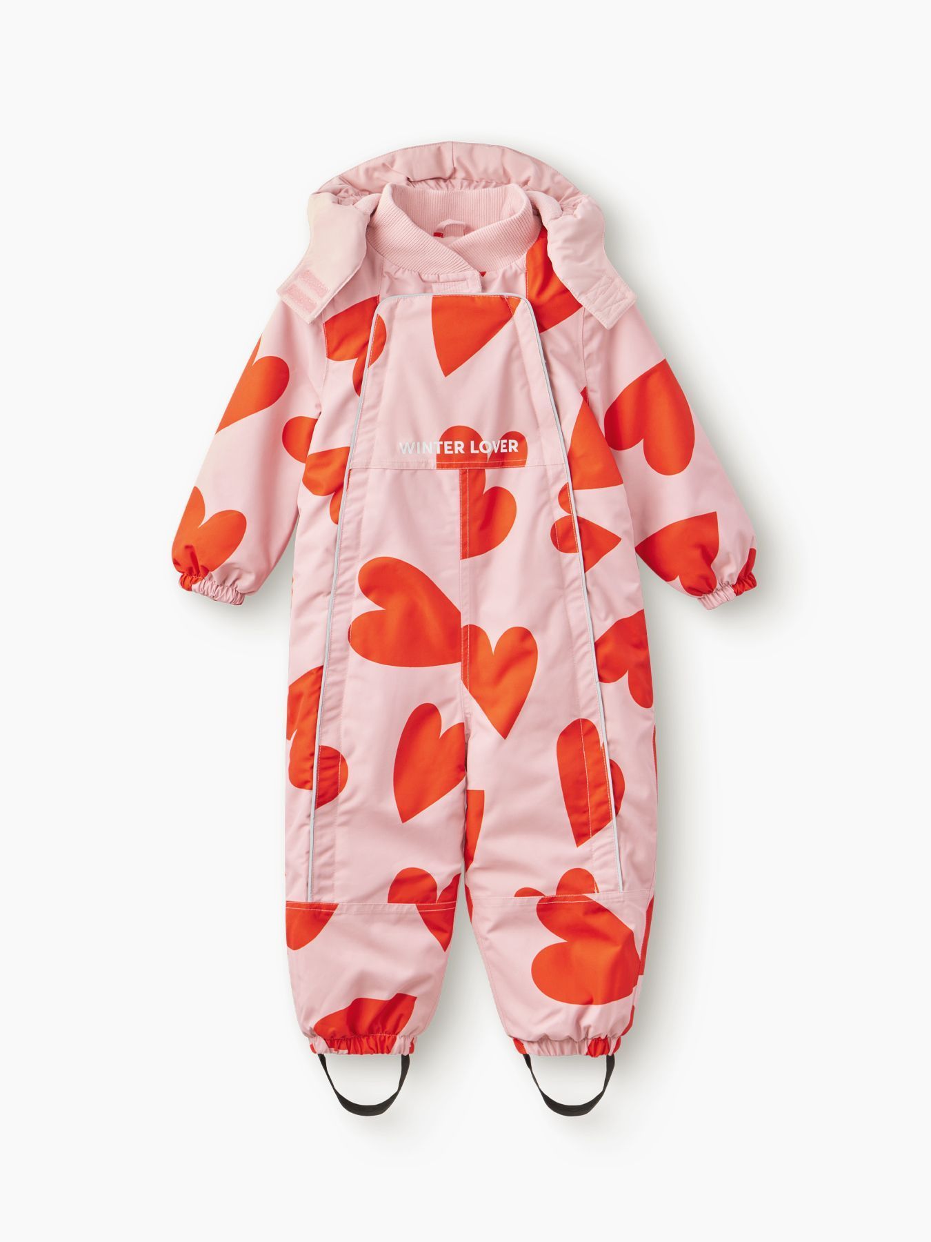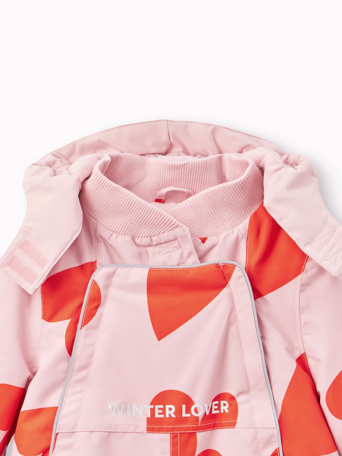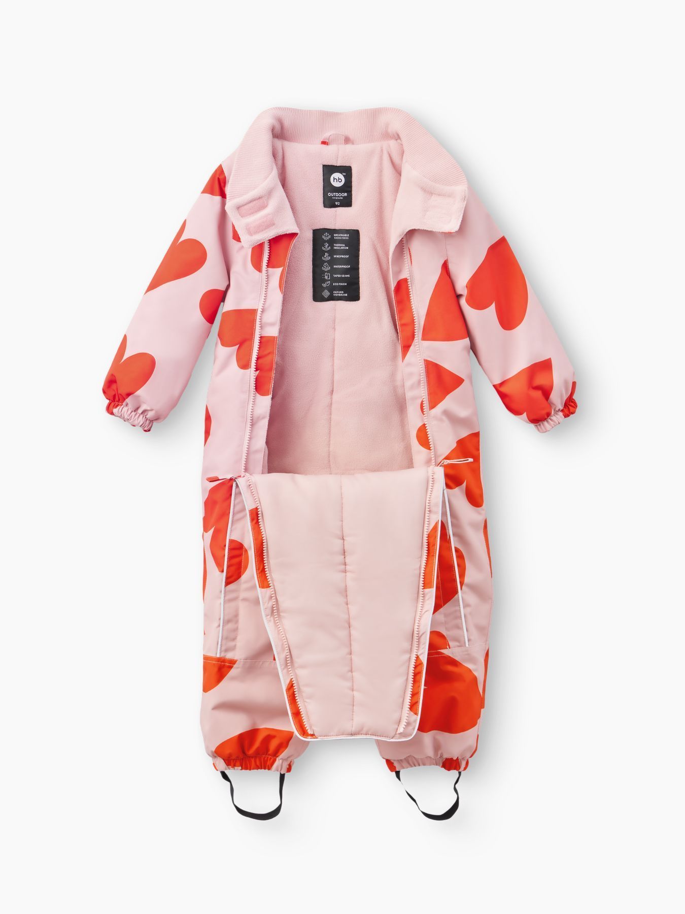 Рукава и штанины дополнены резинками, плотно прилегающими к телу малыша для предотвращения попадания снега внутрь. Материал верха устойчив к загрязнениям и легко очищается, что делает этот зимний костюм практичным выбором как для мальчиков, так и для девочек.