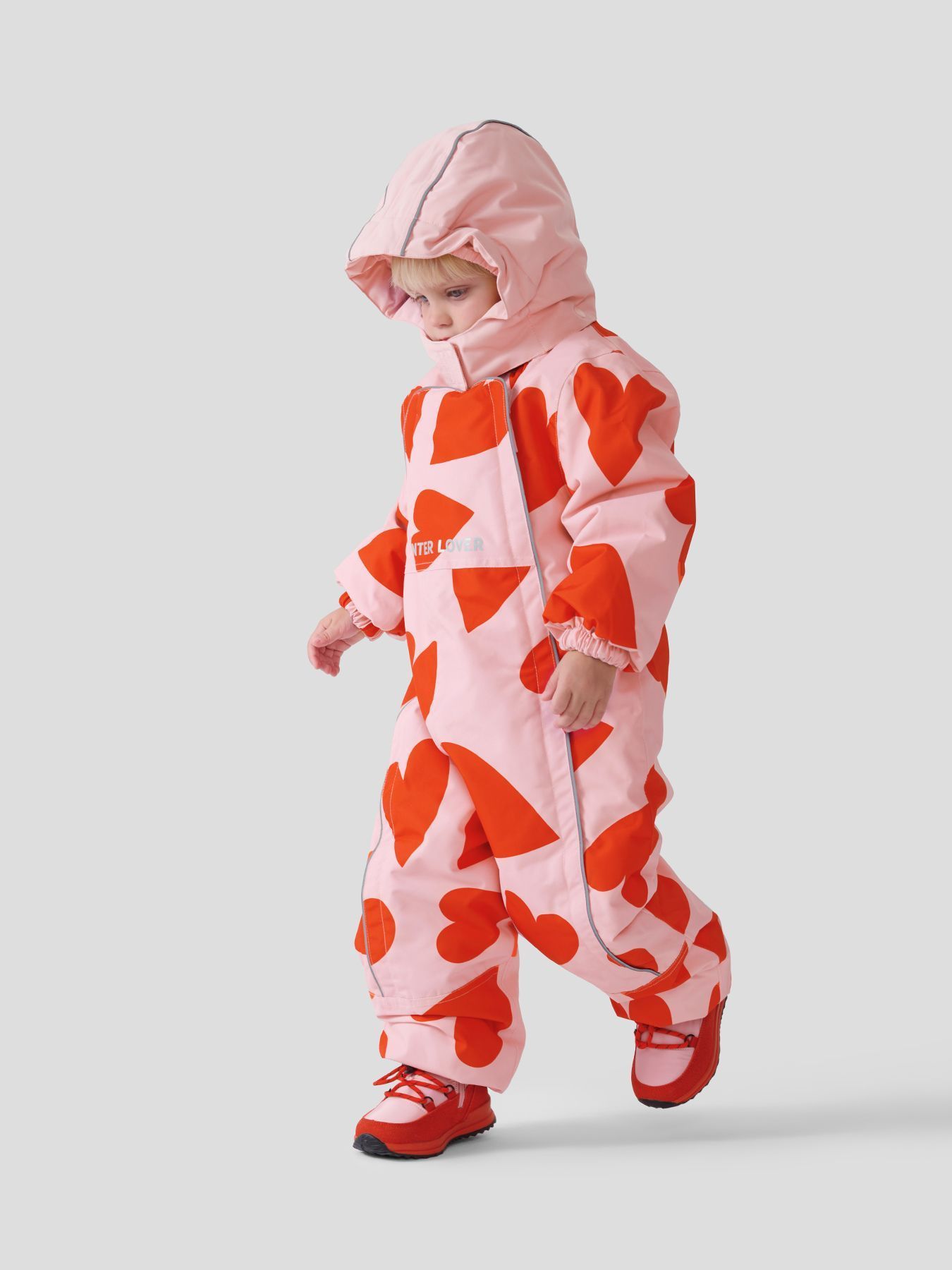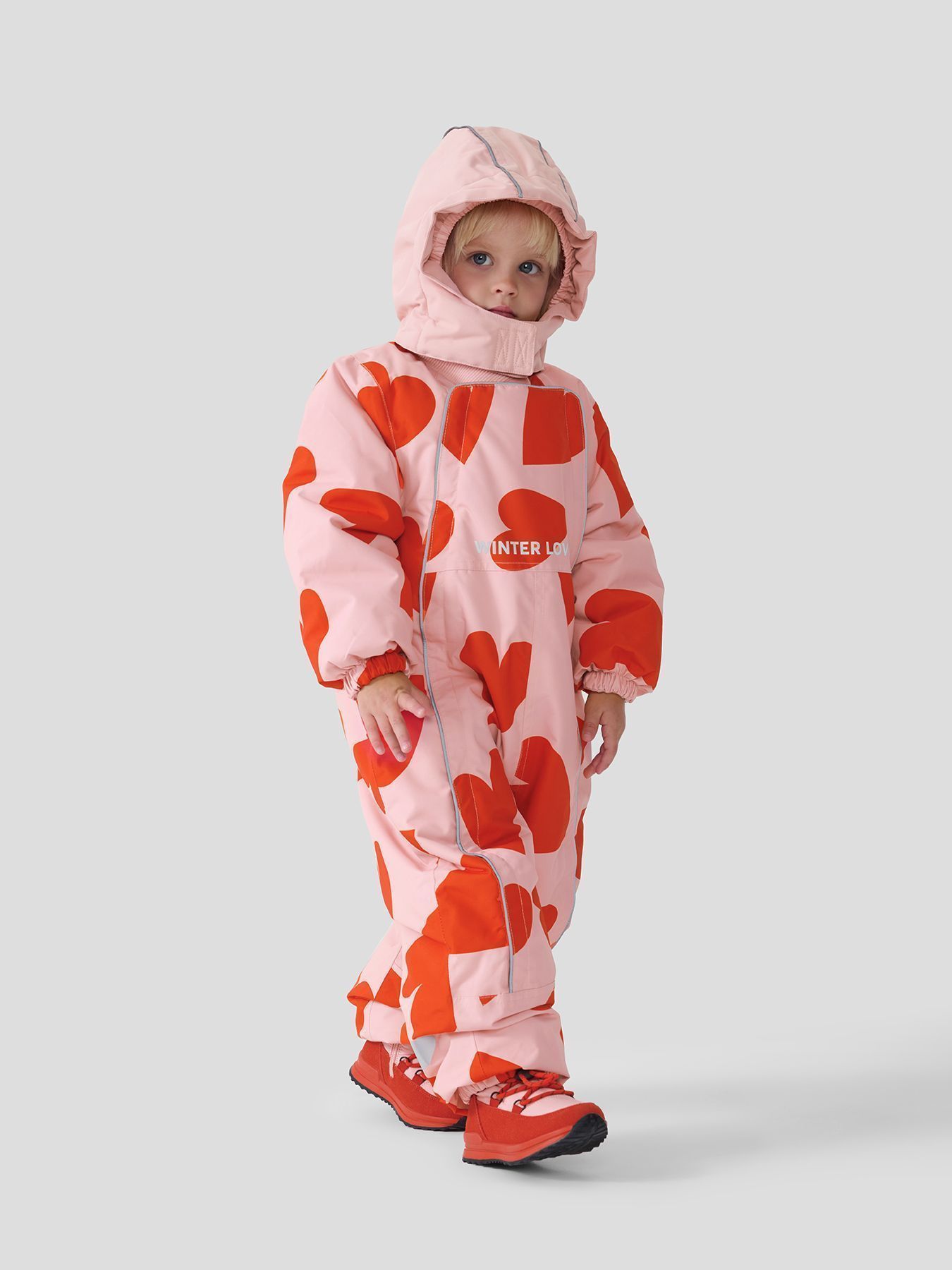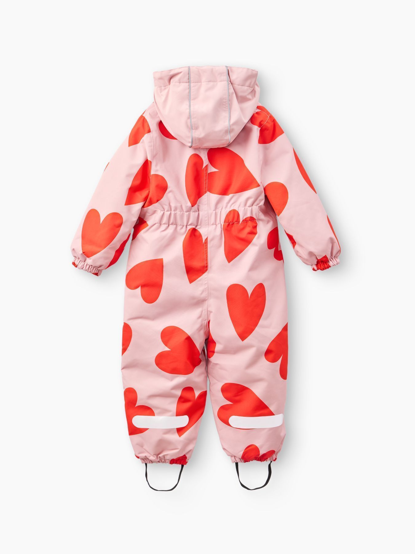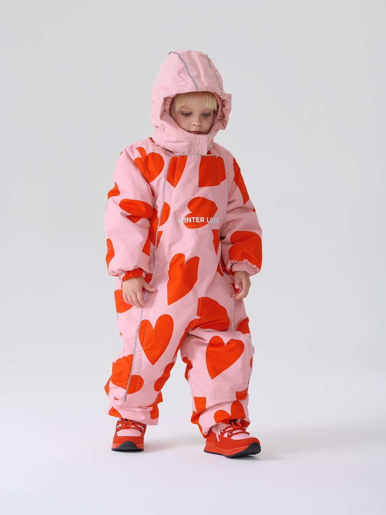 Рукава и штанины дополнены резинками, плотно прилегающими к телу малыша для предотвращения попадания снега внутрь. Материал верха устойчив к загрязнениям и легко очищается, что делает этот зимний костюм практичным выбором как для мальчиков, так и для девочек.