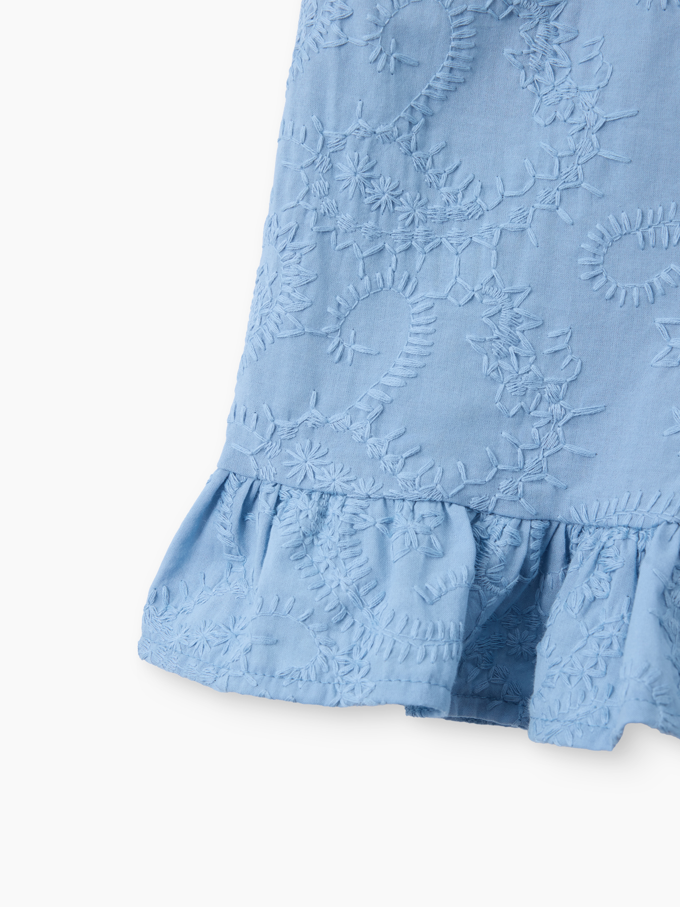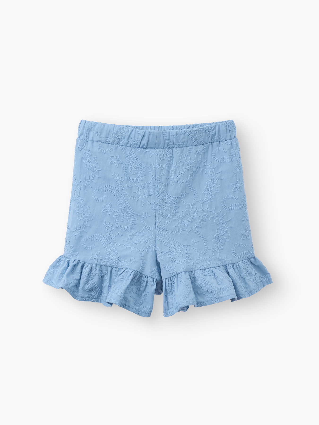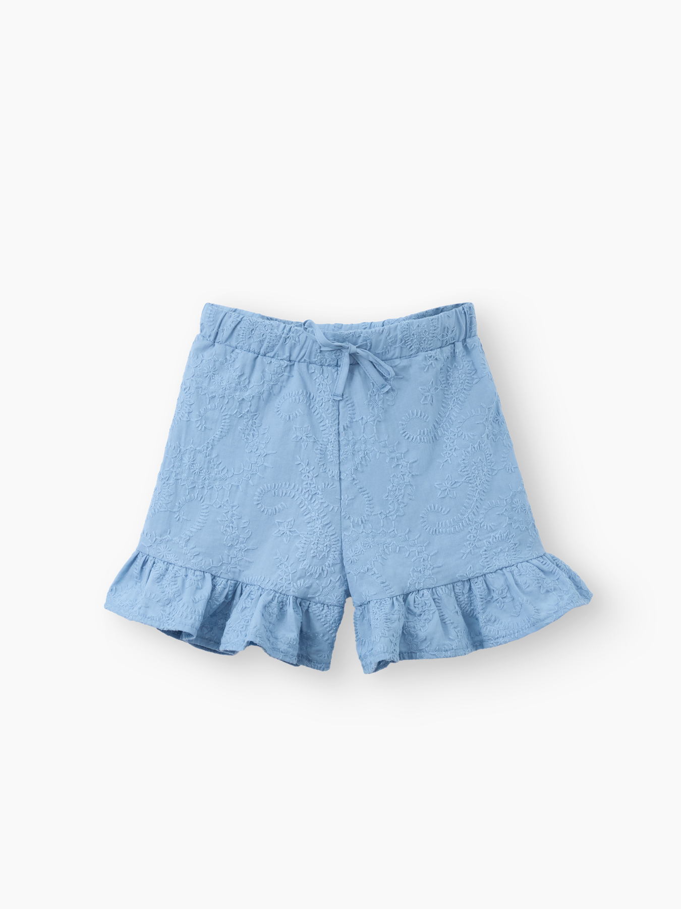 • Ткань с вышивкой и рюши на шортах — добавляют визуальный акцент