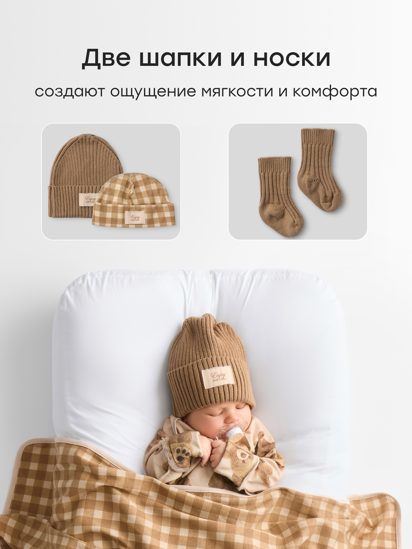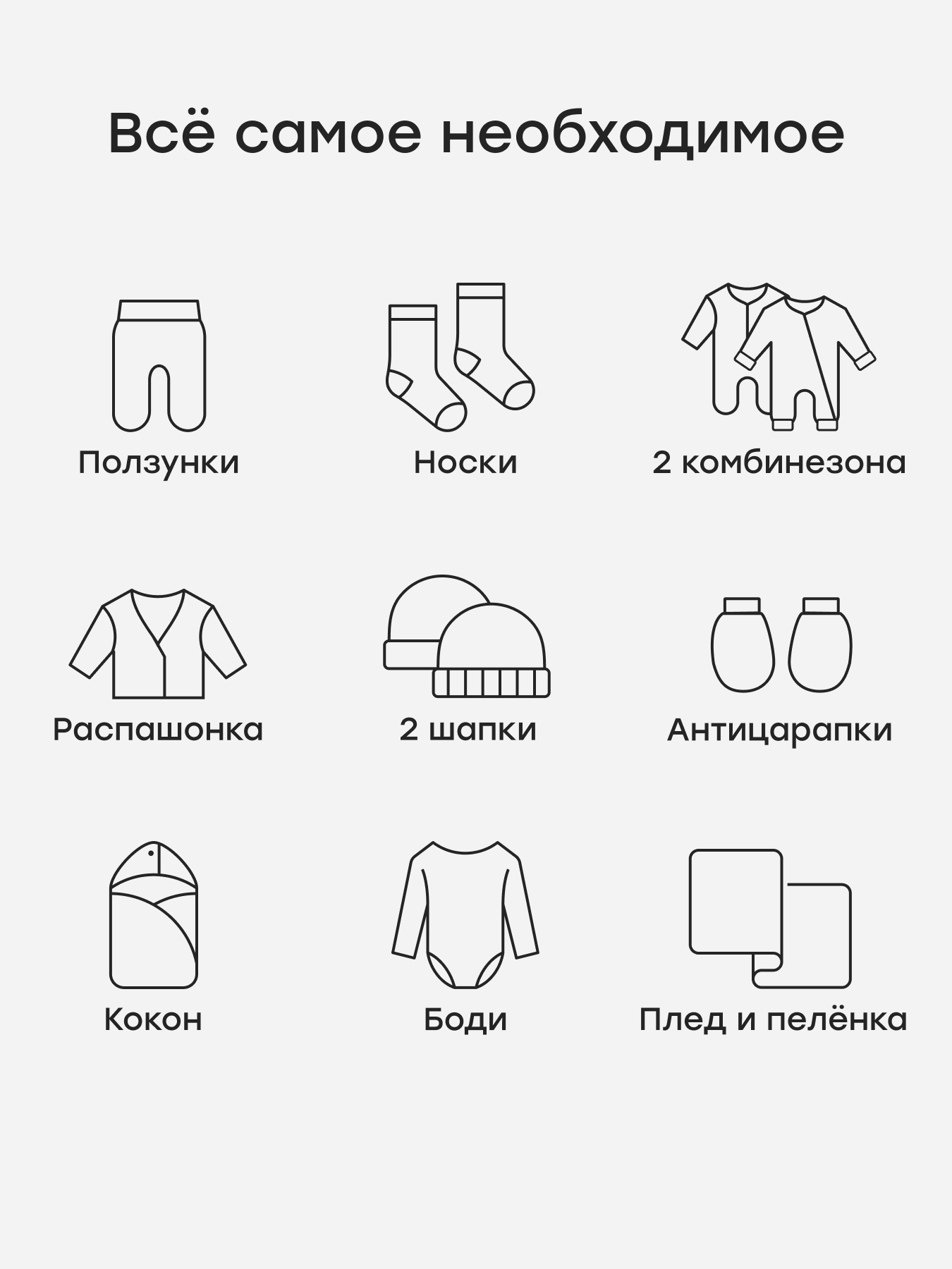 Состав комплекта2 комбинезона-слипа с антицарапками — c открытыми и закрытыми ножками, 2 шапочки — вязанная и трикотажная, боди на кнопках, распашонка на липучках, ползунки, 1 пара антицарапок, 1 пара вязаных носков, 1 пеленка-кокон, 1 вязаный плед, 1 пеленка