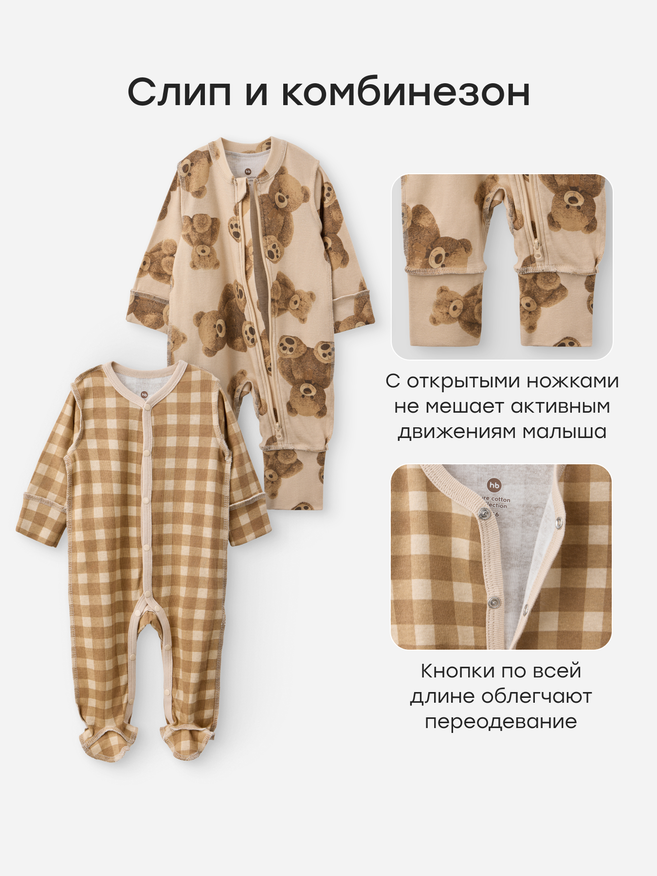 • Удобные застежки по всей длине — молнии, липучки и кнопки дают быстрый доступ к подгузнику, упрощая процесс переодевания