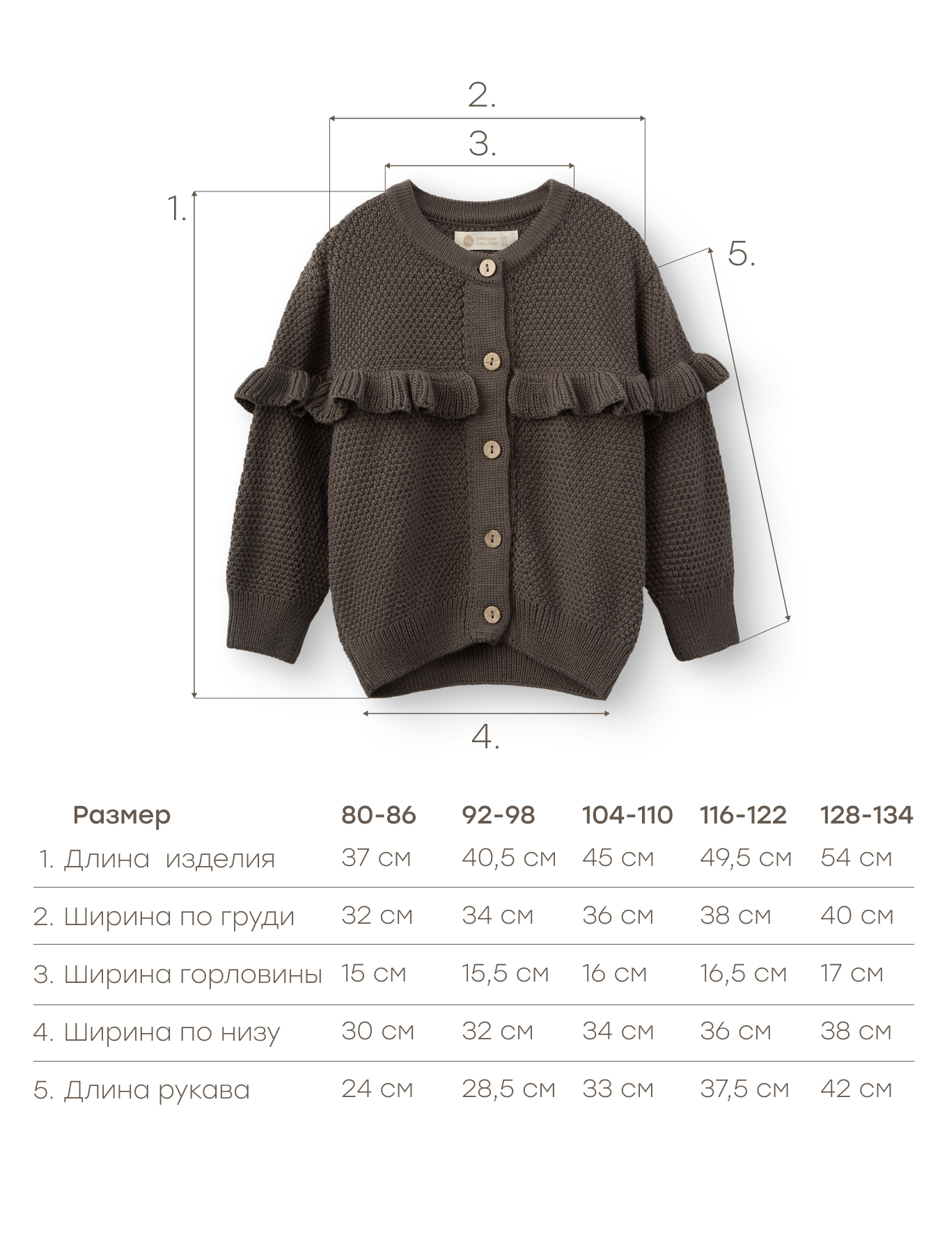Стильный и практичный детский комплект, состоящий из кардигана и брюк, станет универсальным решением для прогулок, встреч и повседневных образов. Изготовлен из приятного на ощупь смесового материала (50% хлопок, 50% акриловое волокно), который обеспечивает мягкость, тепло и комфорт. Кардиган украшен нежными оборками и крупными пуговицами, добавляющими очарования, а брюки с эластичным поясом обеспечивают свободу движений.