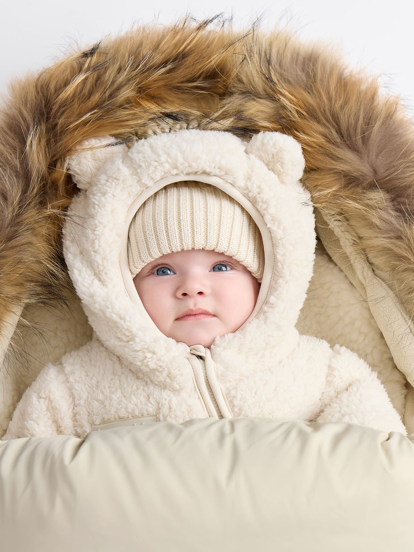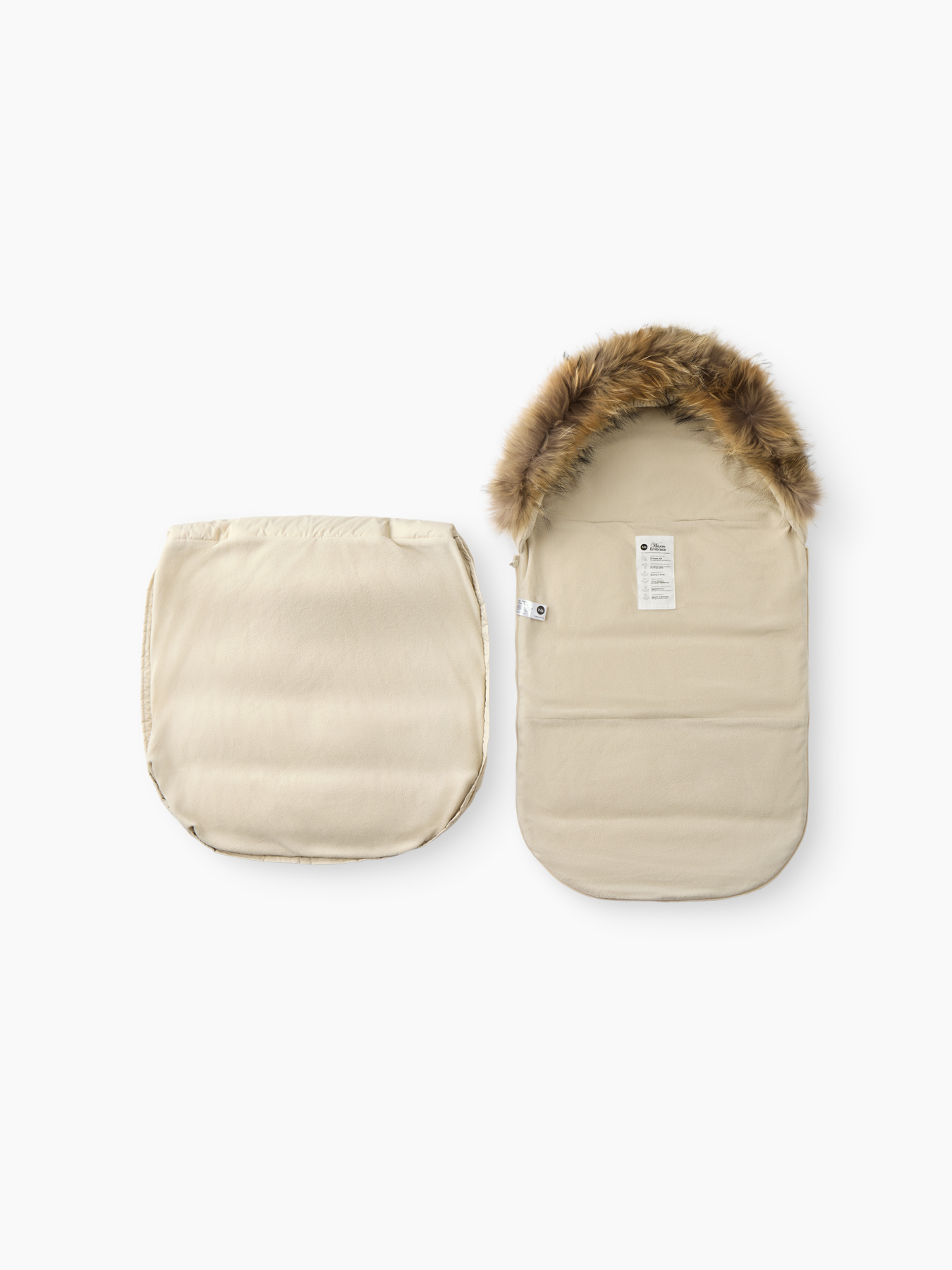• Съёмный меховой вкладыш — регулирует уровень утепления: добавьте его в мороз или уберите в более тёплую погоду. Вкладыш универсален и подходит для использования в коляске, санях и автокресле.