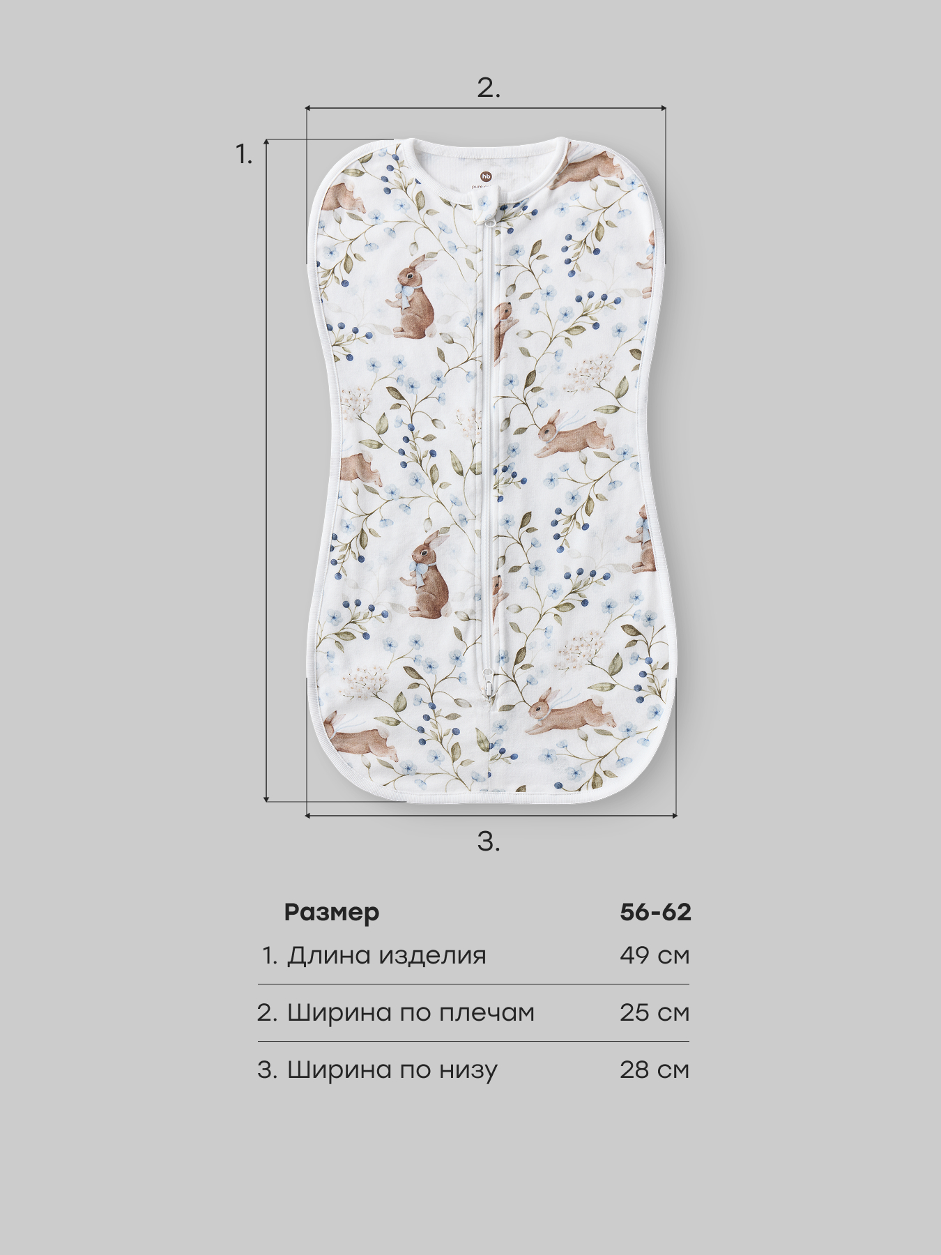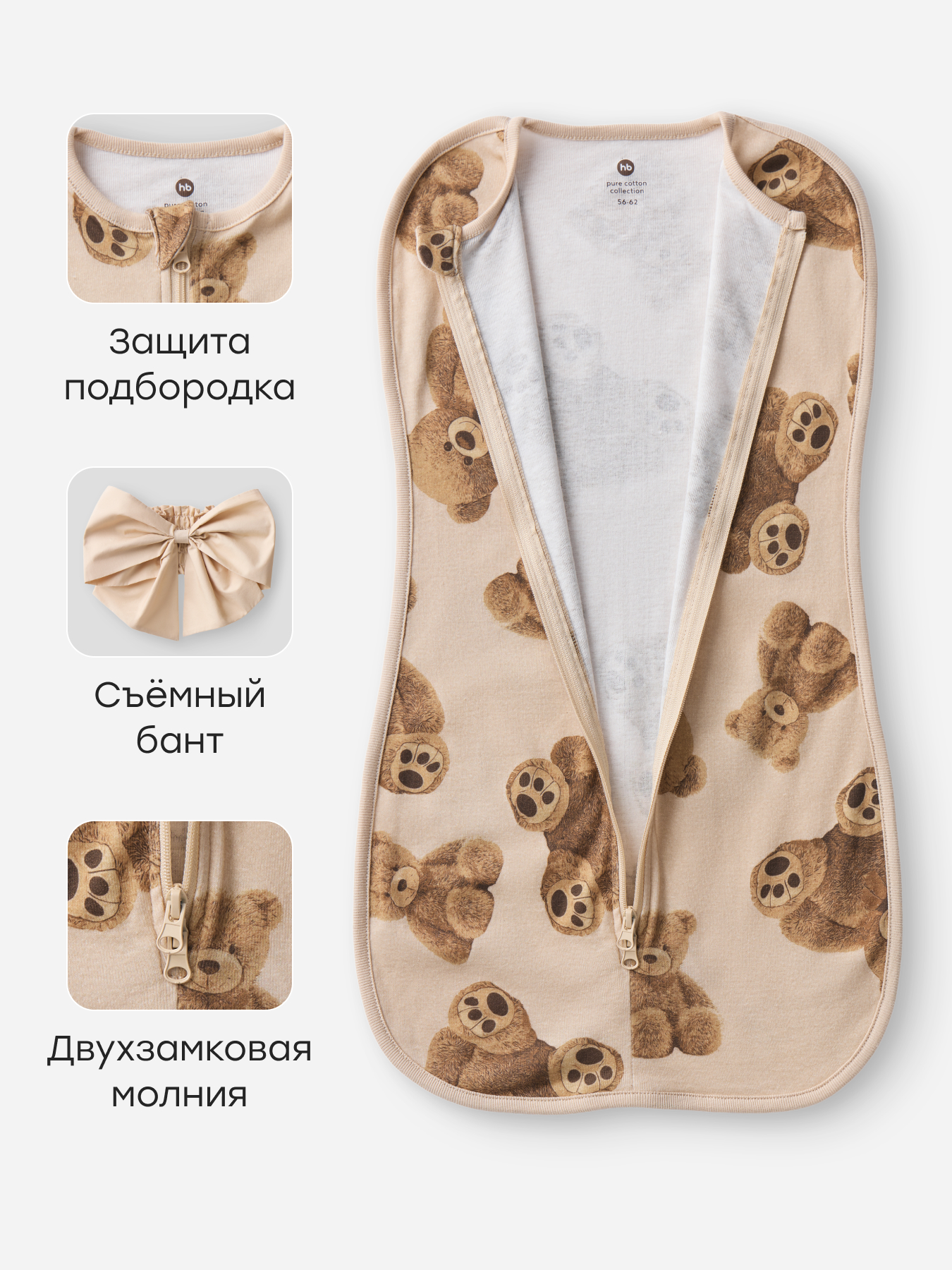 • Двойная молния — пеленка-кокон на молнии с двумя бегунками позволяет быстро и легко переодеть малыша или сменить подгузник, не тревожа его сон