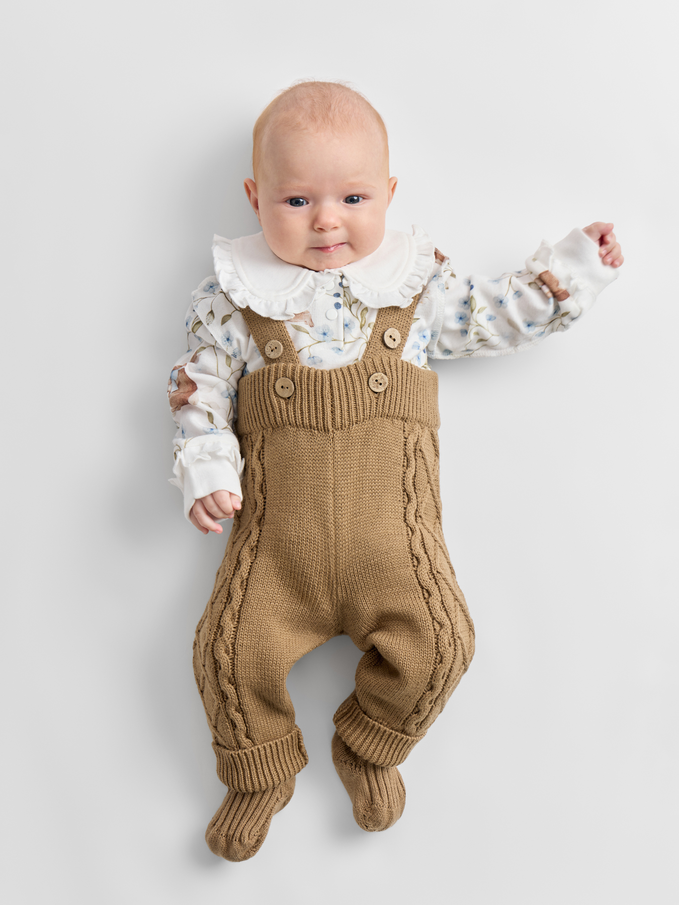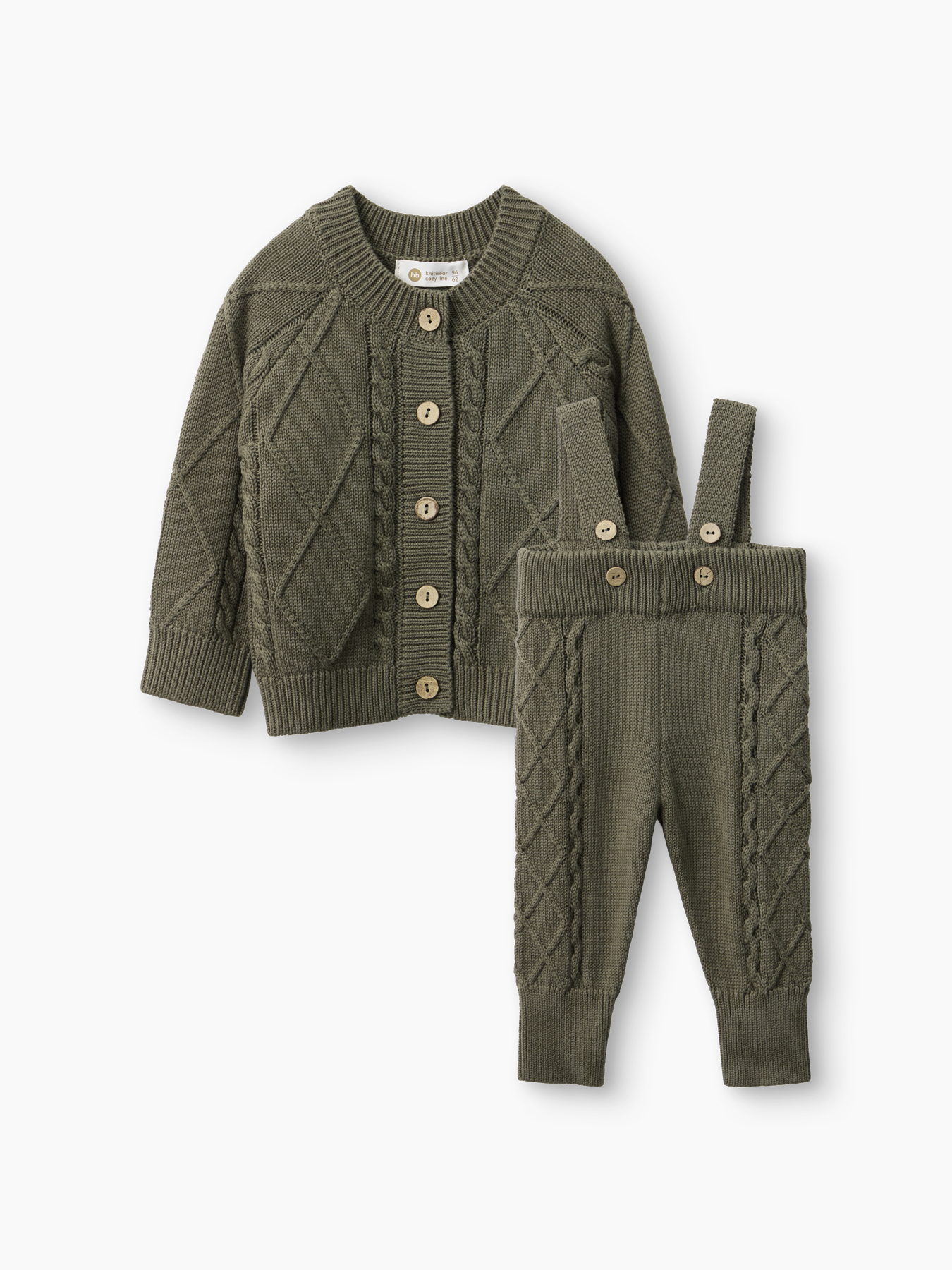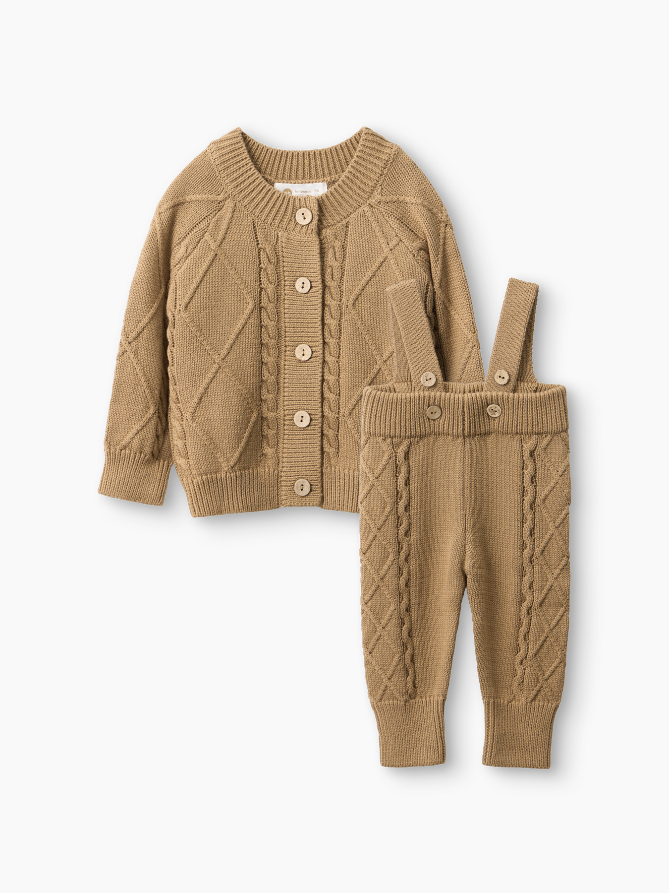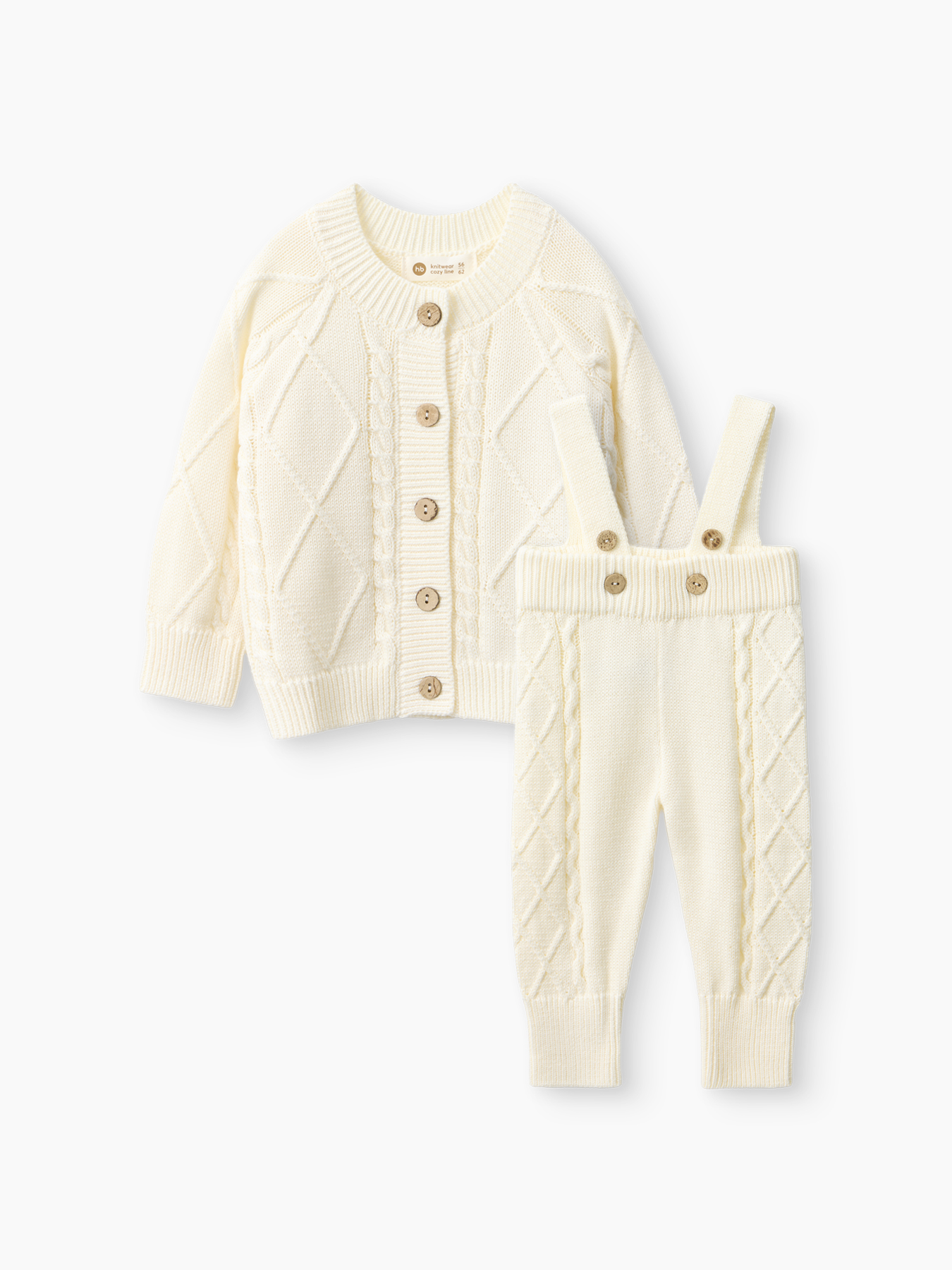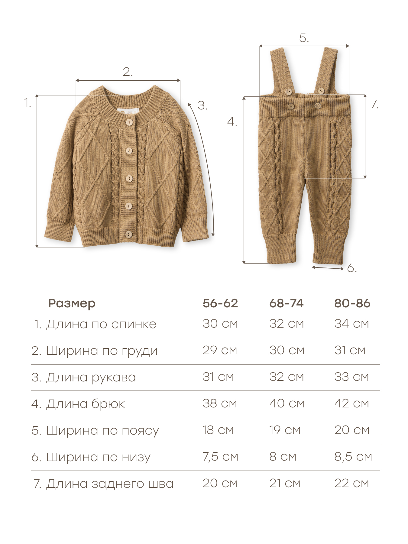 Костюм для новорожденных — практичное решение для повседневных прогулок или ежедневной носки в любое время года. Вязаный костюм двойка: полукомбинезон и кардиган отличается стильными расцветками и комфортной посадкой, подходит для мальчиков и девочек.