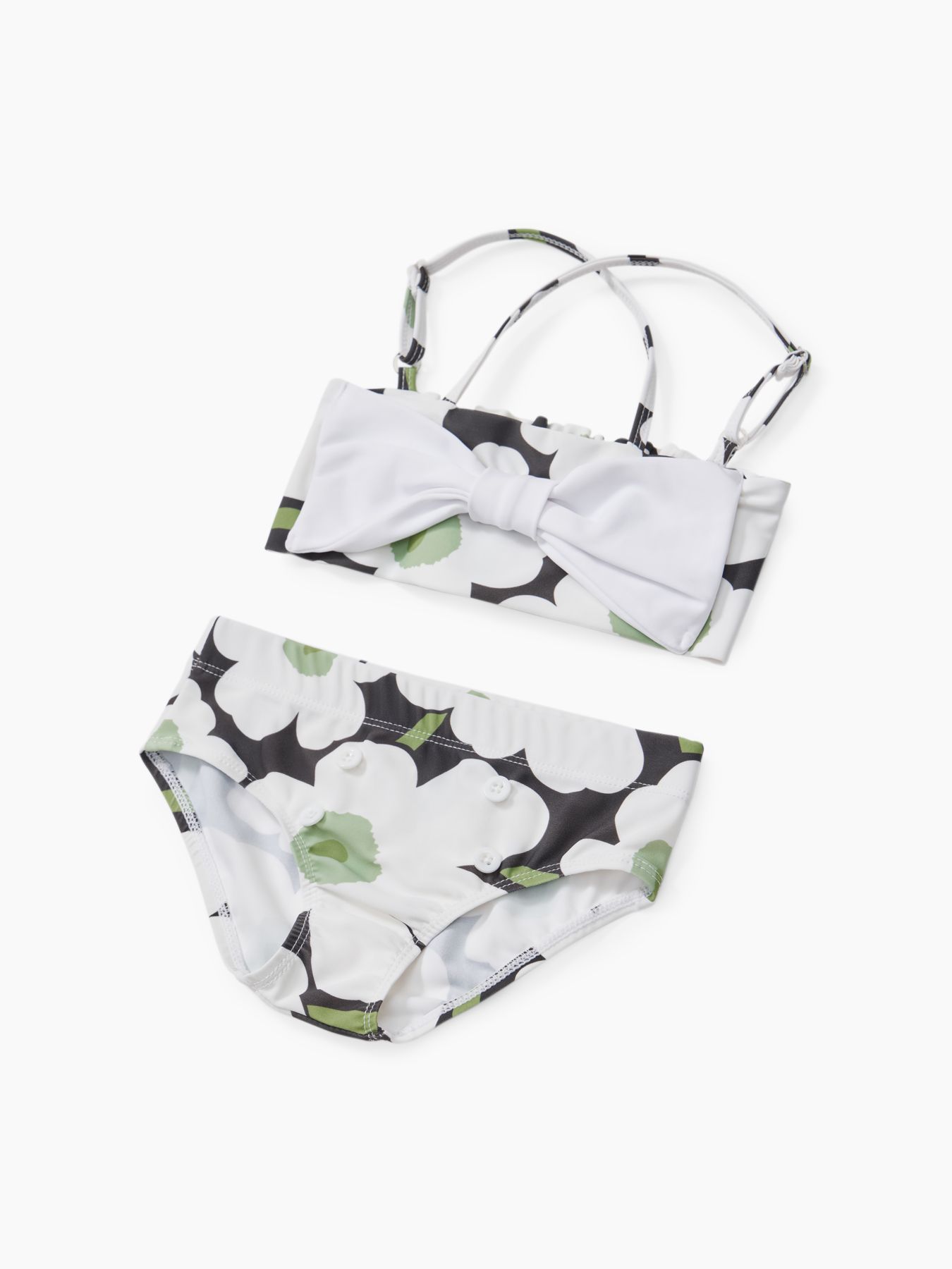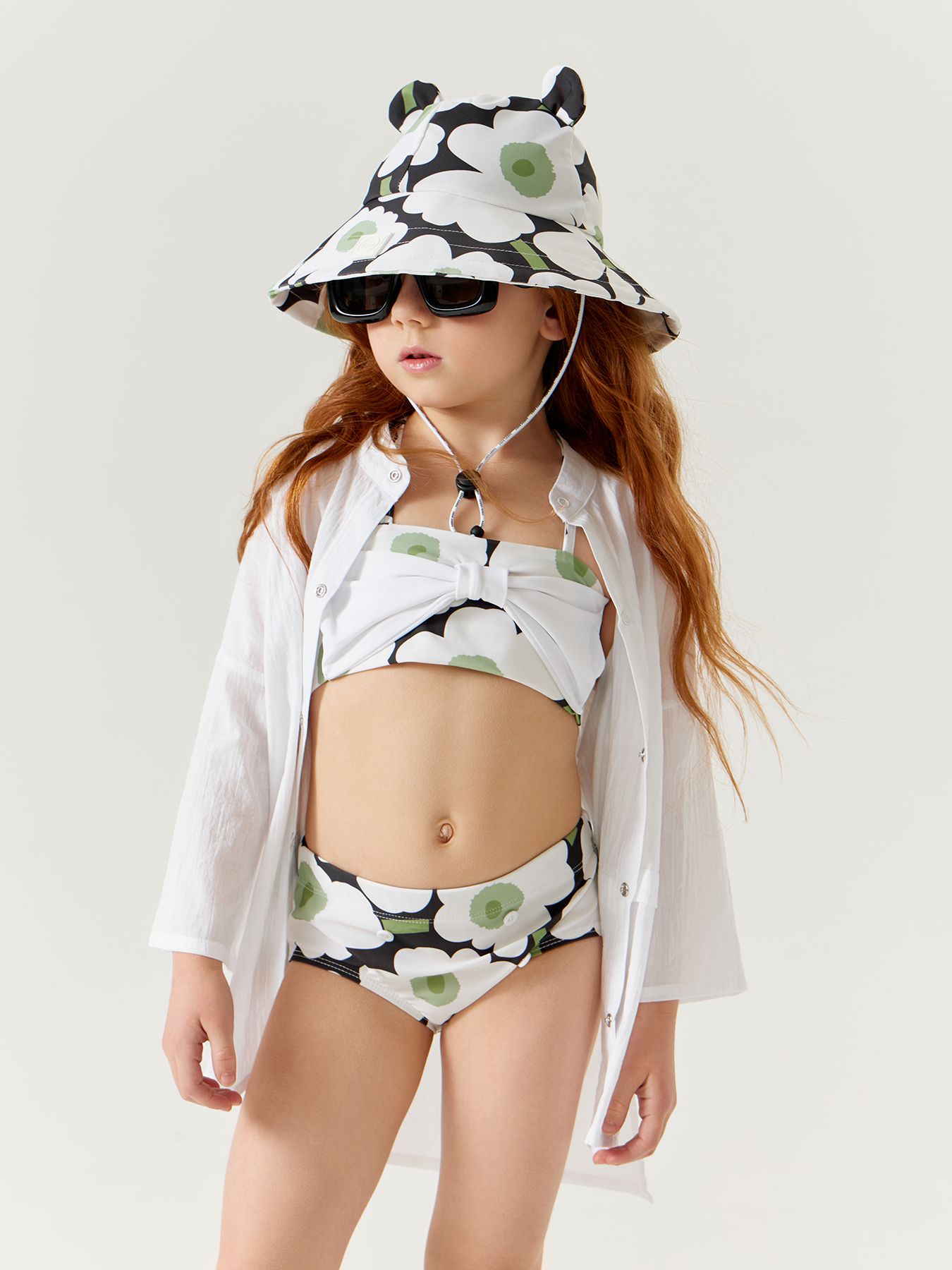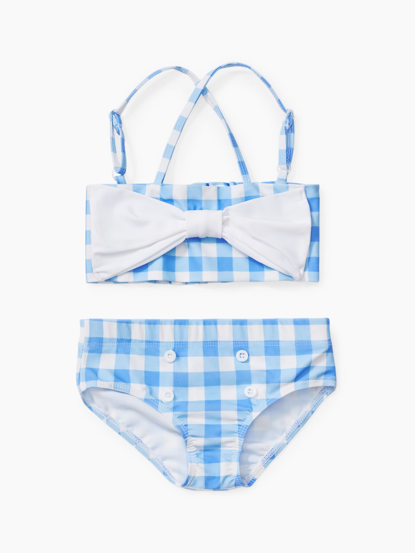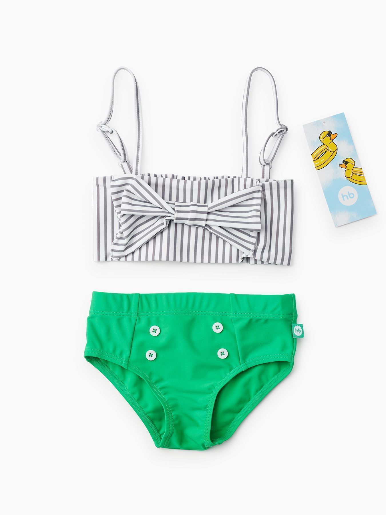 Раздельный купальник в стиле ретро удобен для игр в воде и на суше. Лекало топа обеспечивает правильную посадку и надёжную фиксацию – топ не съезжает и не задирается. Стильные плавки оснащены мягкими резиночками, которые надежно фиксируют купальник и не пережимают нежную детскую кожу. Практичный быстросохнущий материал обладает свойством блокировки ультрафиолета с фактором UPF 50+, что означает наивысшую степень защиты. Актуальный дизайн сделает образ милым, а летние фотографии яркими.