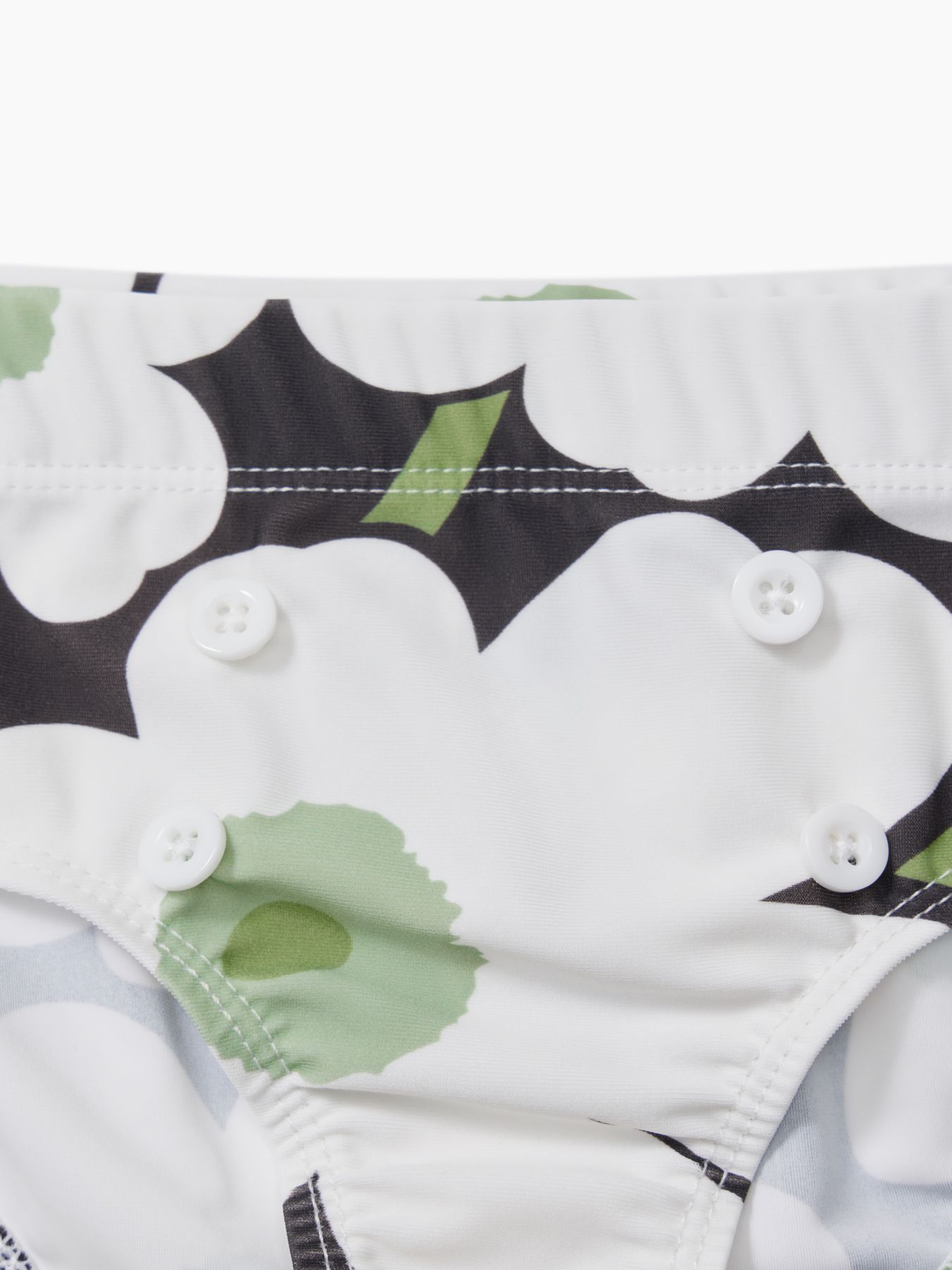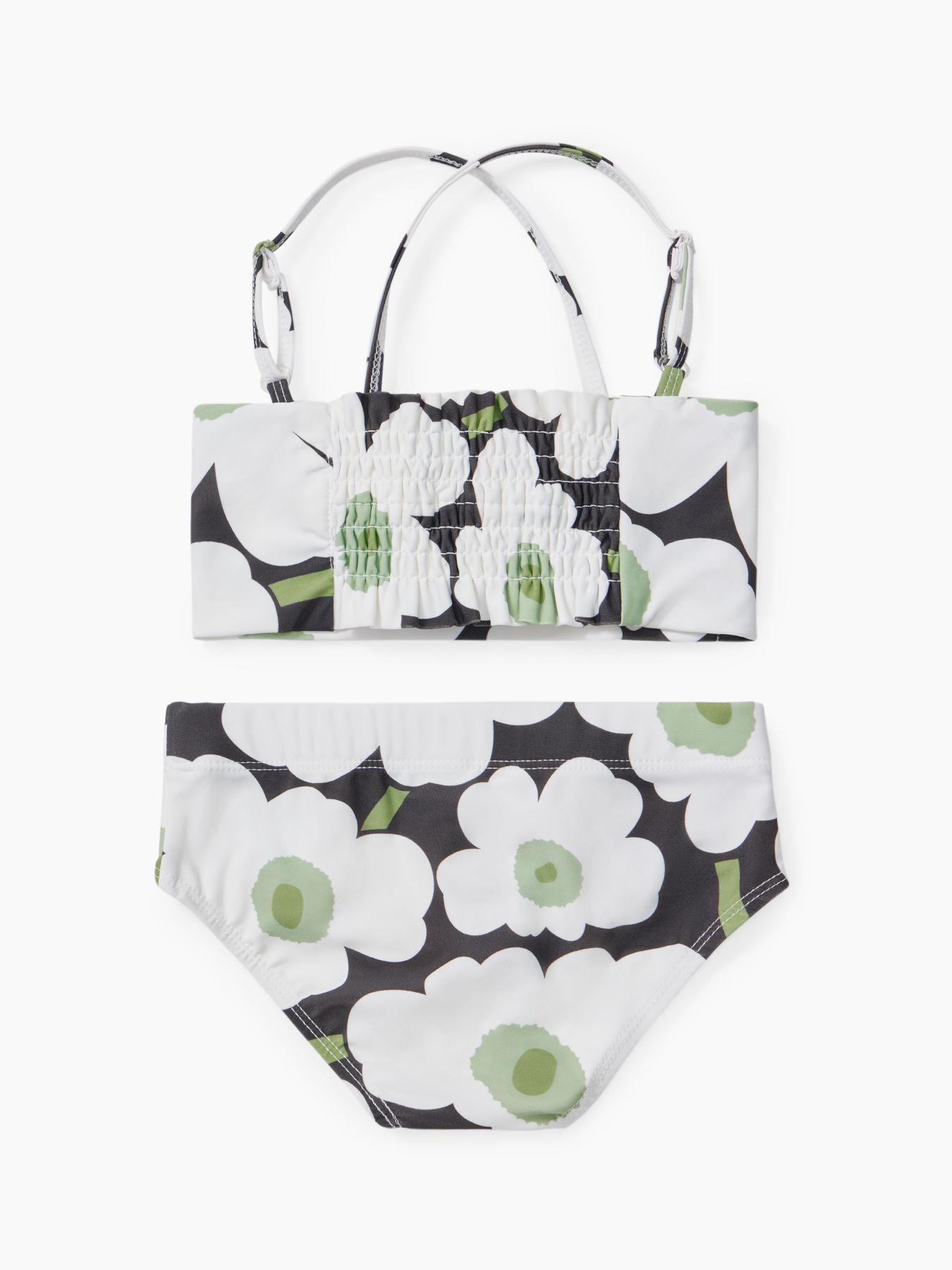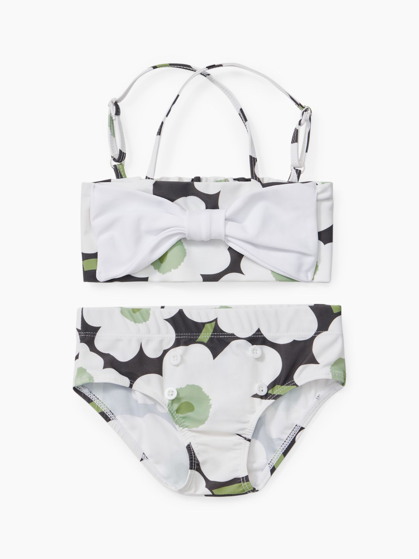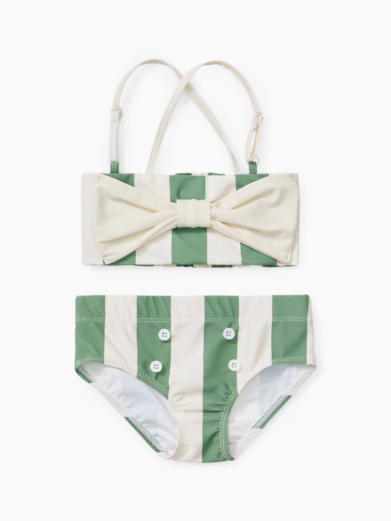 Раздельный купальник в стиле ретро удобен для игр в воде и на суше. Лекало топа обеспечивает правильную посадку и надёжную фиксацию – топ не съезжает и не задирается. Стильные плавки оснащены мягкими резиночками, которые надежно фиксируют купальник и не пережимают нежную детскую кожу. Практичный быстросохнущий материал обладает свойством блокировки ультрафиолета с фактором UPF 50+, что означает наивысшую степень защиты. Актуальный дизайн сделает образ милым, а летние фотографии яркими.