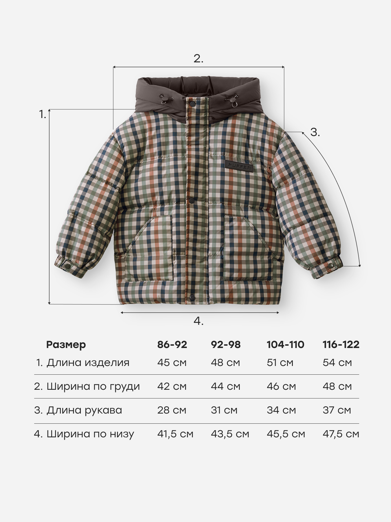 • Свободный крой — пуховик не ограничивает движения ребёнка, а внутренние лямки позволяют удобно носить куртку в помещении, не снимая её полностью