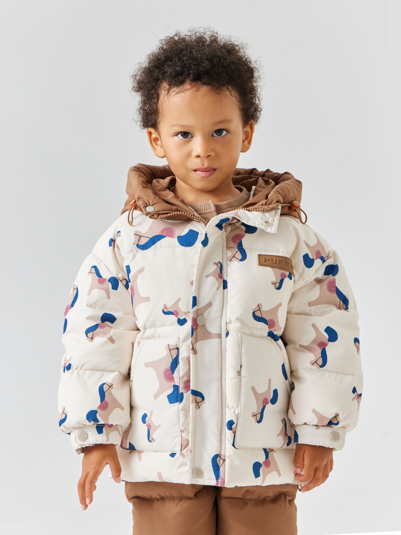 • Свободный крой — пуховик не ограничивает движения ребёнка, а внутренние лямки позволяют удобно носить куртку в помещении, не снимая её полностью