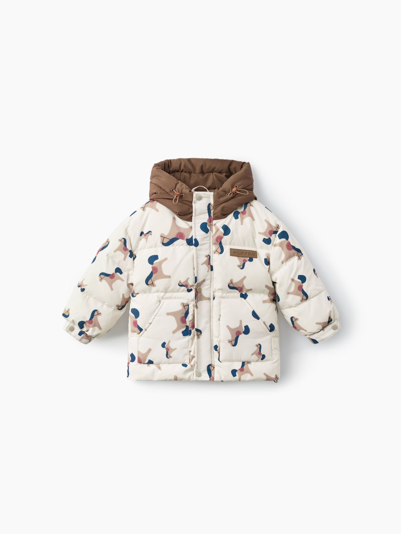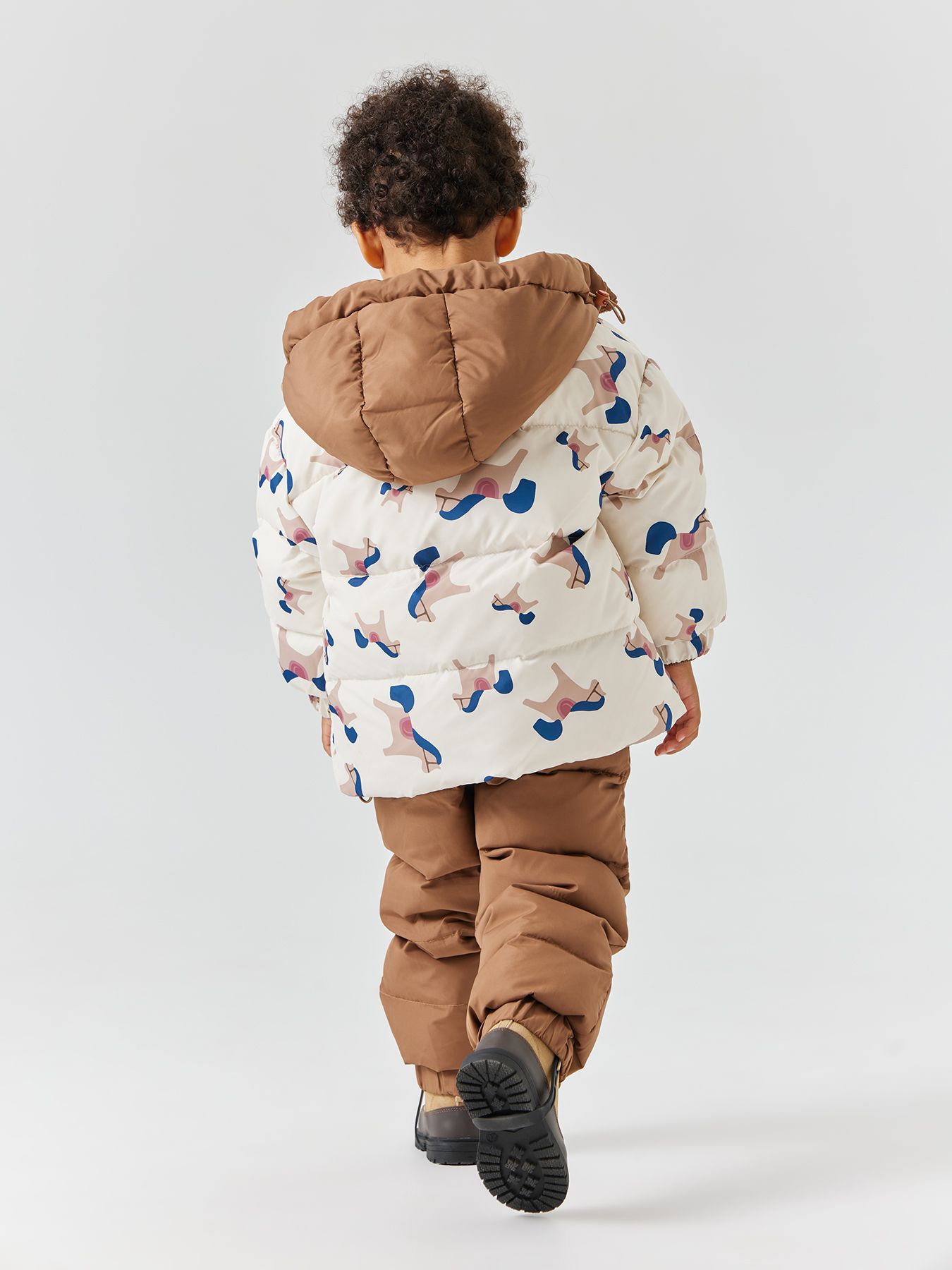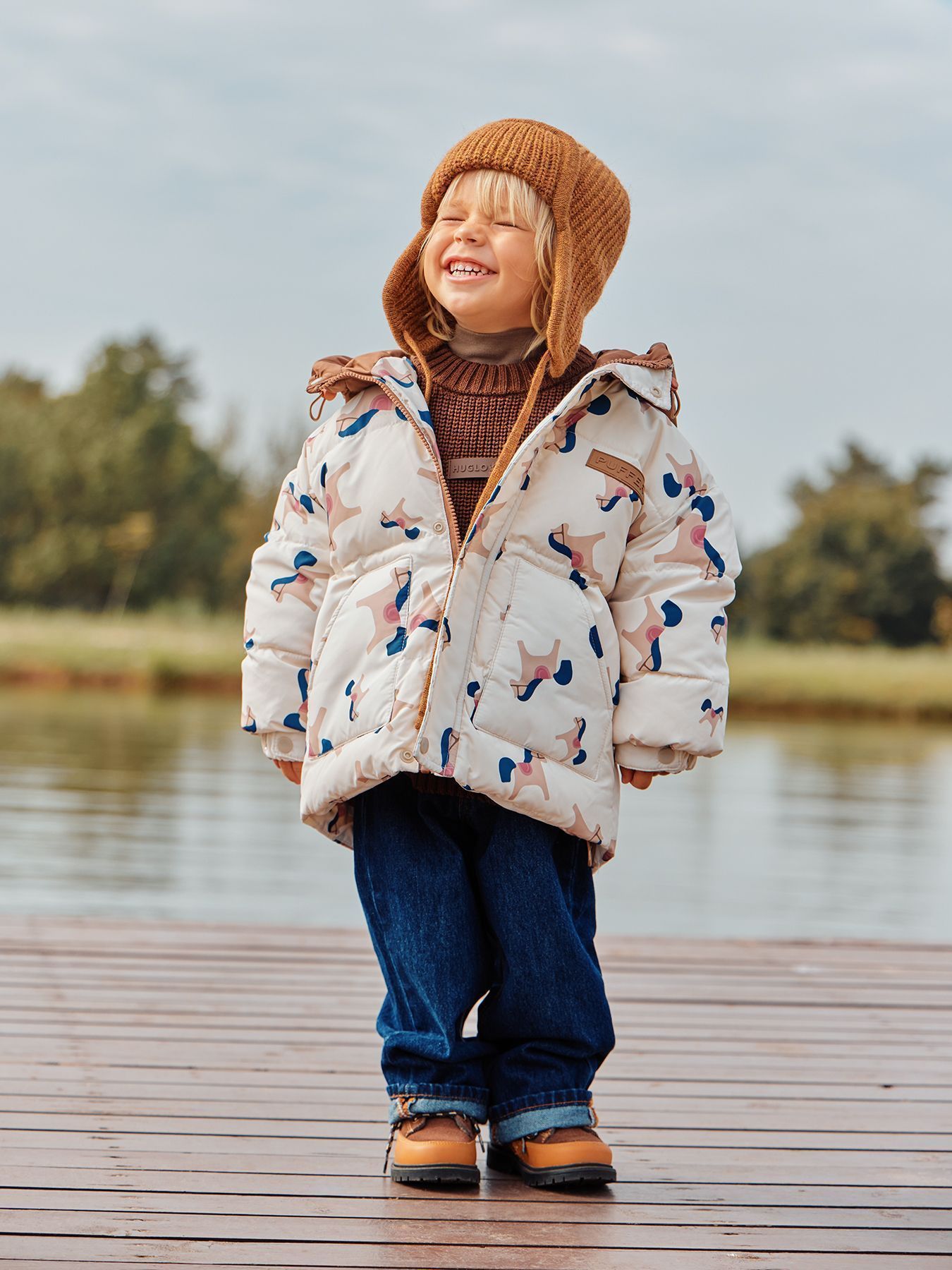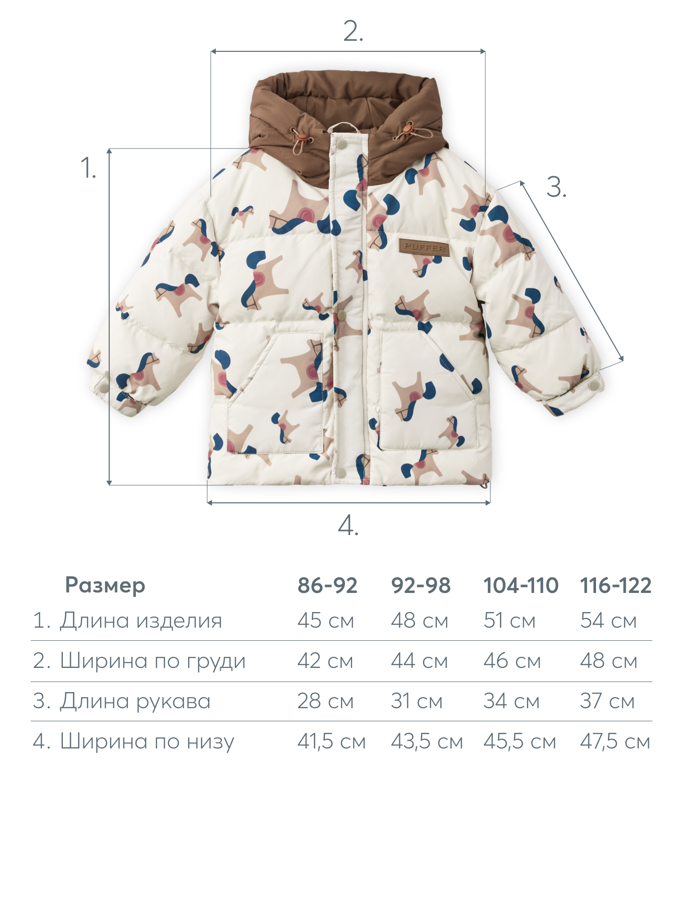 • Свободный крой — пуховик не ограничивает движения ребёнка, а внутренние лямки позволяют удобно носить куртку в помещении, не снимая её полностью