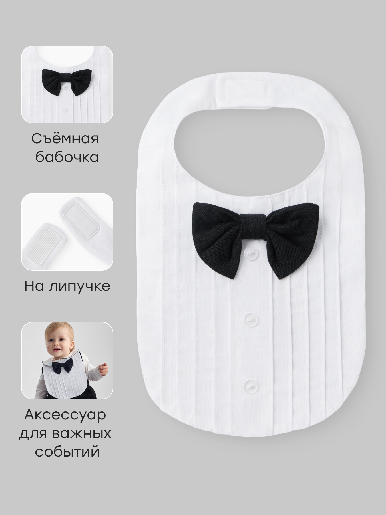 Элегантная манишка для мальчика со стильной бабочкой для малыша станет универсальным аксессуаром для праздников и фотосессий. Удобная манишка на липучке выполнена из хлопка и подходит как манишка для новорождённых, так и для детей постарше. Такой комплект — идеальные аксессуары для одежды, превращающие повседневный наряд в торжественный.