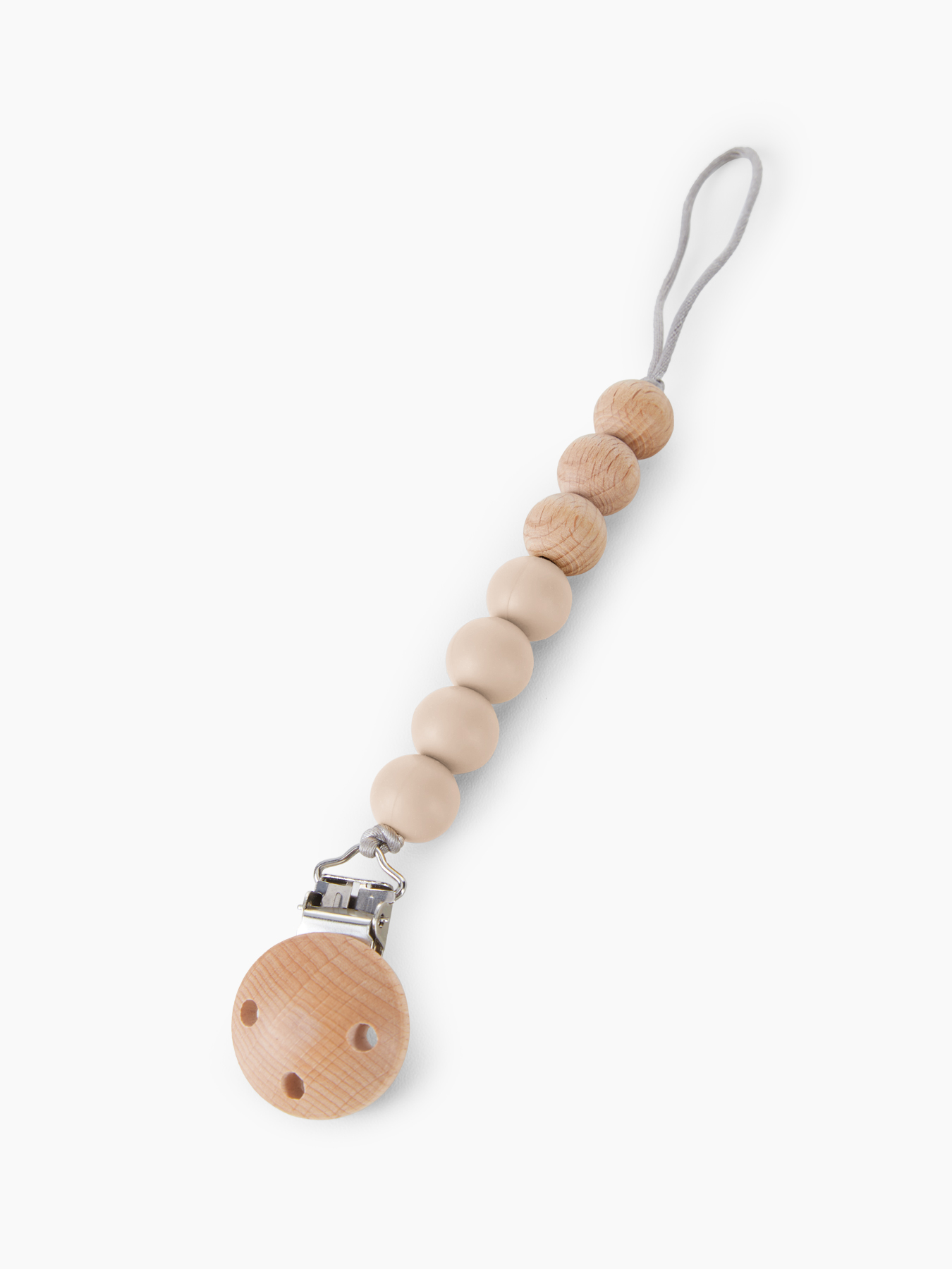 Держатель с бусинками из мягкого силикона, натурального дерева и с надёжным креплением-прищепкой - теперь вы можете быть уверены, что пустышка или прорезыватель не потеряются и всегда будут чистыми. Компактный держатель удобно брать с собой на прогулки и в длительные поездки.