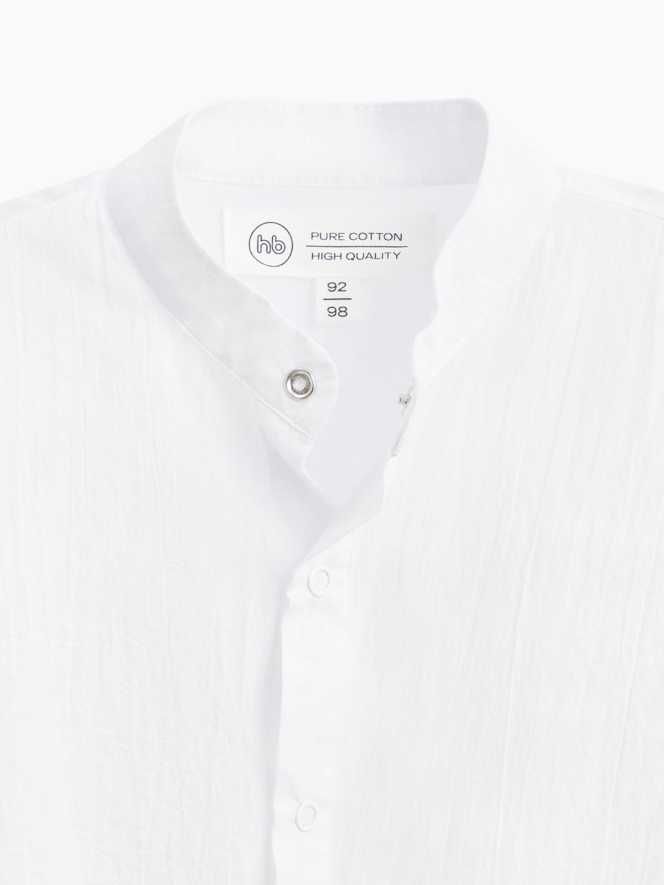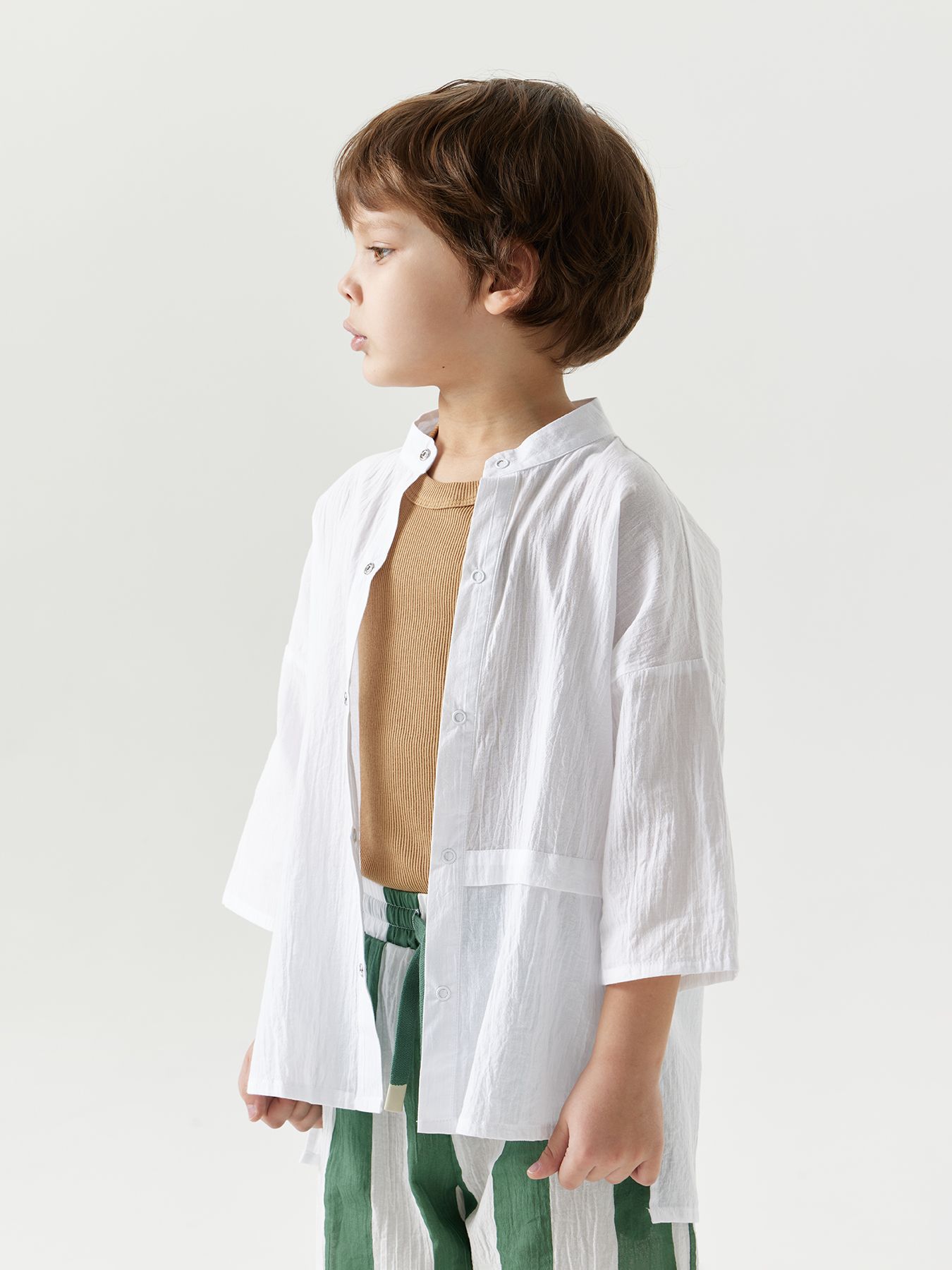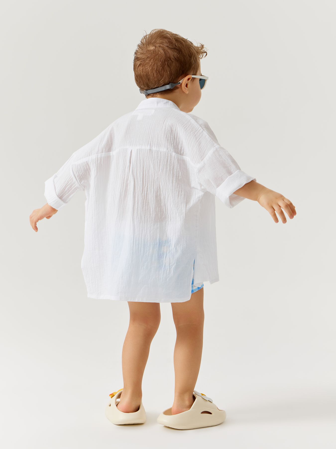 Минималистичная хлопковая рубашка впишется в повседневные, пляжные и праздничные образы. Подходит девочкам и мальчикам. Сшита из 100% хлопка, который защищает от солнца и ветра, дышит, хорошо отводит влагу. Детали кроя: спущенная линия плеча, округлый воротник, увеличенная кокетка делают базовый предмет гардероба сложным и необычным. Рубашку легко сочетать с одеждой разных стилей, любой комплект с таким топом получится модным и подчеркнет ваш хороший вкус.