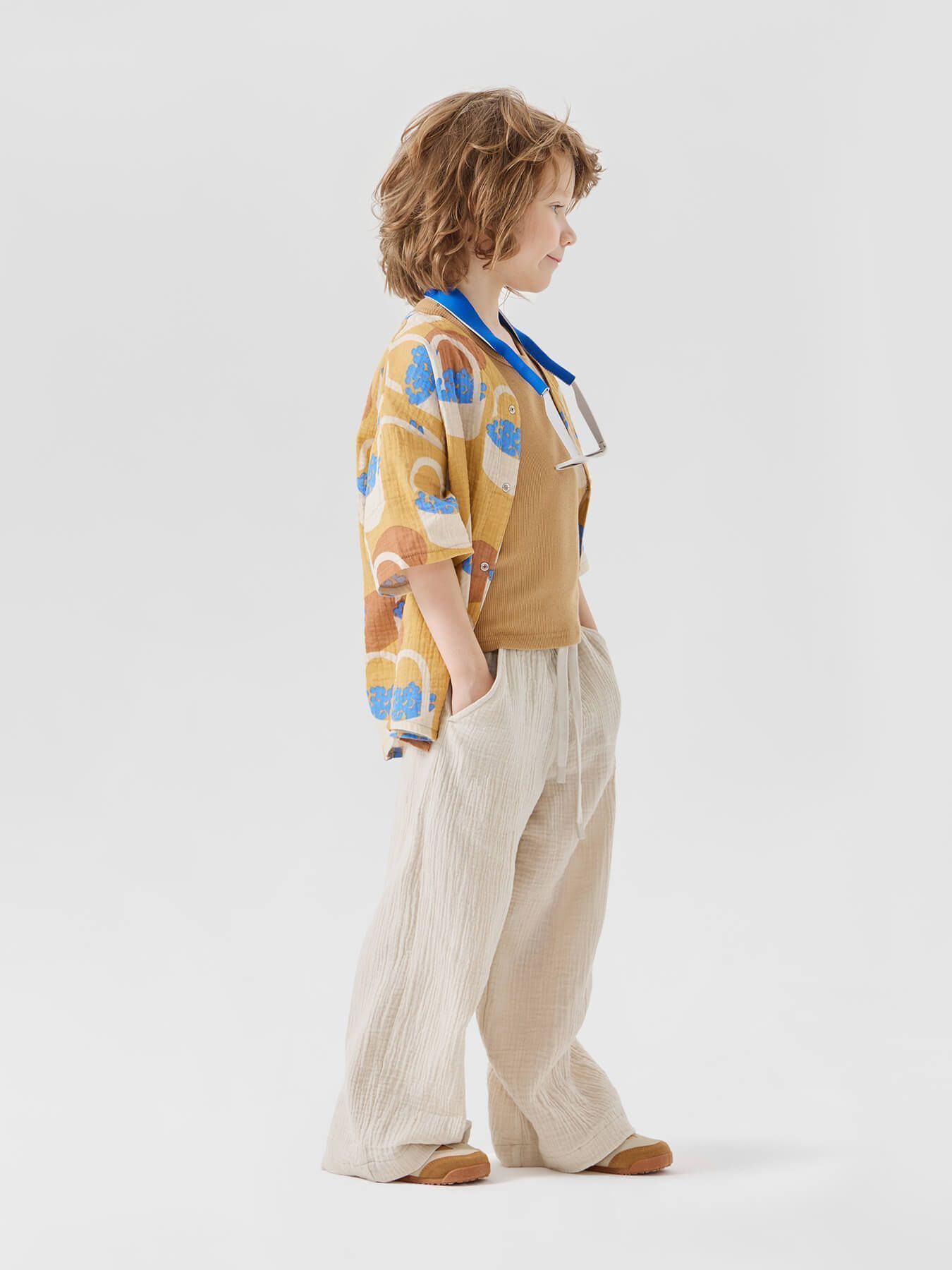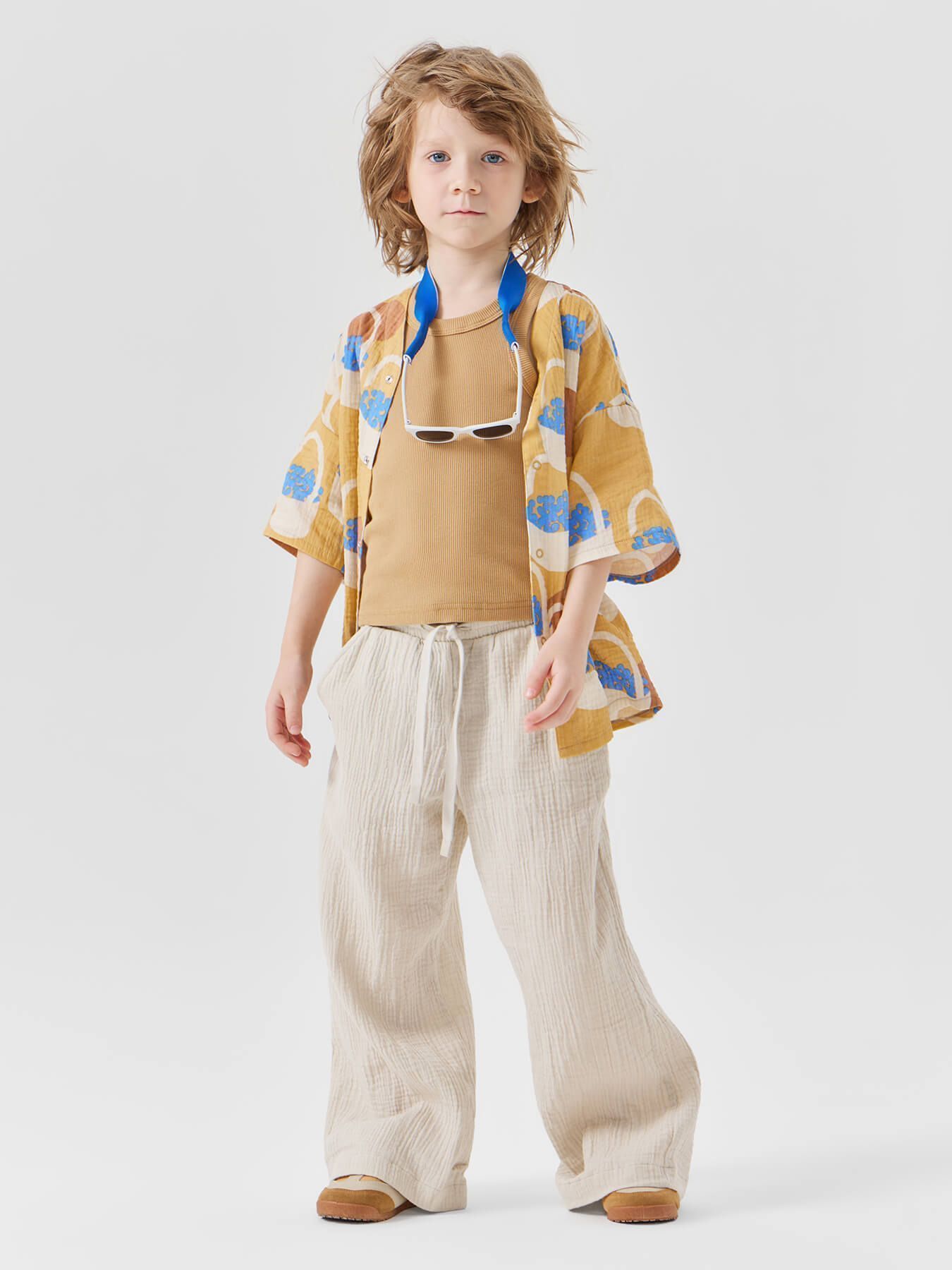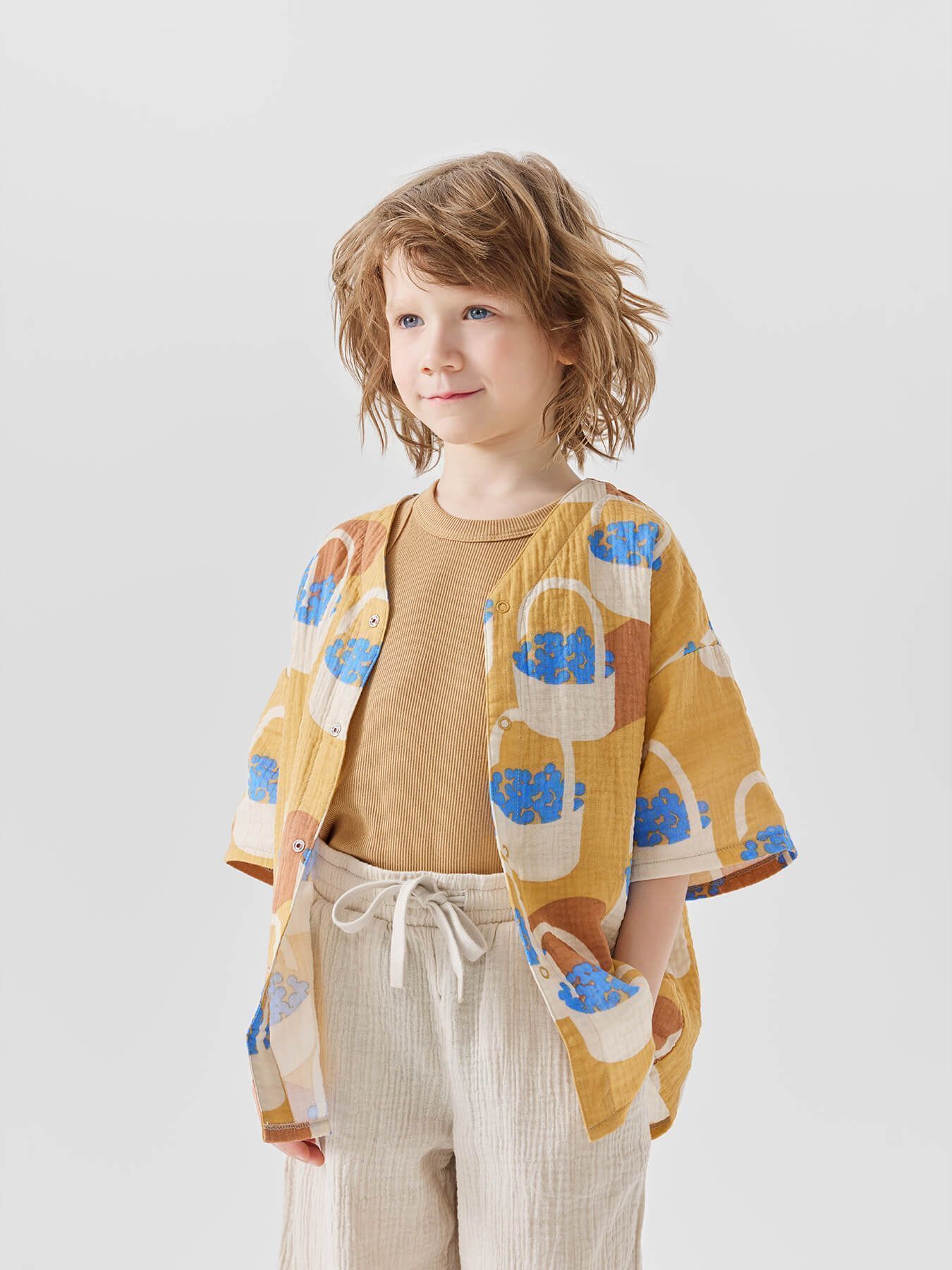 Рубашка из муслина с коротким рукавом подойдет девочкам и мальчикам. Тонкий и приятный на ощупь материал отличается высокой гигроскопичностью, обеспечивая комфорт в любую погоду. Свободный крой не стесняет движений, что делает эту модель универсальной для любых активностей. Светлая рубашка легко впишется в повседневные образы и станет базовым элементом гардероба, подходящим для города, пляжа или отдыха на природе. Можно носить как самостоятельный элемент или накинуть на плечи, дополнив купальный костюм или майку.