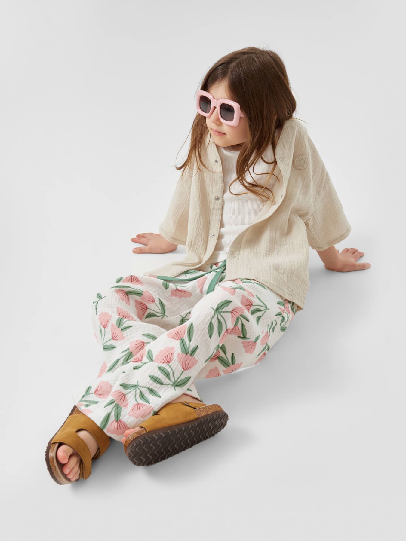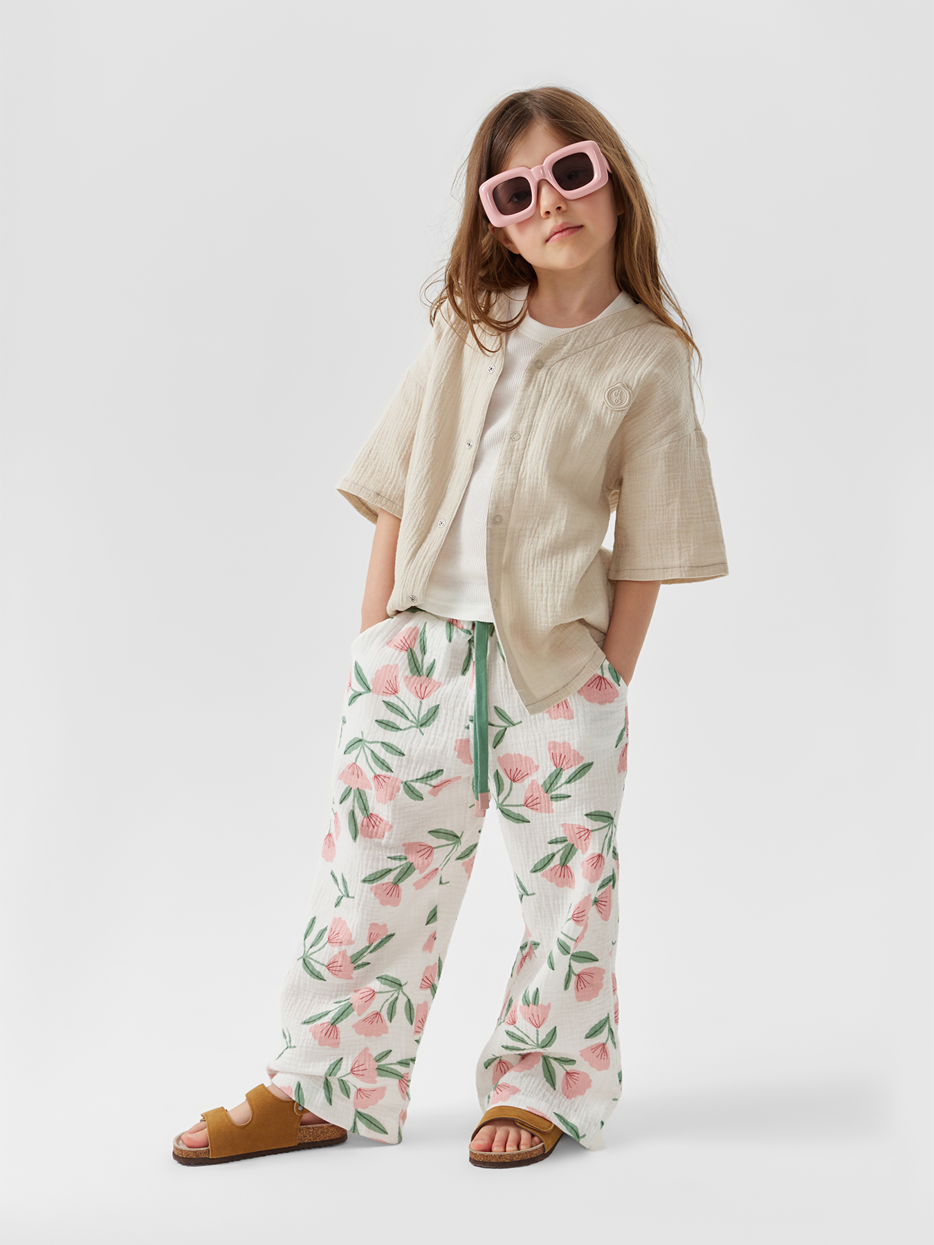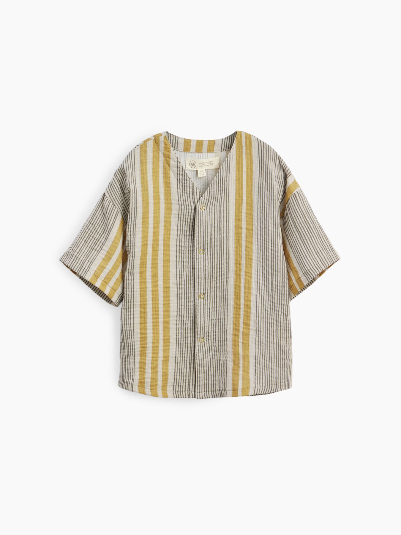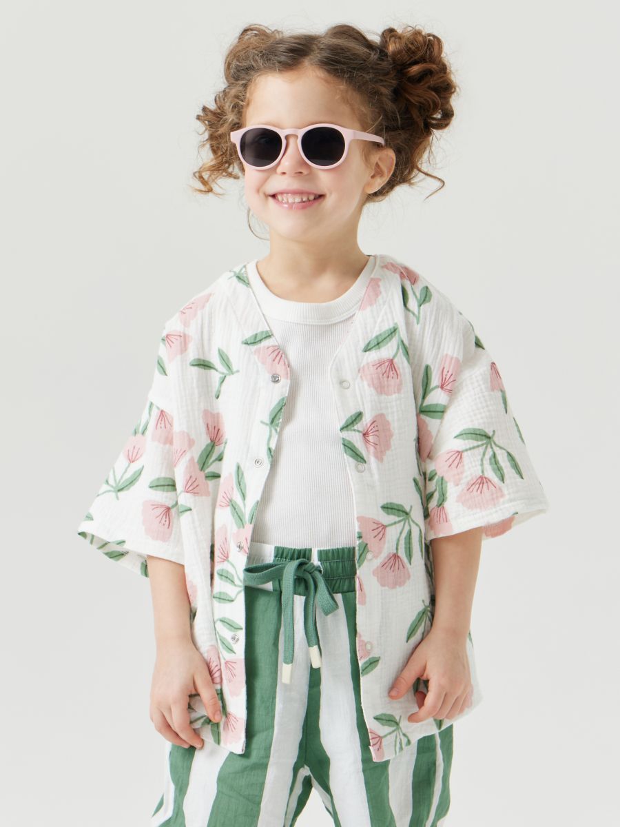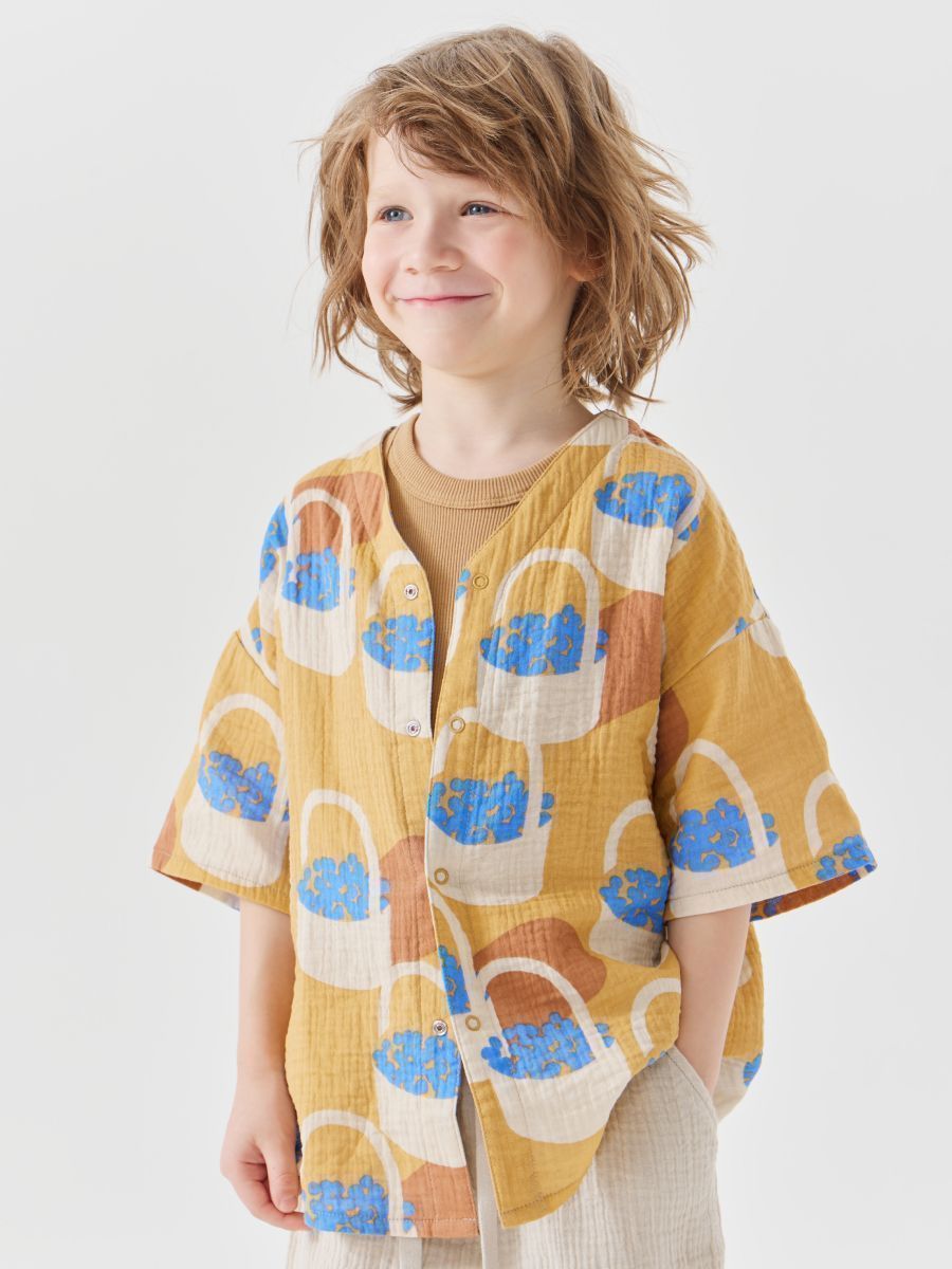 Рубашка из муслина с коротким рукавом подойдет девочкам и мальчикам. Тонкий и приятный на ощупь материал отличается высокой гигроскопичностью, обеспечивая комфорт в любую погоду. Свободный крой не стесняет движений, что делает эту модель универсальной для любых активностей. Светлая рубашка легко впишется в повседневные образы и станет базовым элементом гардероба, подходящим для города, пляжа или отдыха на природе. Можно носить как самостоятельный элемент или накинуть на плечи, дополнив купальный костюм или майку.