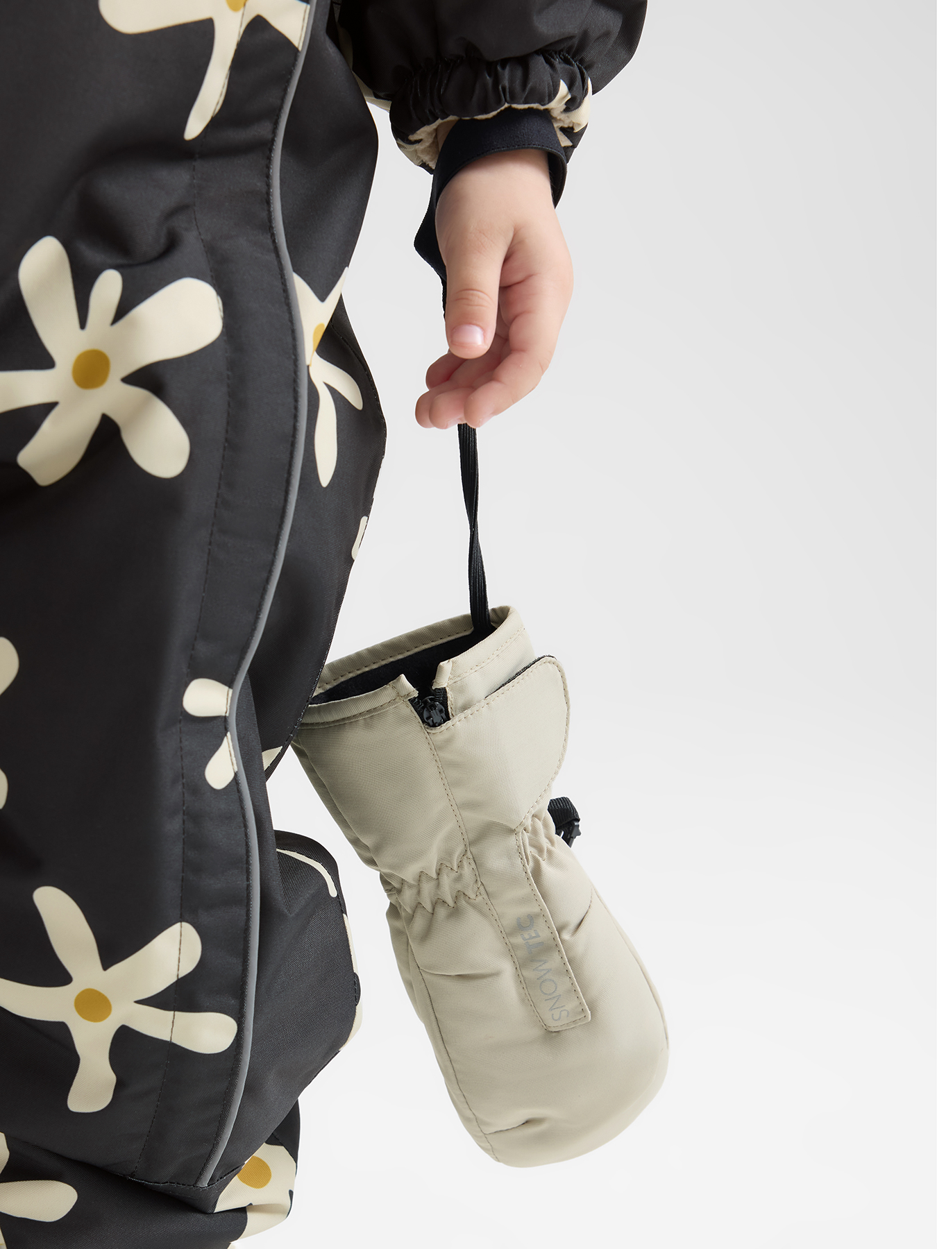 • Продуманные детали — рукавицы скреплены между собой фиксатором, а резинка позволяет закрепить их на одежде