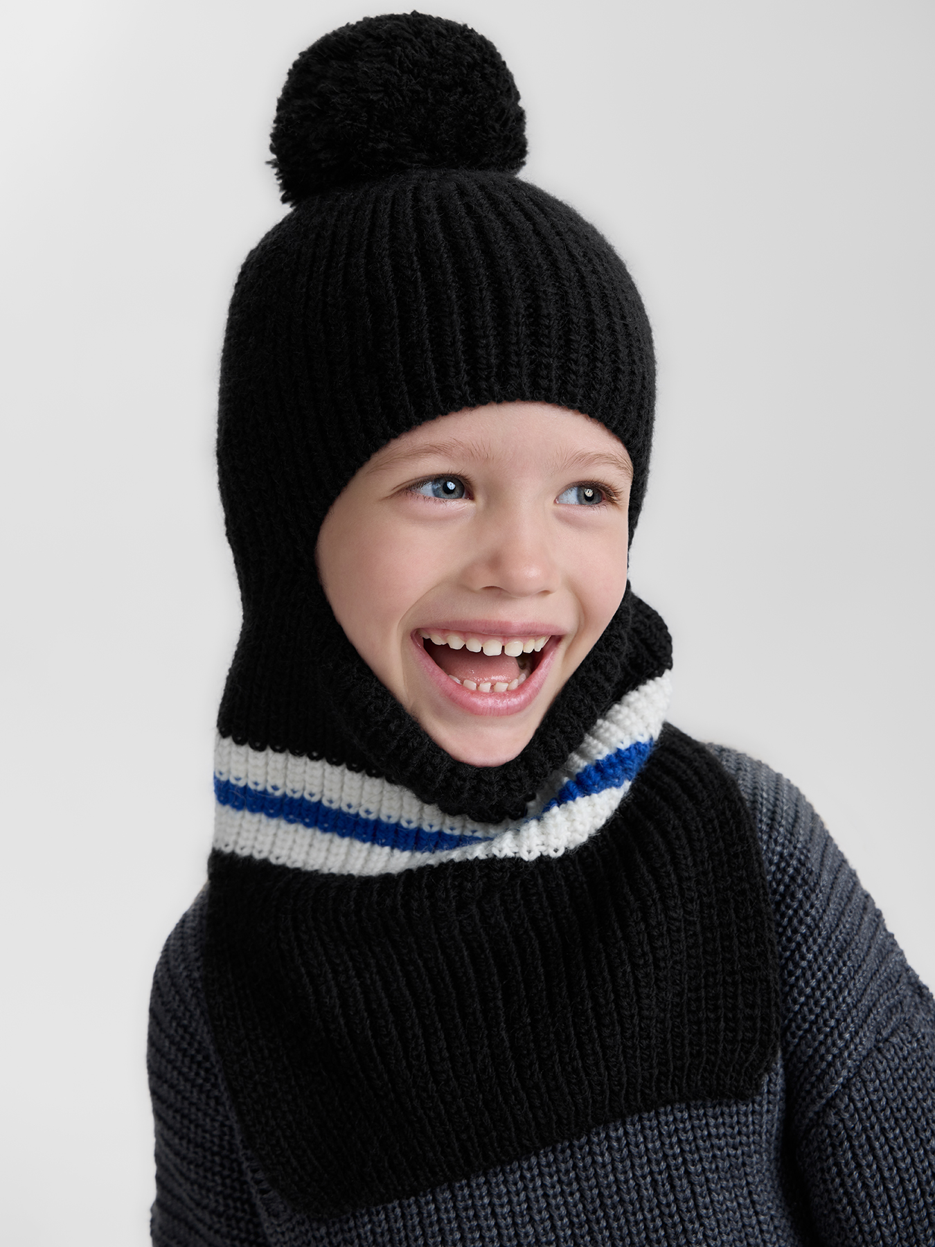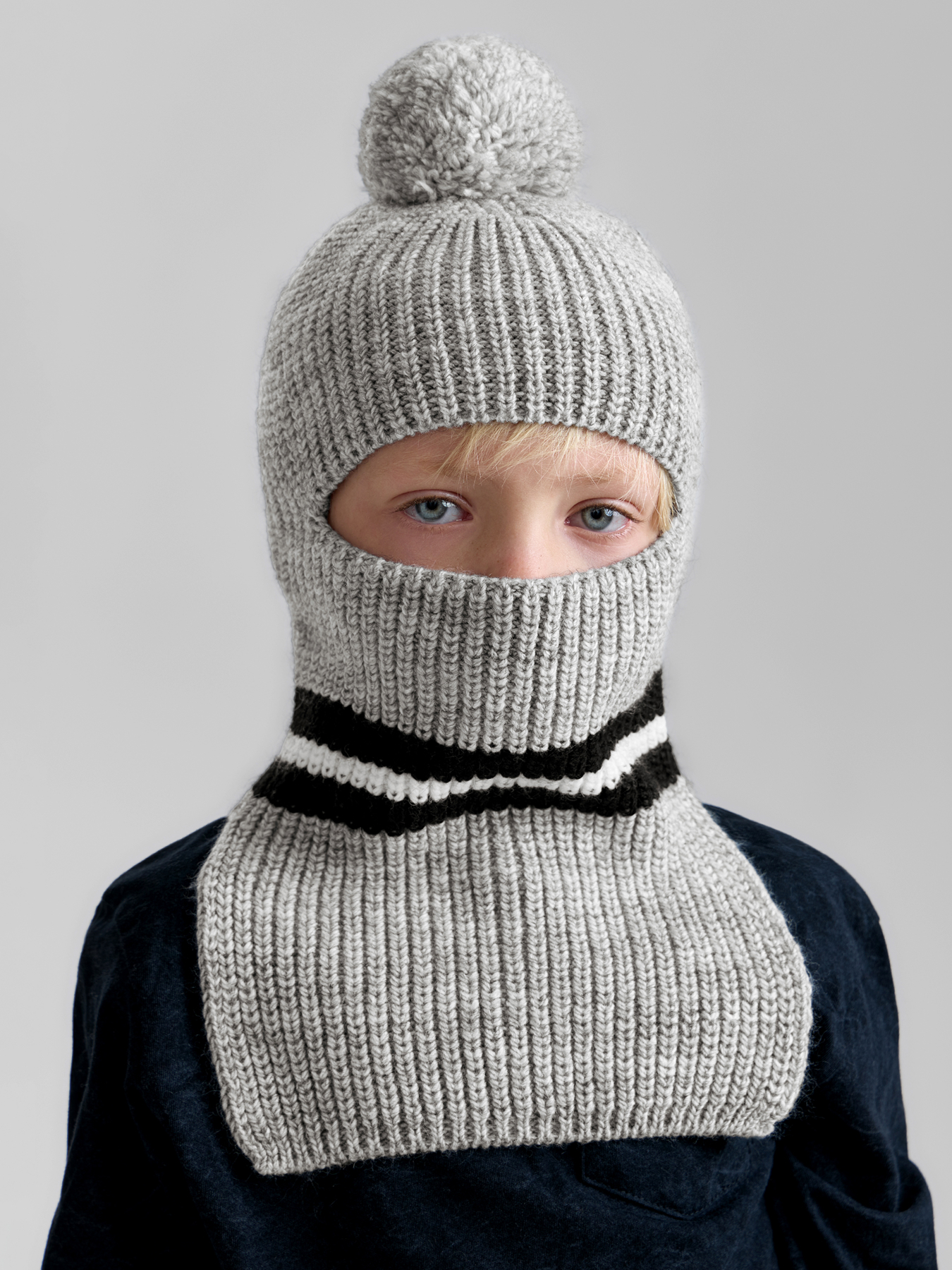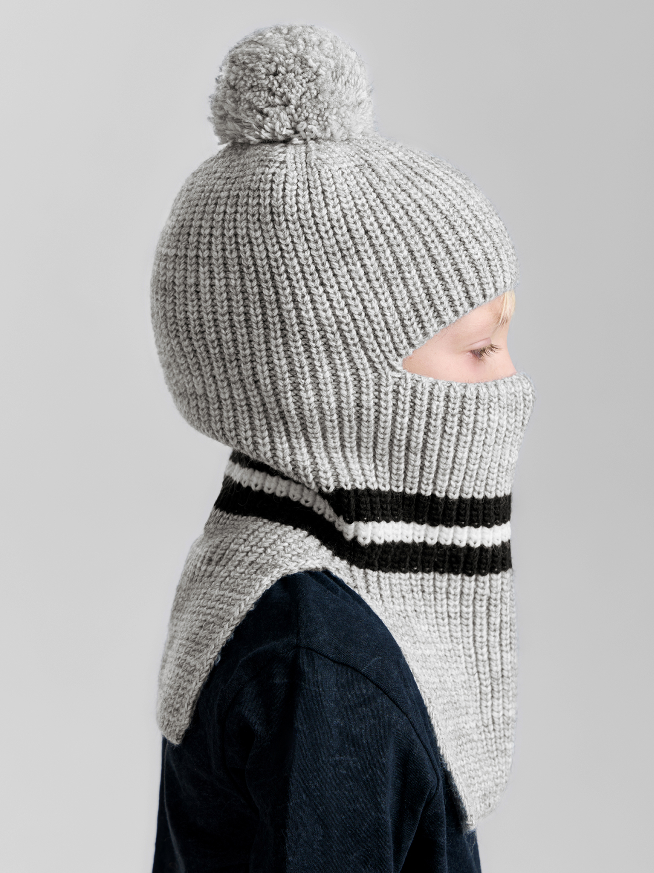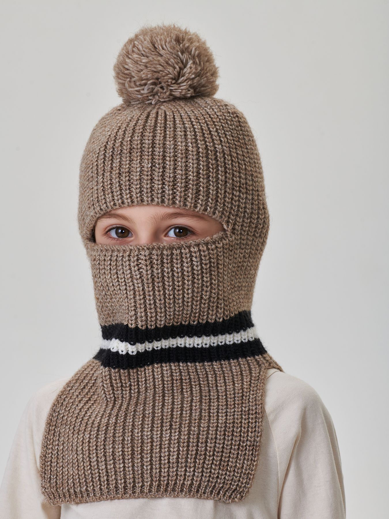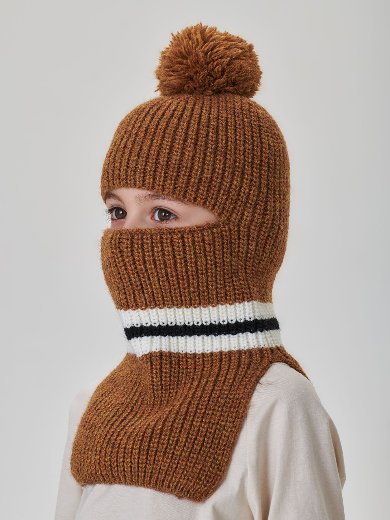 Шапка-шлем согреет малыша и защитит от ветра. Конструкция защищает уши, шею и лицо, что позволяет чувствовать комфорт даже в сильные морозы. При необходимости вырез позволяет натянуть его на подбородок, открывая лицо полностью. Смесовый материал хорошо держит форму и не скатывается после стирки.