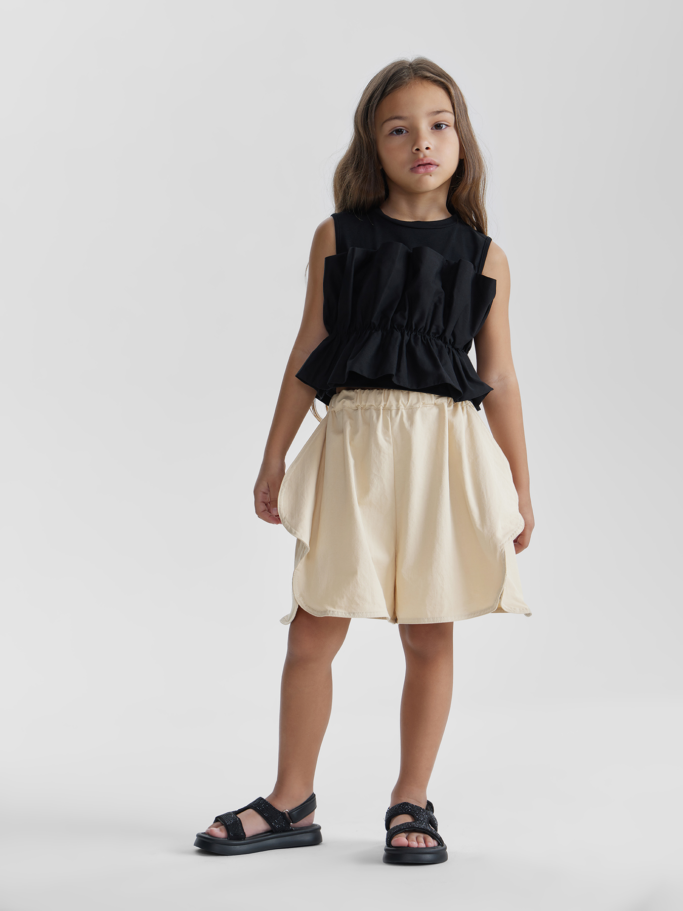 Модные объемные шорты сшиты из 100% хлопка и идеально подойдут для жарких дней. Объемный крой обеспечивает свободу движений и комфорт. Резинка на поясе адаптируется под фигуру ребенка. Идеально сочетаются с топами и футболками для создания легких летних образов.