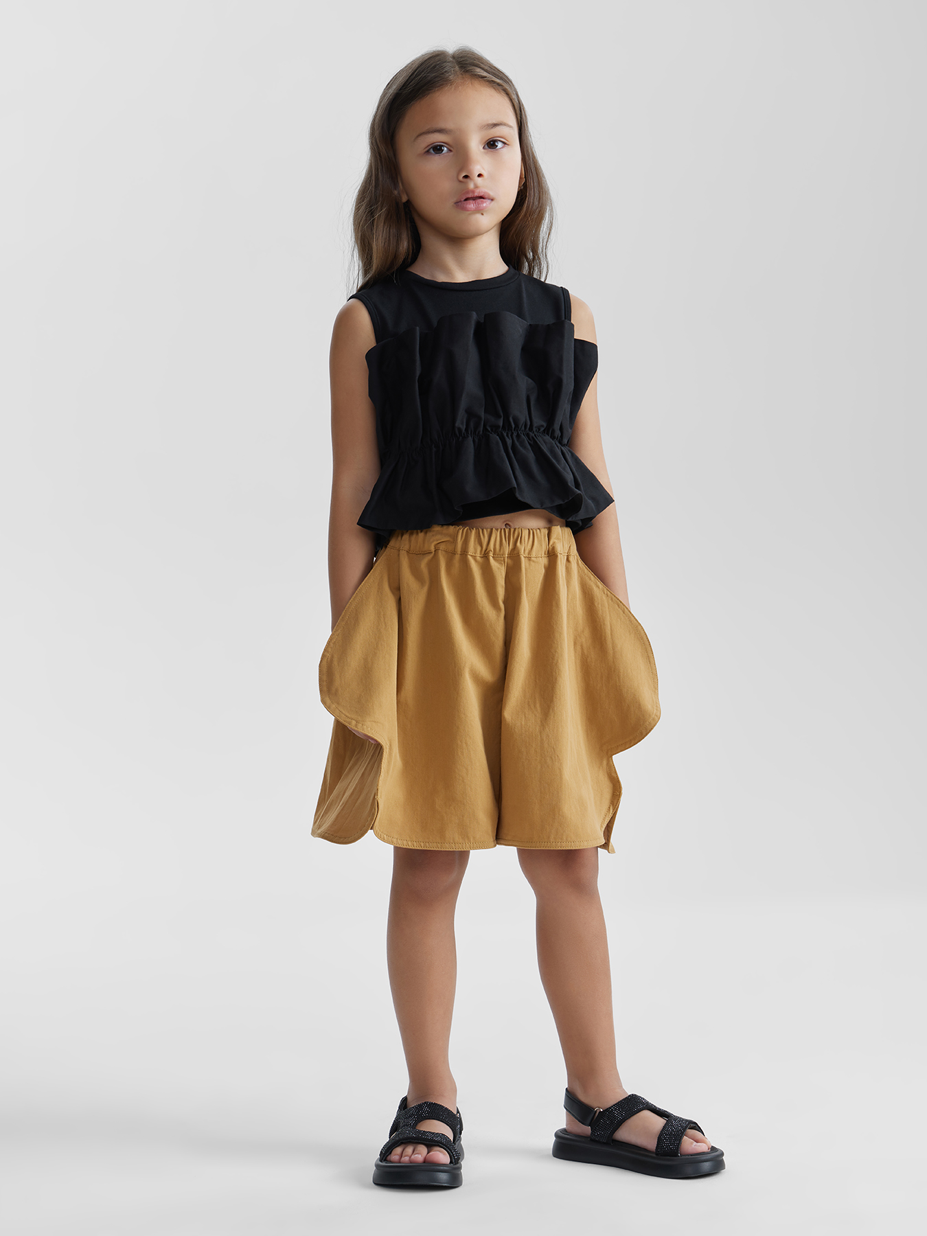 Модные объемные шорты сшиты из 100% хлопка и идеально подойдут для жарких дней. Объемный крой обеспечивает свободу движений и комфорт. Резинка на поясе адаптируется под фигуру ребенка. Идеально сочетаются с топами и футболками для создания легких летних образов.