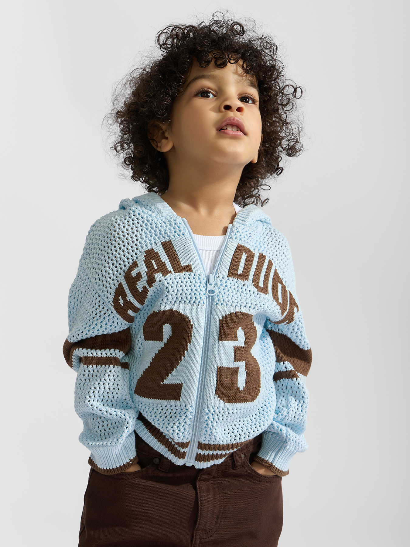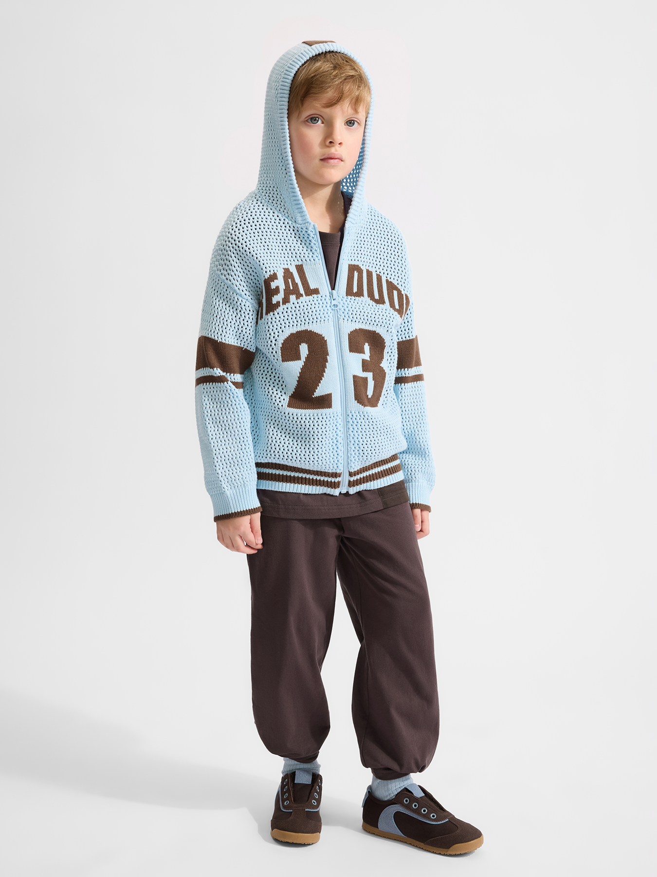 • Ажурная вязка — декоративные элементы в виде текста и цифр добавляют изделию выразительность
