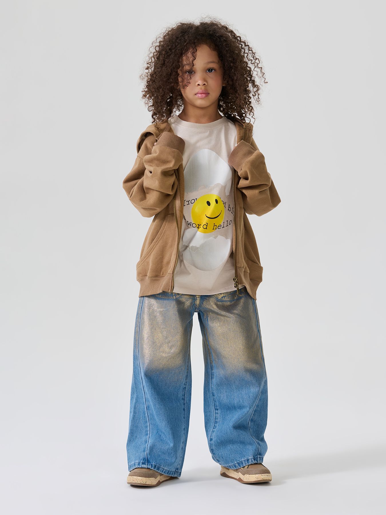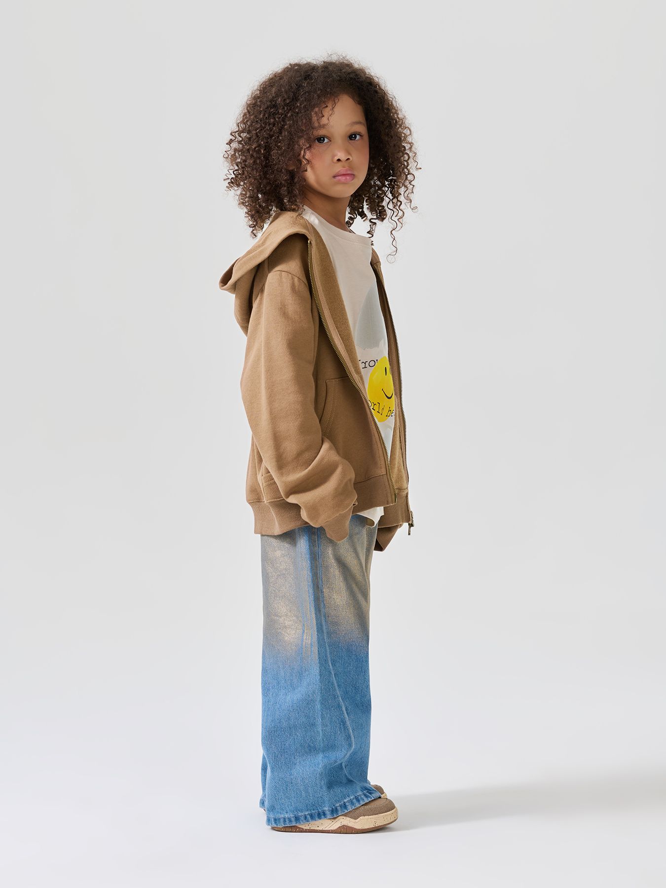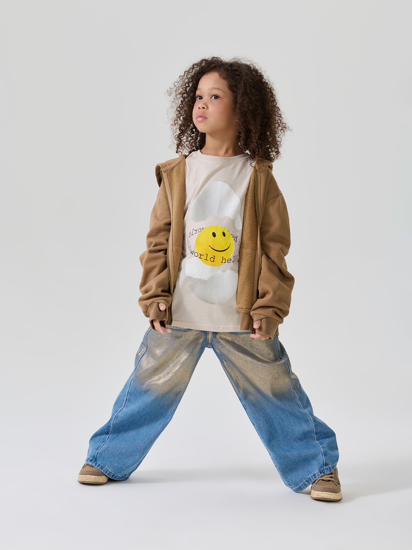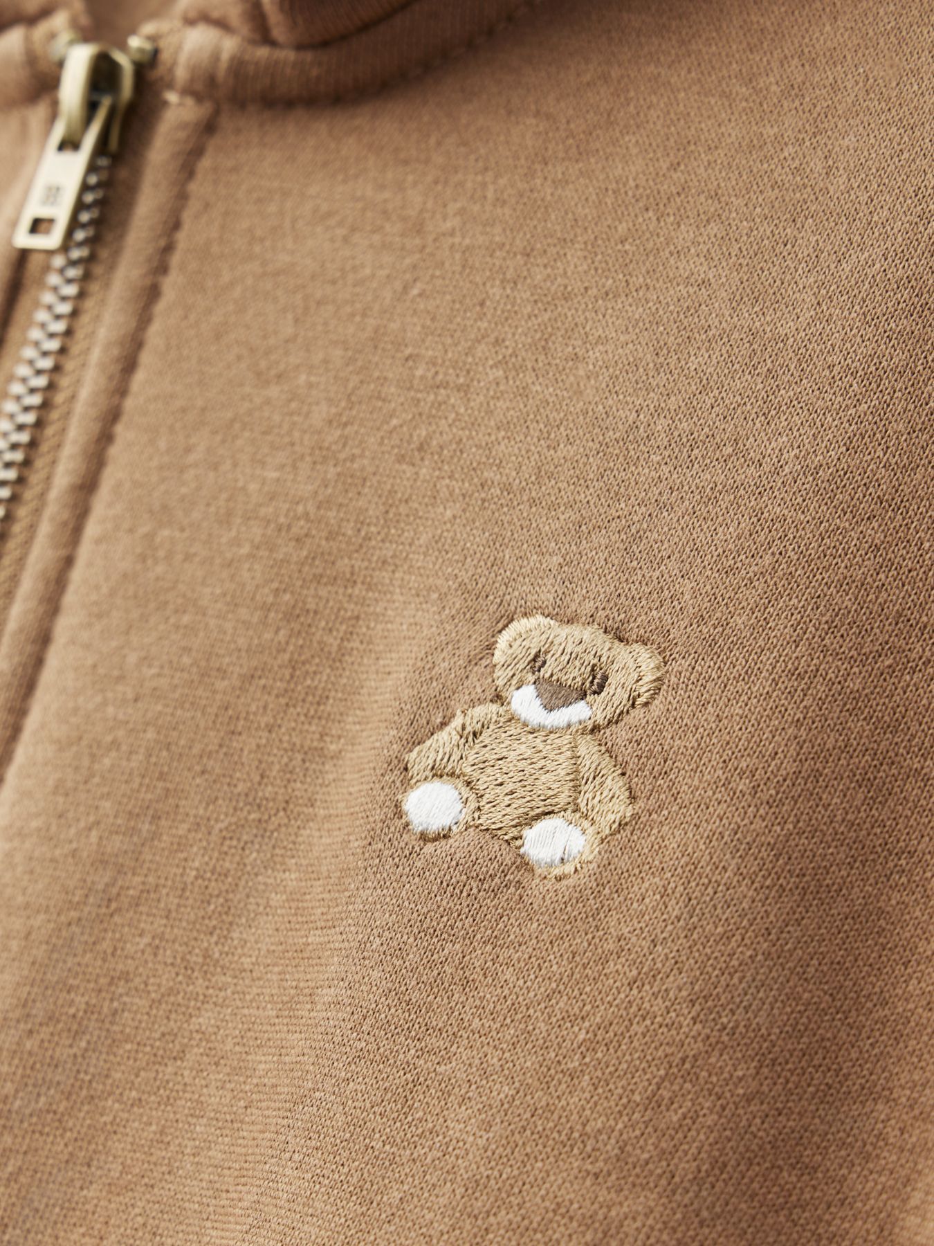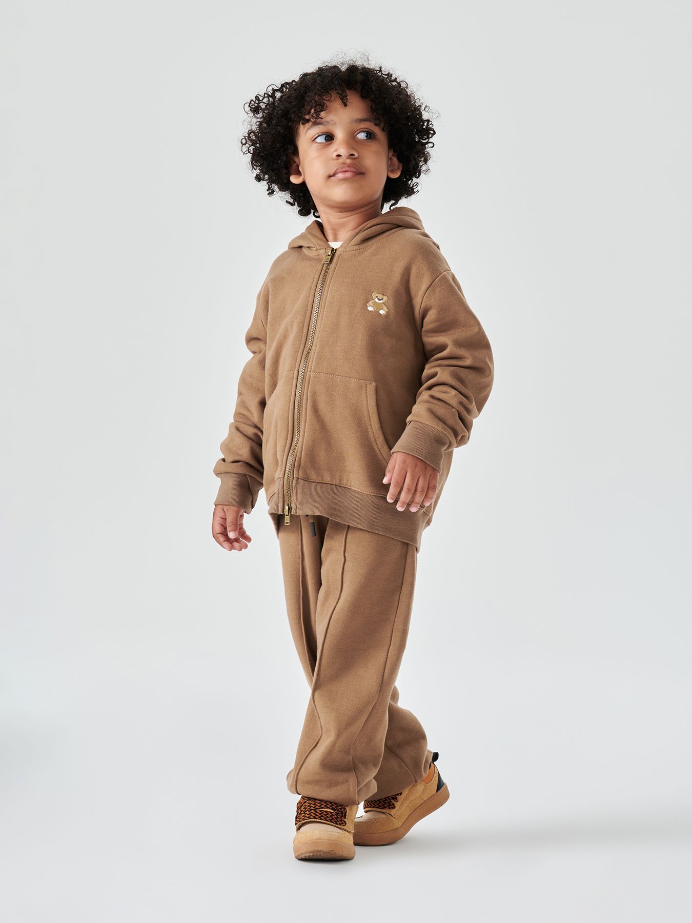 Толстовка на молнии позволит каждый день создавать новые многослойные образы. Изделие легко надевать и снимать: понравится детям, которые испытывают дискомфорт от вещей с плотной горловиной. Манжеты на рукавах и резинка по низу изделия защитят от ветра. В накладные карманы спереди можно спрятать руки. Капюшон не спадает и помогает дополнительно утеплиться. Спущенная линия плеча обеспечивает свободную посадку.