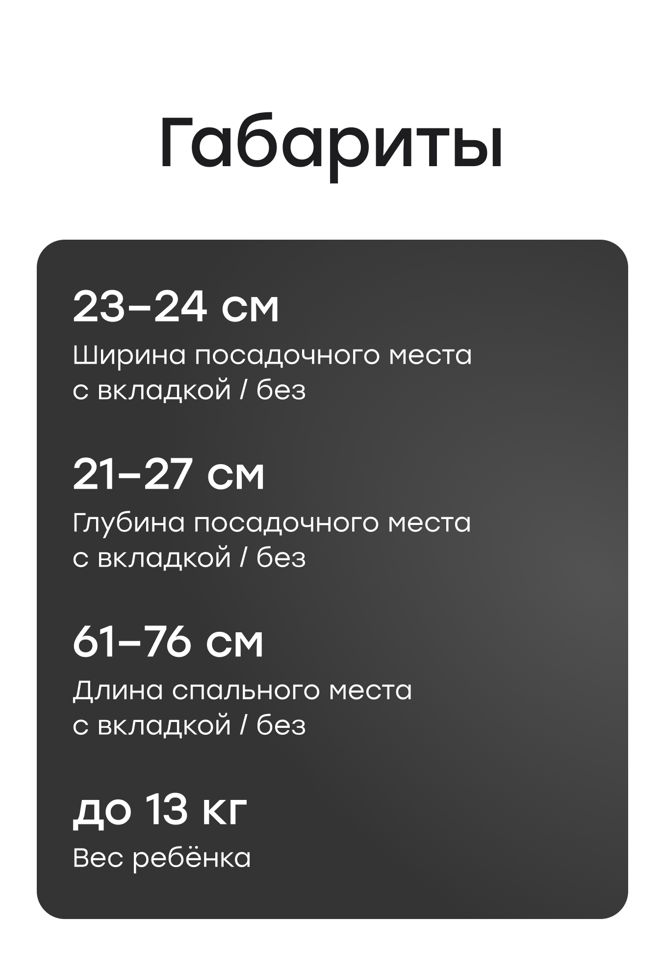 • Комплектация анатомическая подушка, мягкие накладки на ремни, капюшон / тент от солнца, ручка для переноса