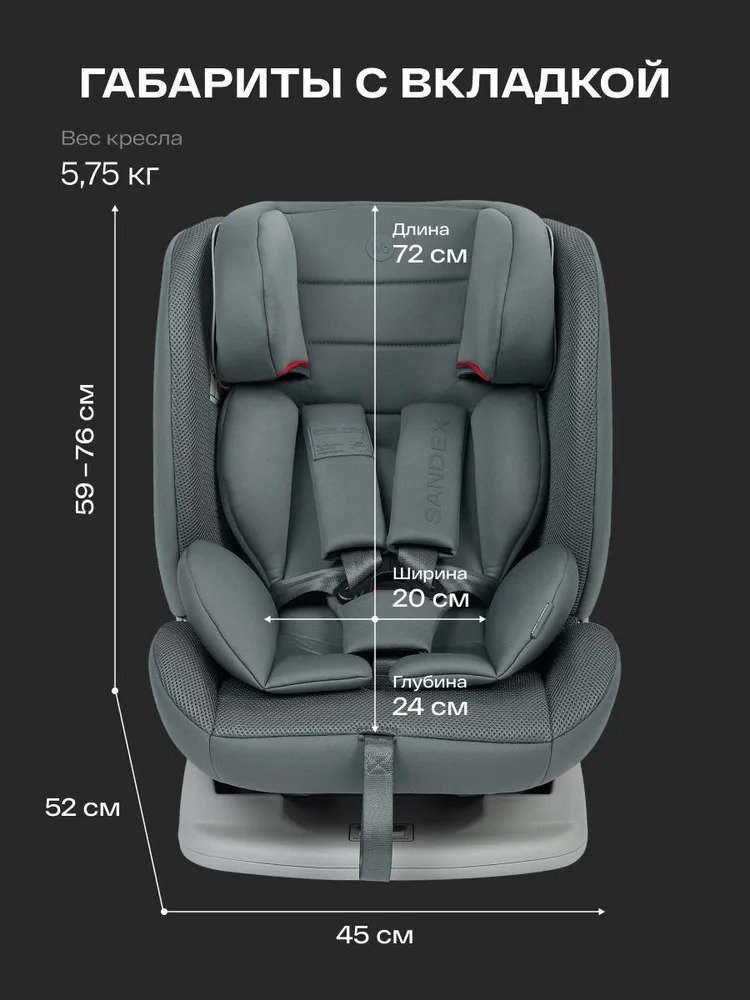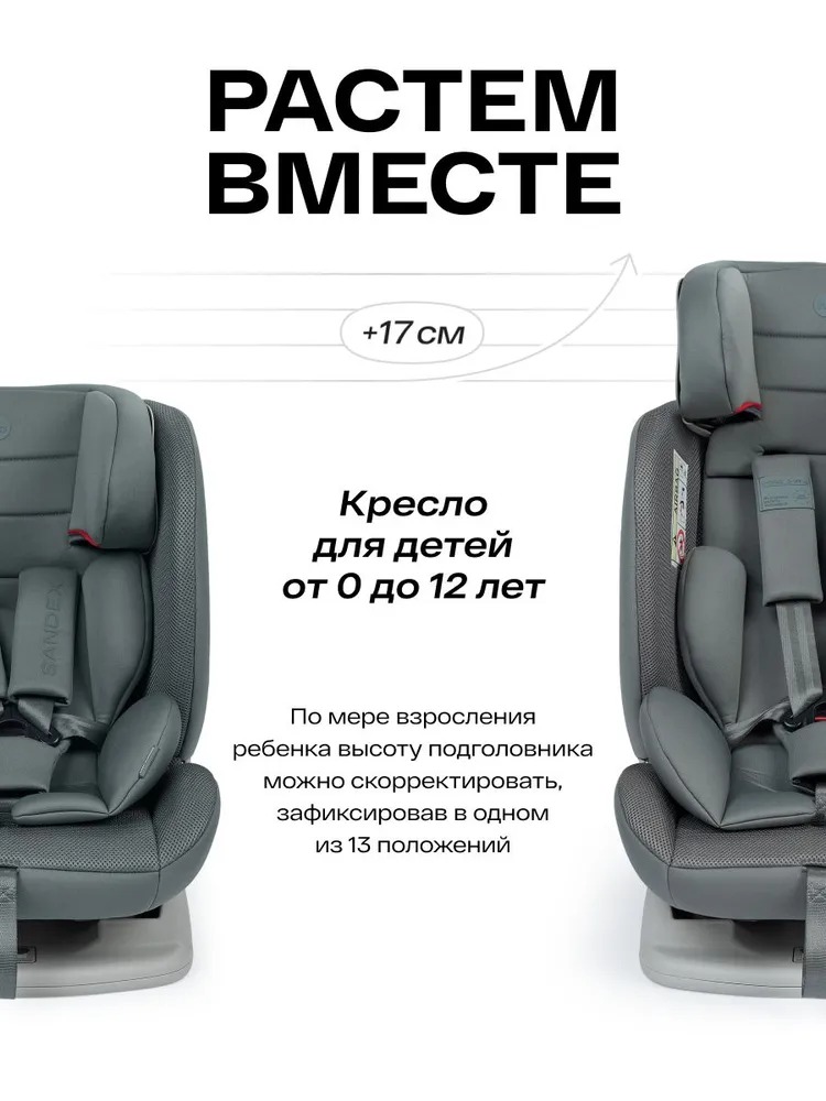 Автокресло SANDEX - это безопасность и комфорт в дороге, легкость установки и использования, обновленный дизайн и практичность. Эта модель прослужит вашему ребенку с самого рождения и до 12 лет, подстраиваясь под растущего малыша и взрослеющего ребенка. Съемная мягкая вкладка в сочетании с мягкими накладками на ремнях безопасности, с мягким настраиваемым по высоте подголовником с 13 положениями по высоте и 4 положения наклона спинки помогут подобрать идеальный вариант для максимального комфорта в пути. Когда малыш подрастет, снимите вкладку и получите большое посадочное место с защитой от боковых ударов, в котором не будет тесно в зимней одежде. За безопасность отвечают пятиточечные ремни безопасности. Съемный чехол легко снимается и прост в уходе.