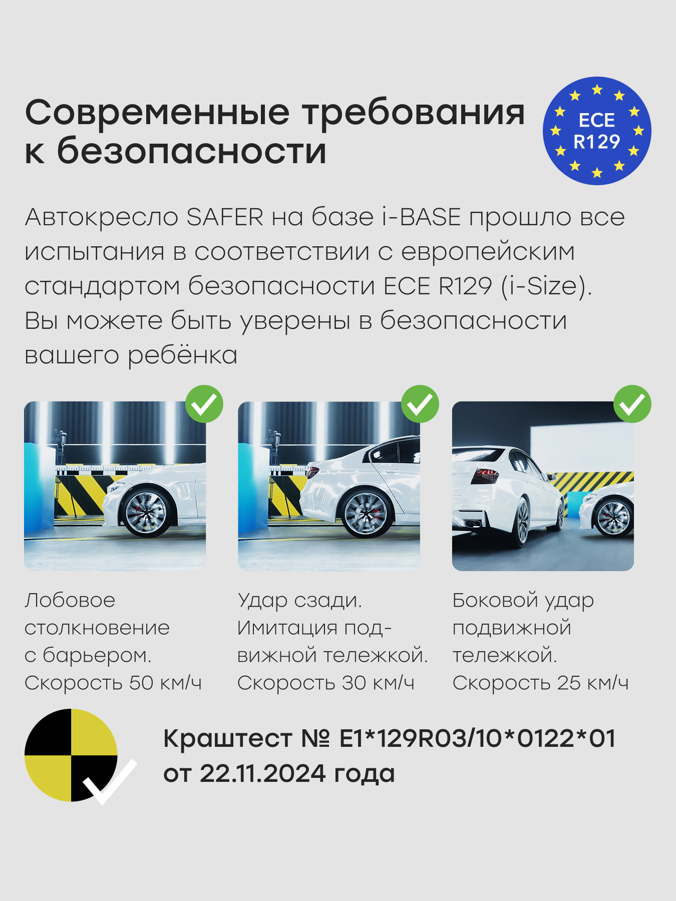 • Соответствует современным стандартам безопасности i-Size, обеспечивая дополнительную защиту ребенка