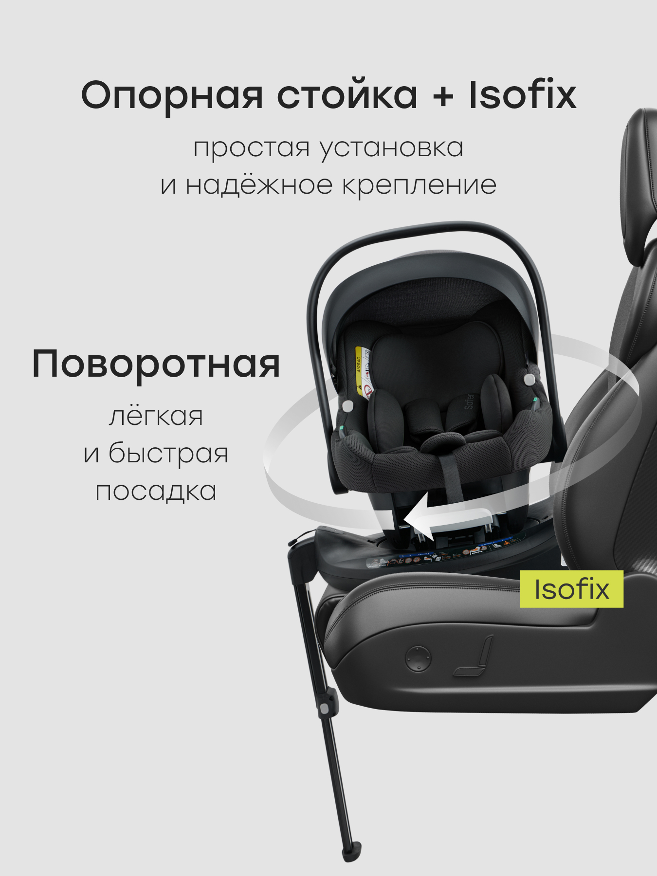 • Поворотная конструкция для удобства размещения ребенка в автокресле