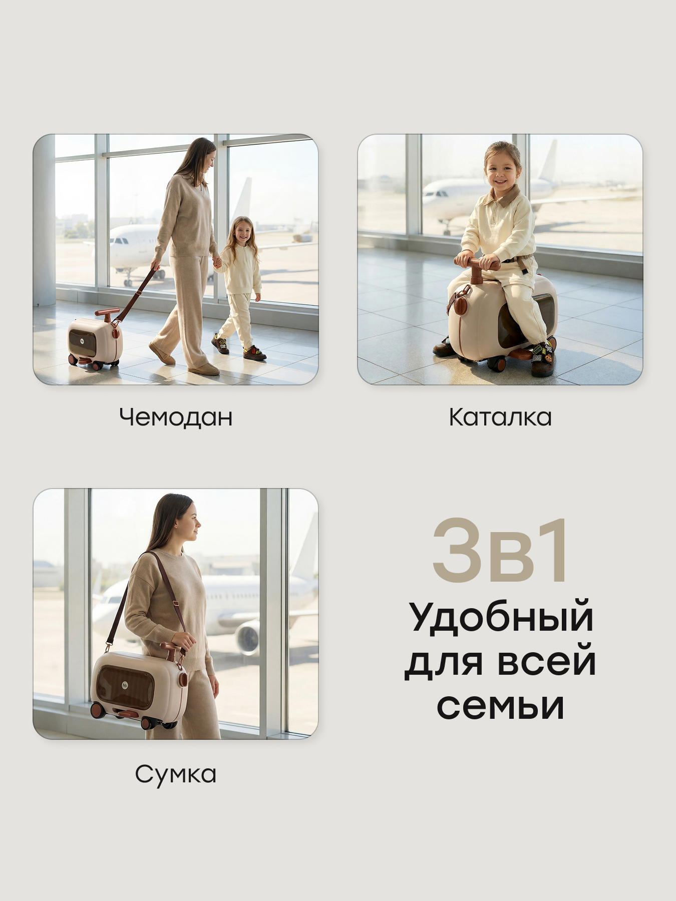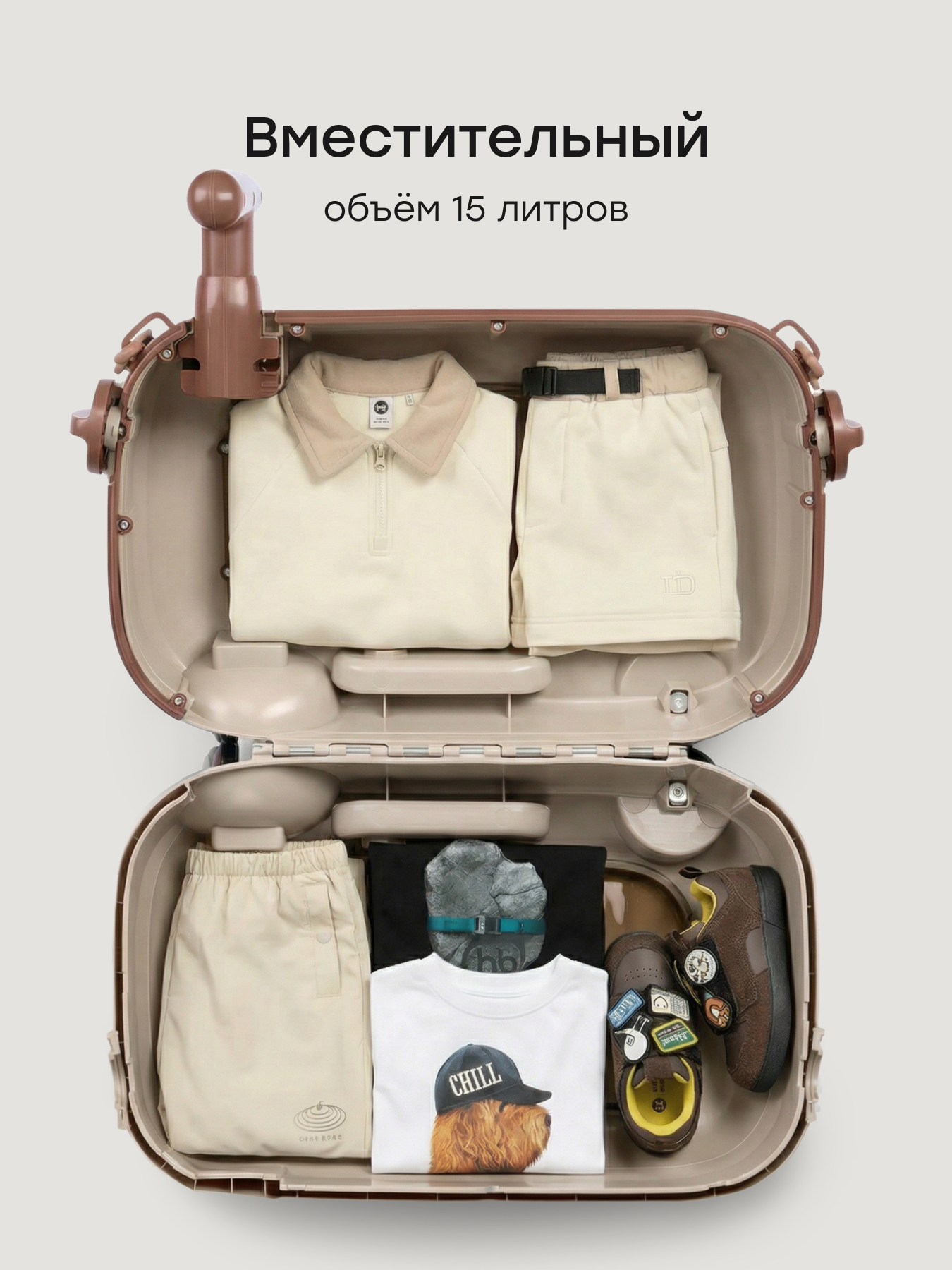 • Превращается в каталку — ребёнок может кататься на чемодане как на машинке
