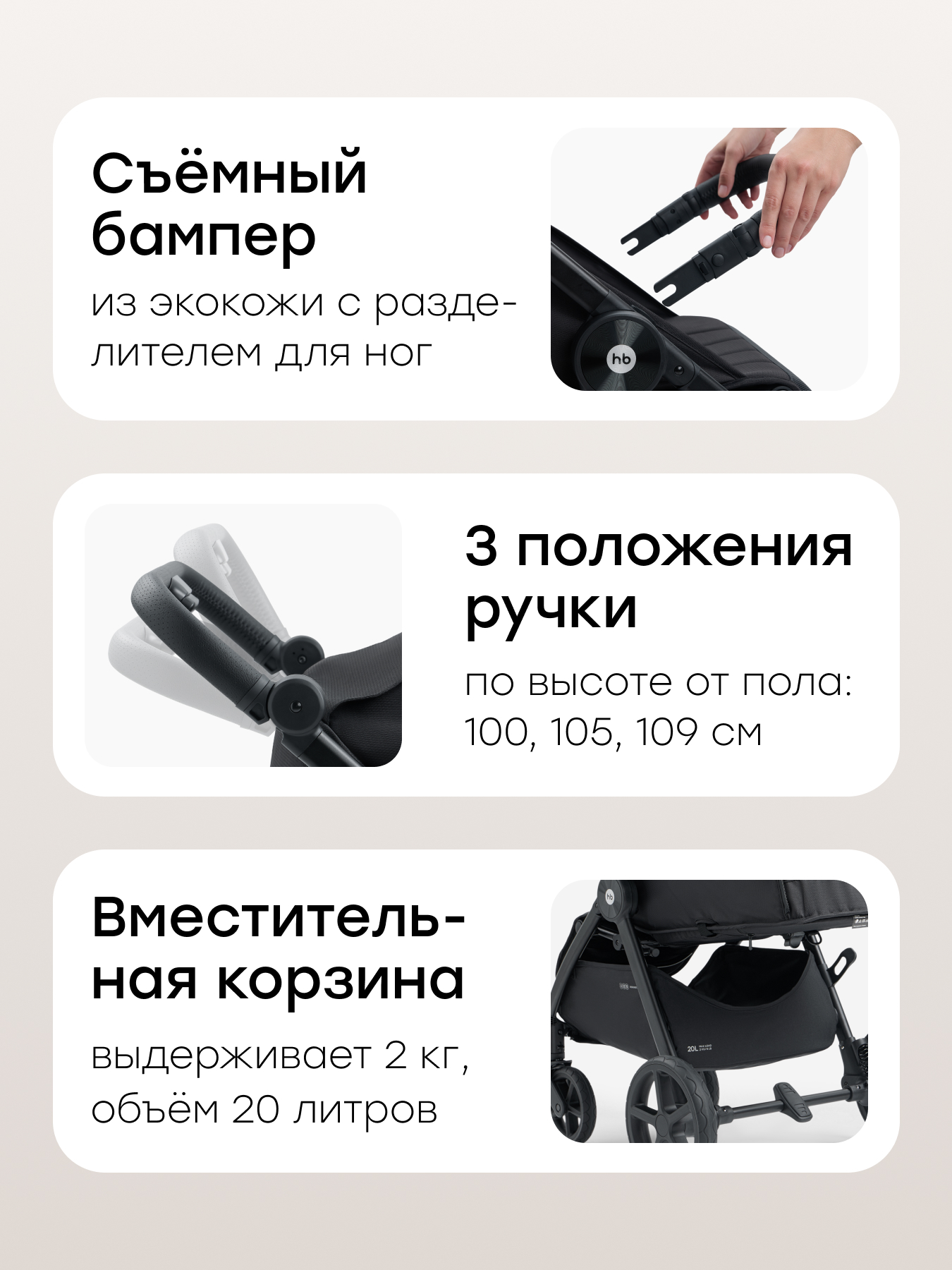 • 3 положения ручки — позволяют регулировать высоту под индивидуальные потребности