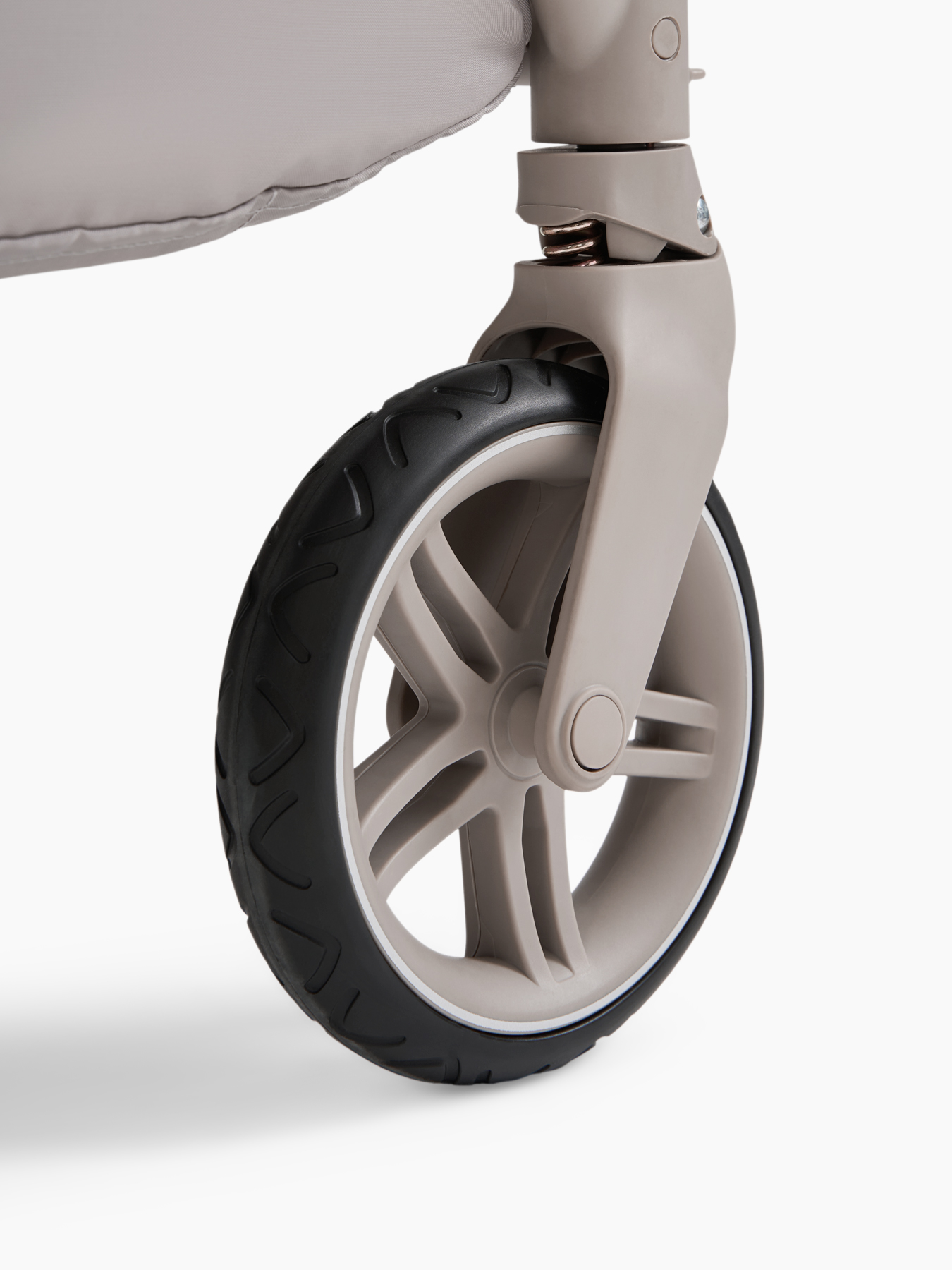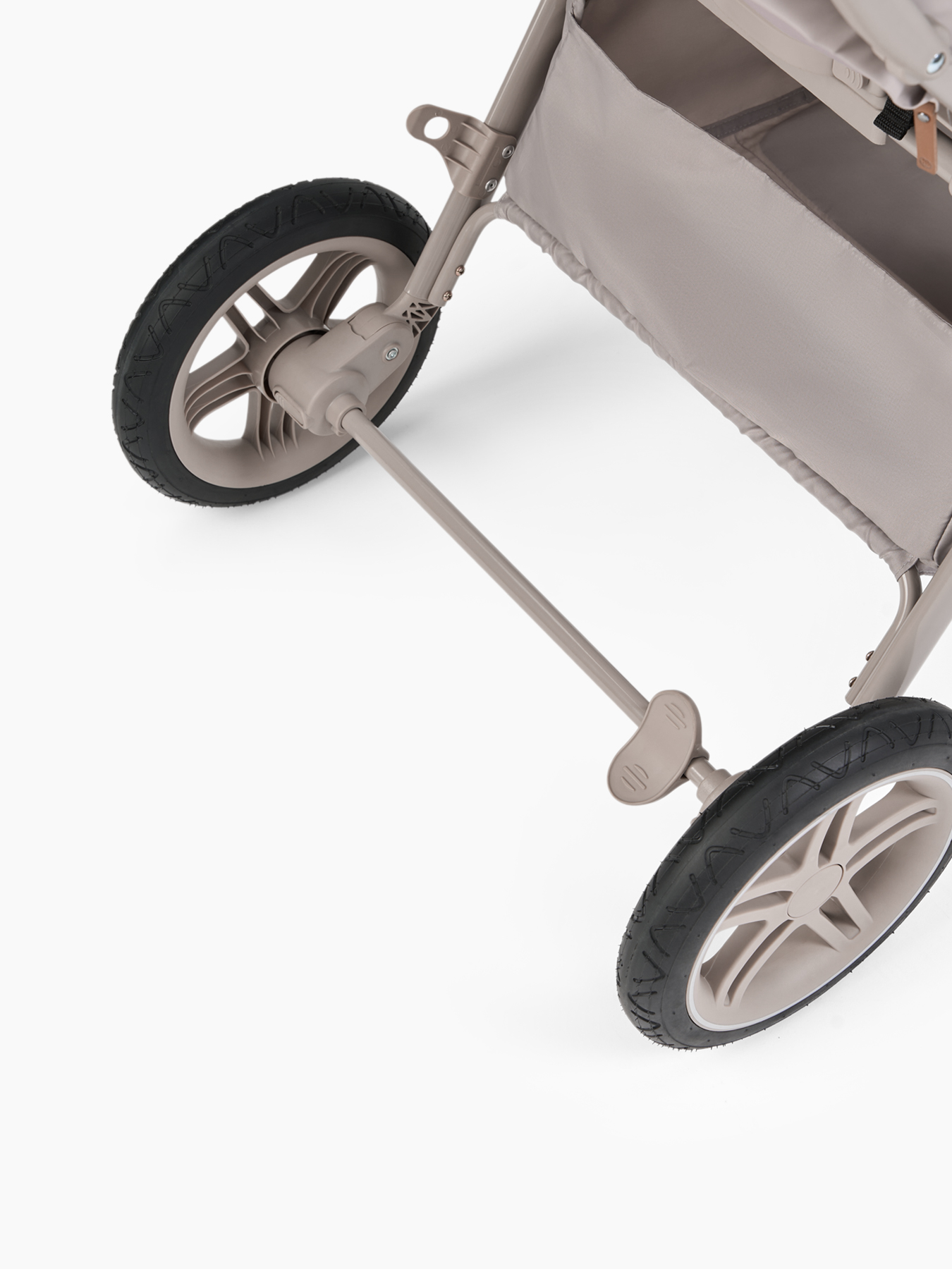 Передние колеса также вращаются на 360° для максимальной маневренности, облегчая управление даже одной рукой. Капюшон с возможностью расширения до бампера надежно защищает от солнца, дождя и ветра. Большая корзина позволит взять с собой все необходимое для прогулки.