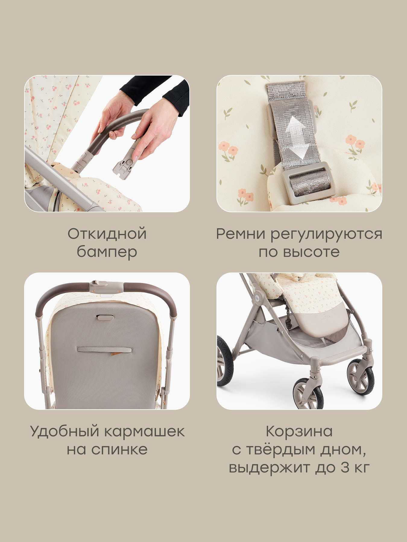 • Откидной съемный бампер — дает возможность легко вытащить ребенка из коляски