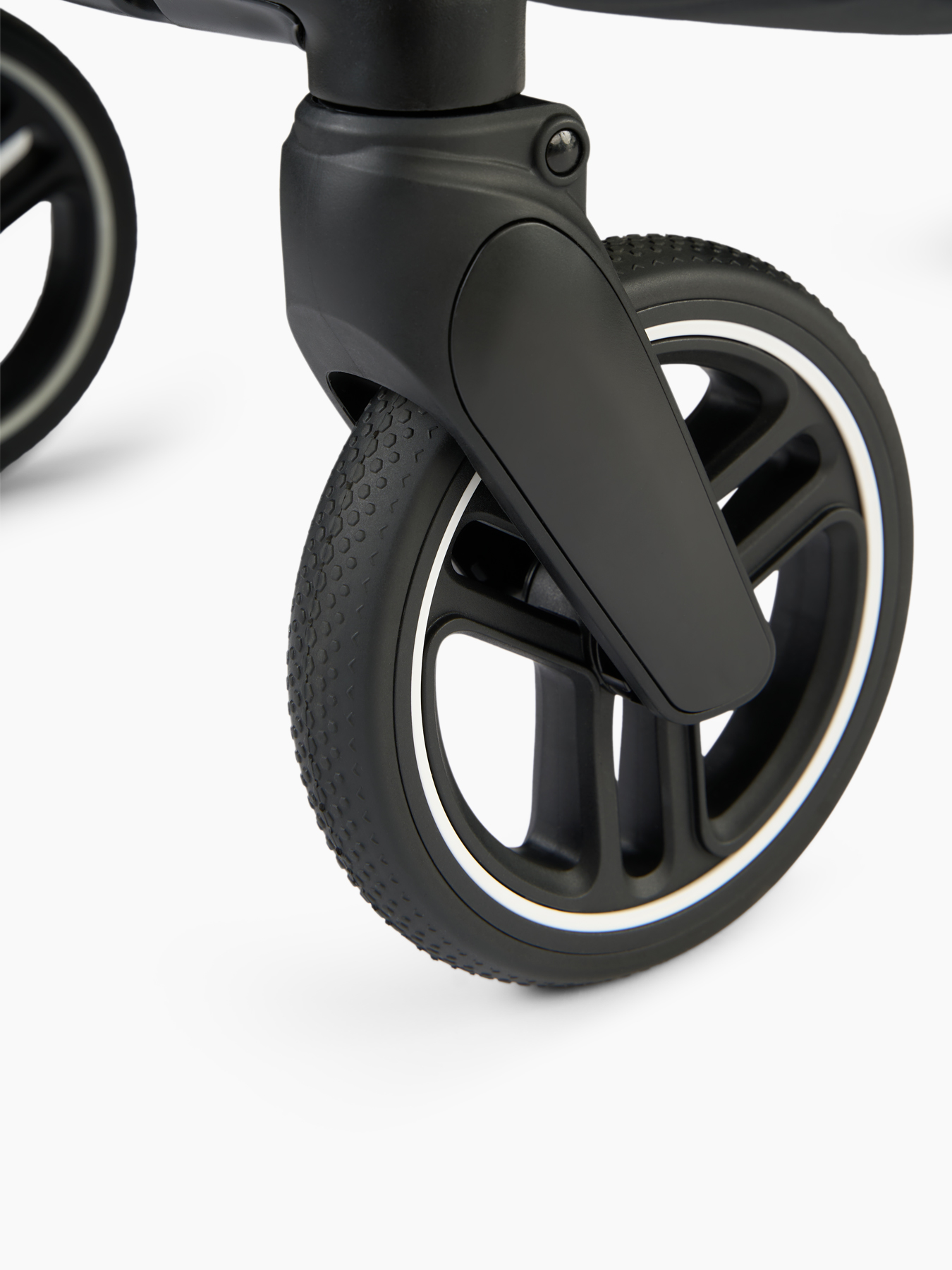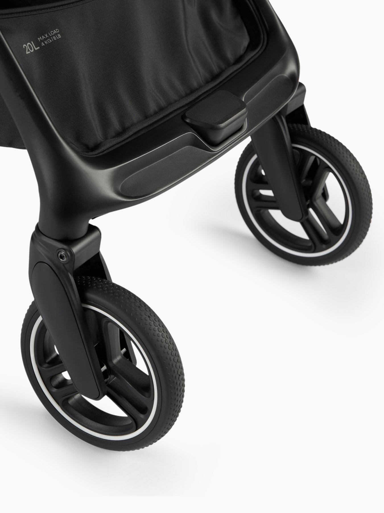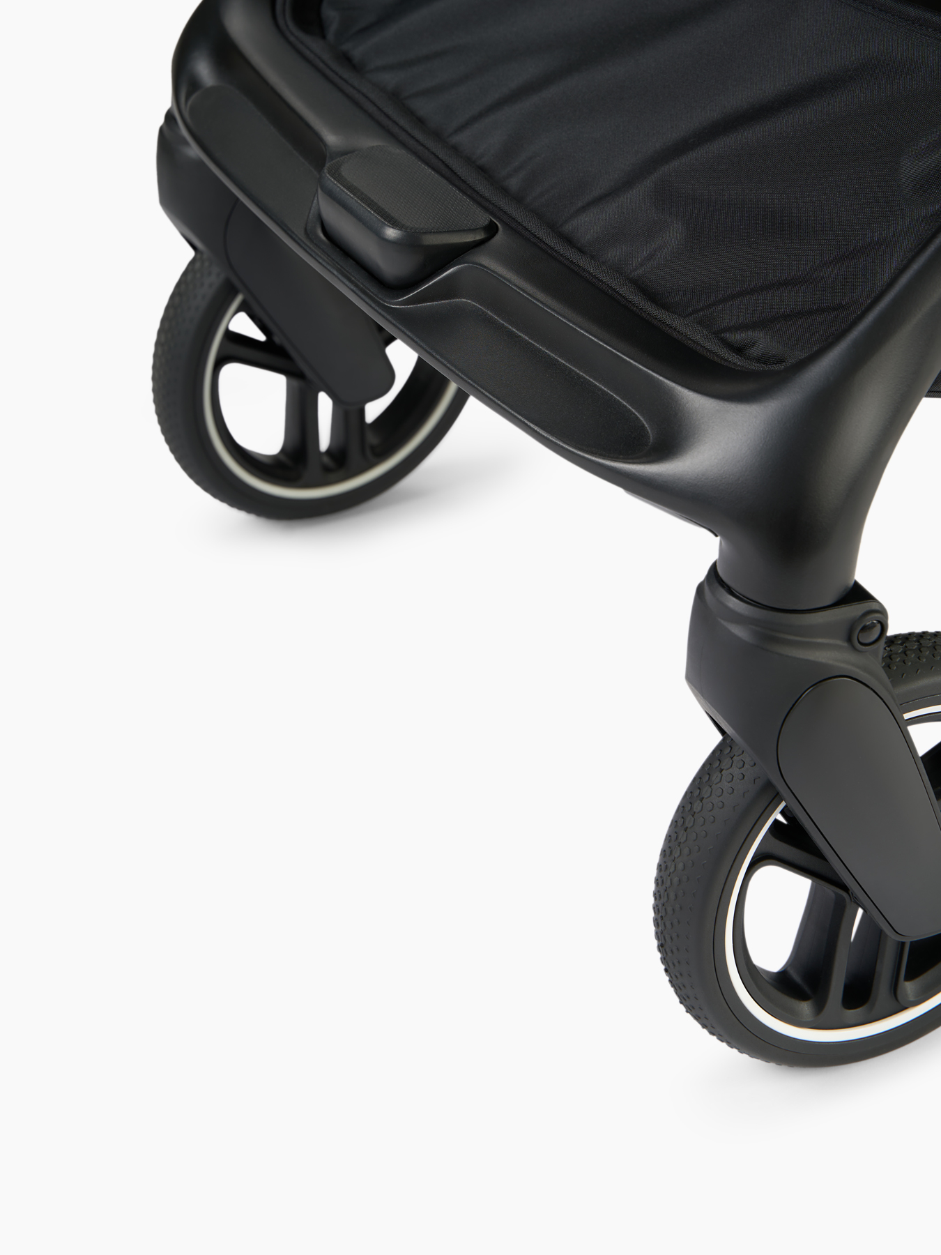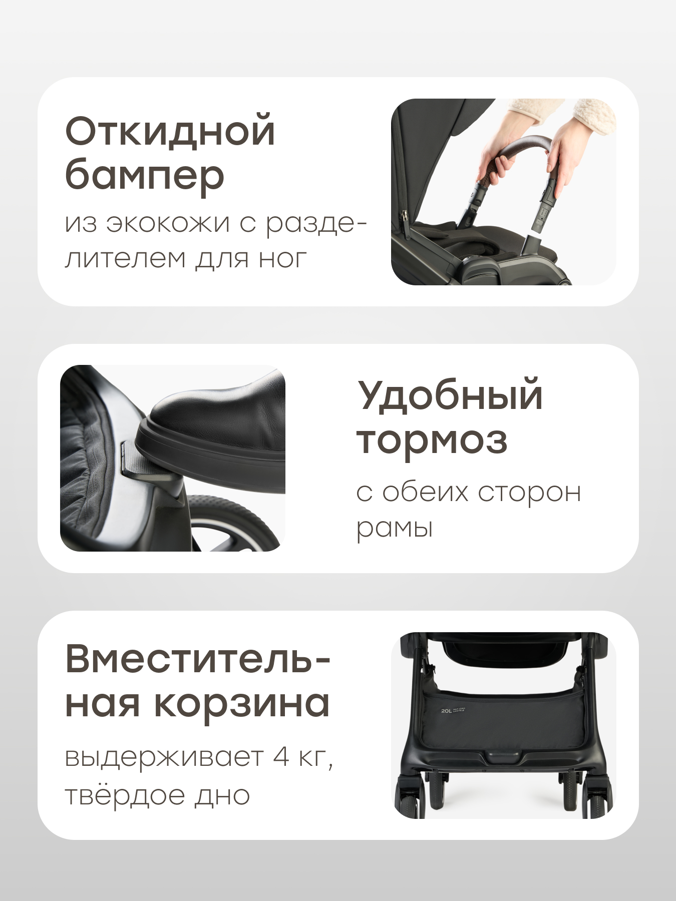 Капюшон раскрывается до бампера. Педаль тормоза расположена с обеих сторон рамы. Пятиточечные ремни с магнитной пряжкой, откидной бампер и вместительная корзина для вещей делают прогулки максимально безопасными и практичными.