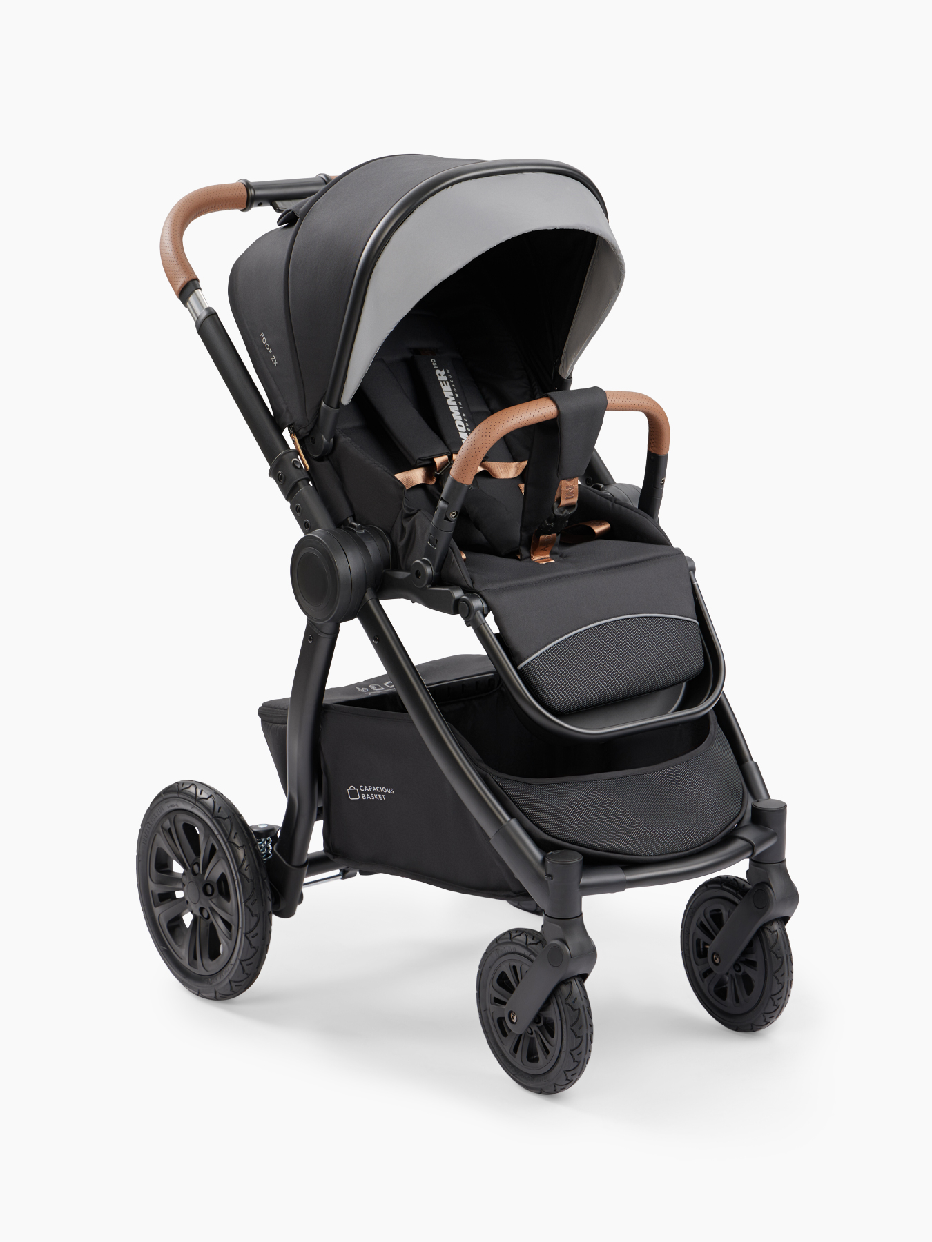 Прогулочный блок оснащён капюшоном до бампера. Бампер с разделителем для ног и пятиточечные ремни с мягкими накладками надёжно фиксируют малыша в коляске. Угол наклона блока, положение спинки и подножки можно отрегулировать. Всесезонная прогулочная коляска с большими надувными колесами. Прогулочный блок устанавливается лицом к родителям или по ходу движения.
