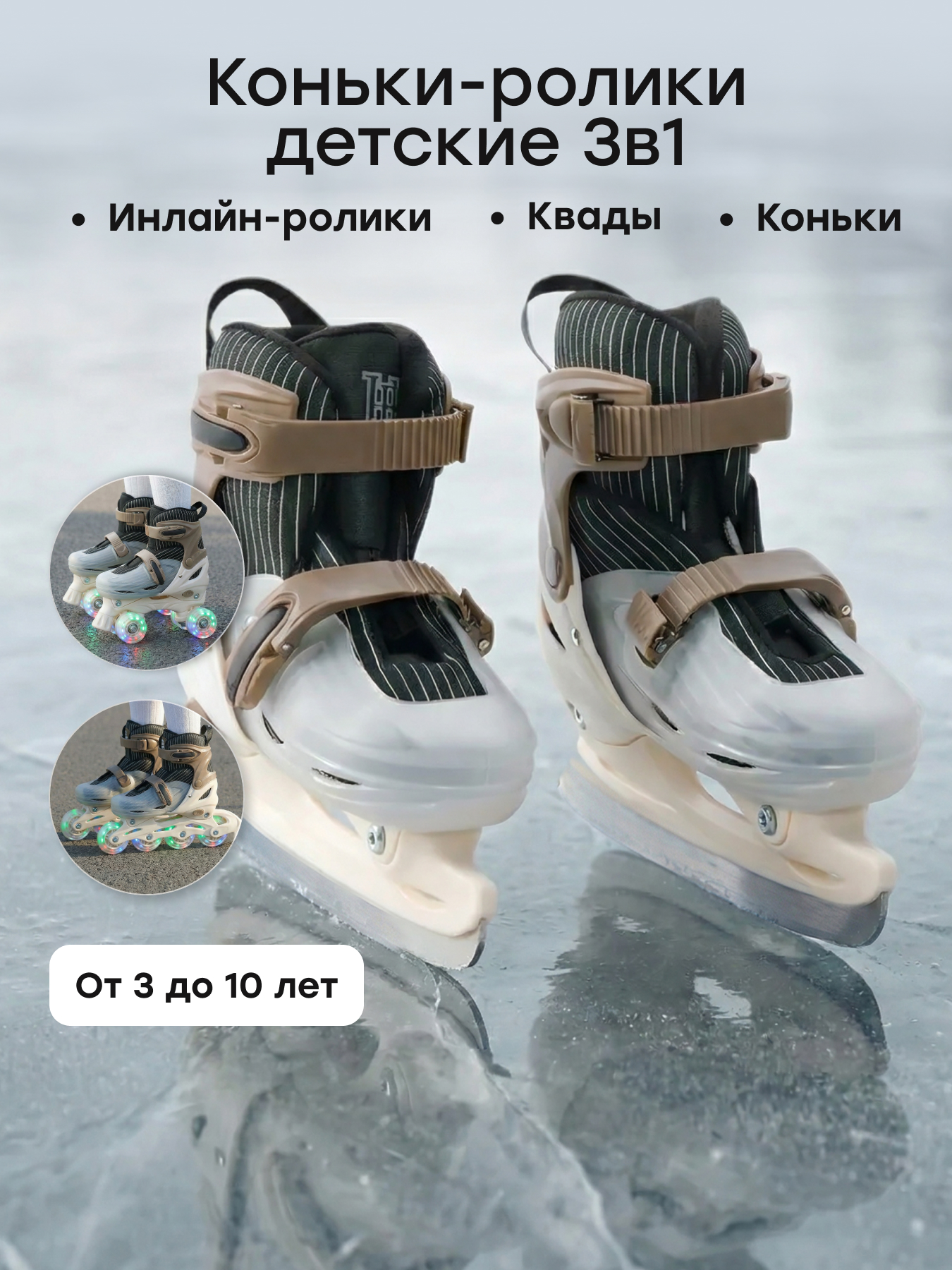 Коньки-ролики раздвижные 3 в 1 — практичный и многофункциональный комплект для активного отдыха ребёнка в любое время года. Формат 3 в 1 помогает ребёнку постепенно осваивать разные виды катания — от первых шагов на квадах до уверенного движения на льду.
