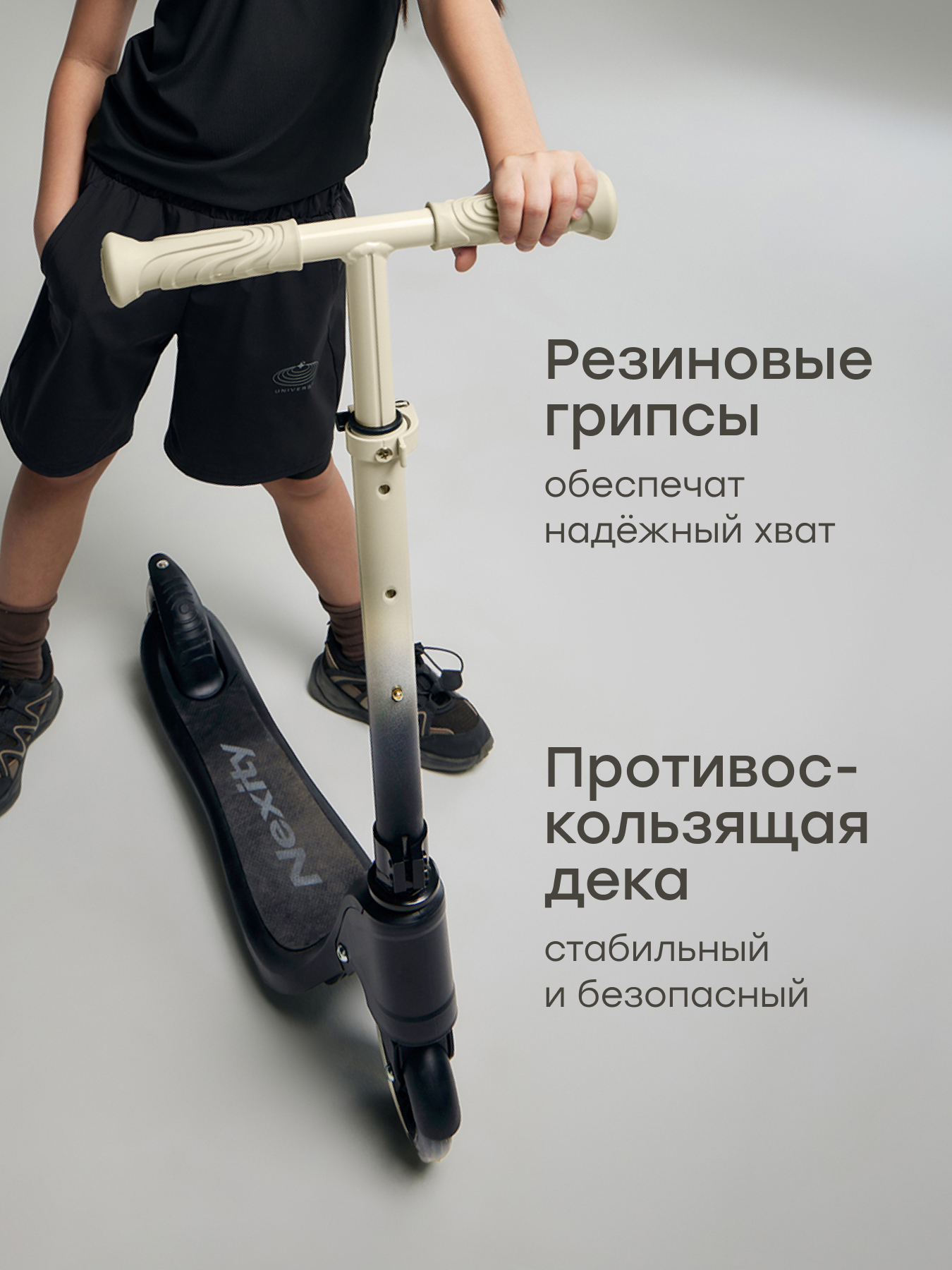 • Противоскользящая дека — устойчивая платформа повышает безопасность и уверенность во время движения.