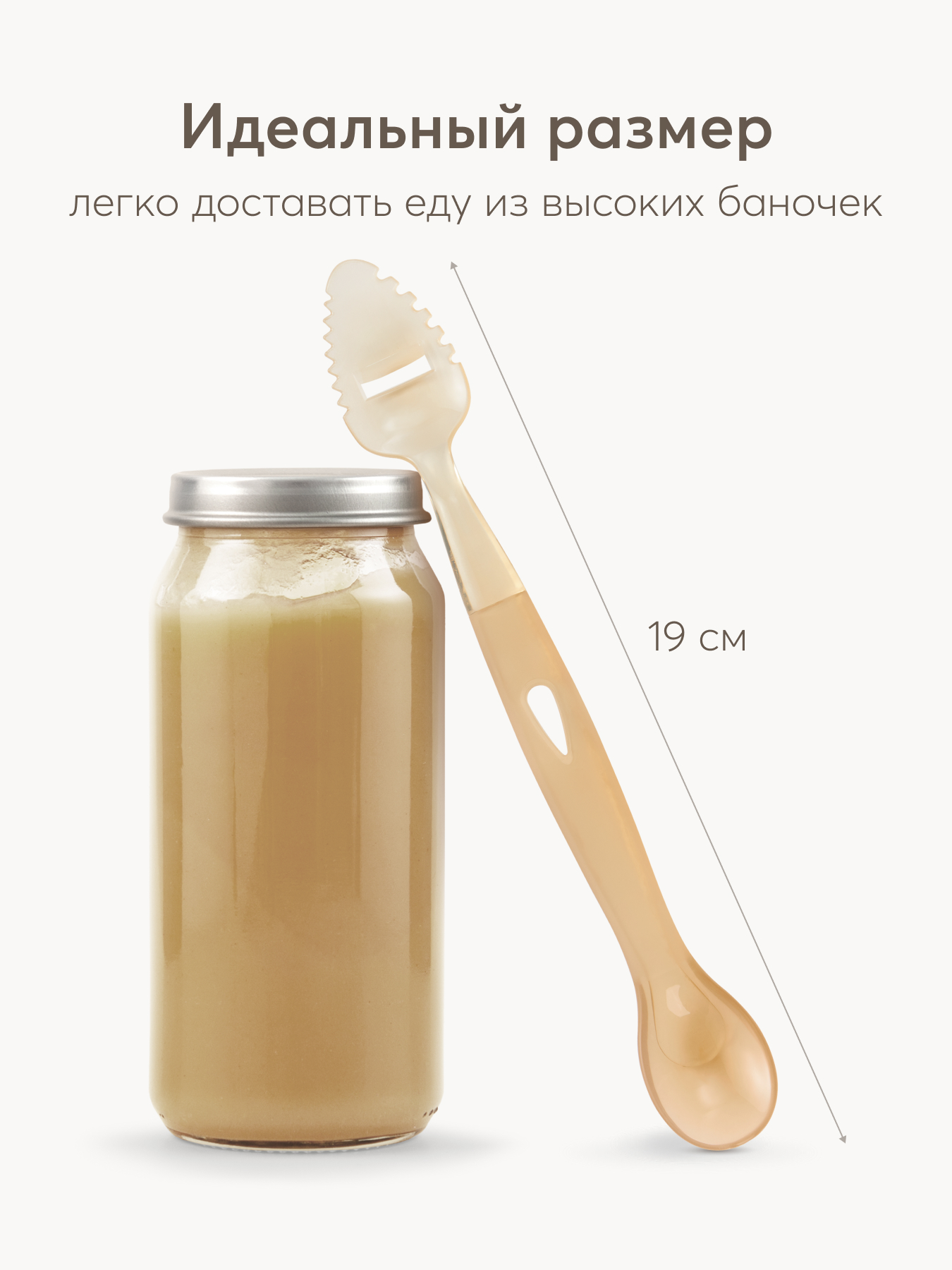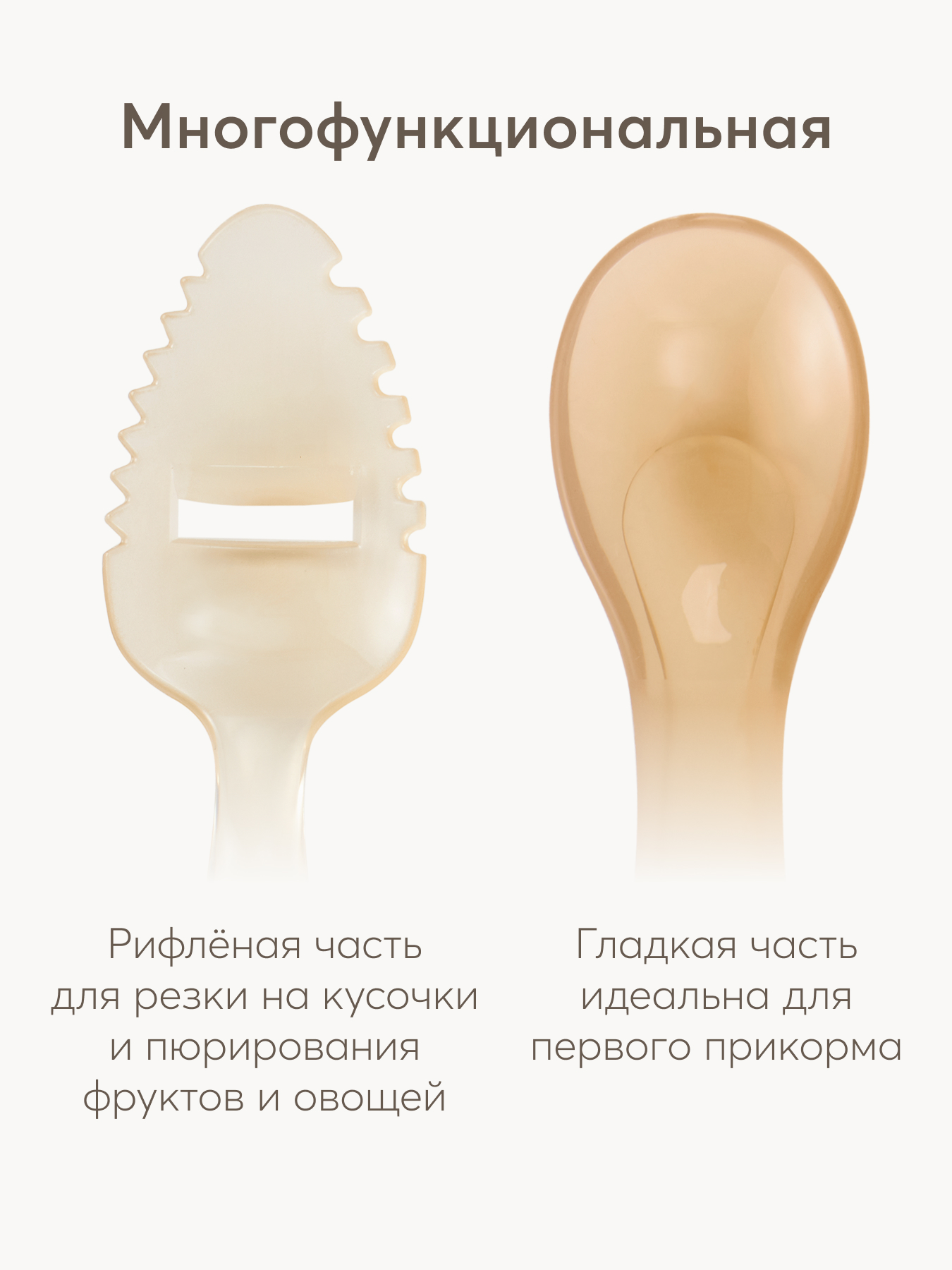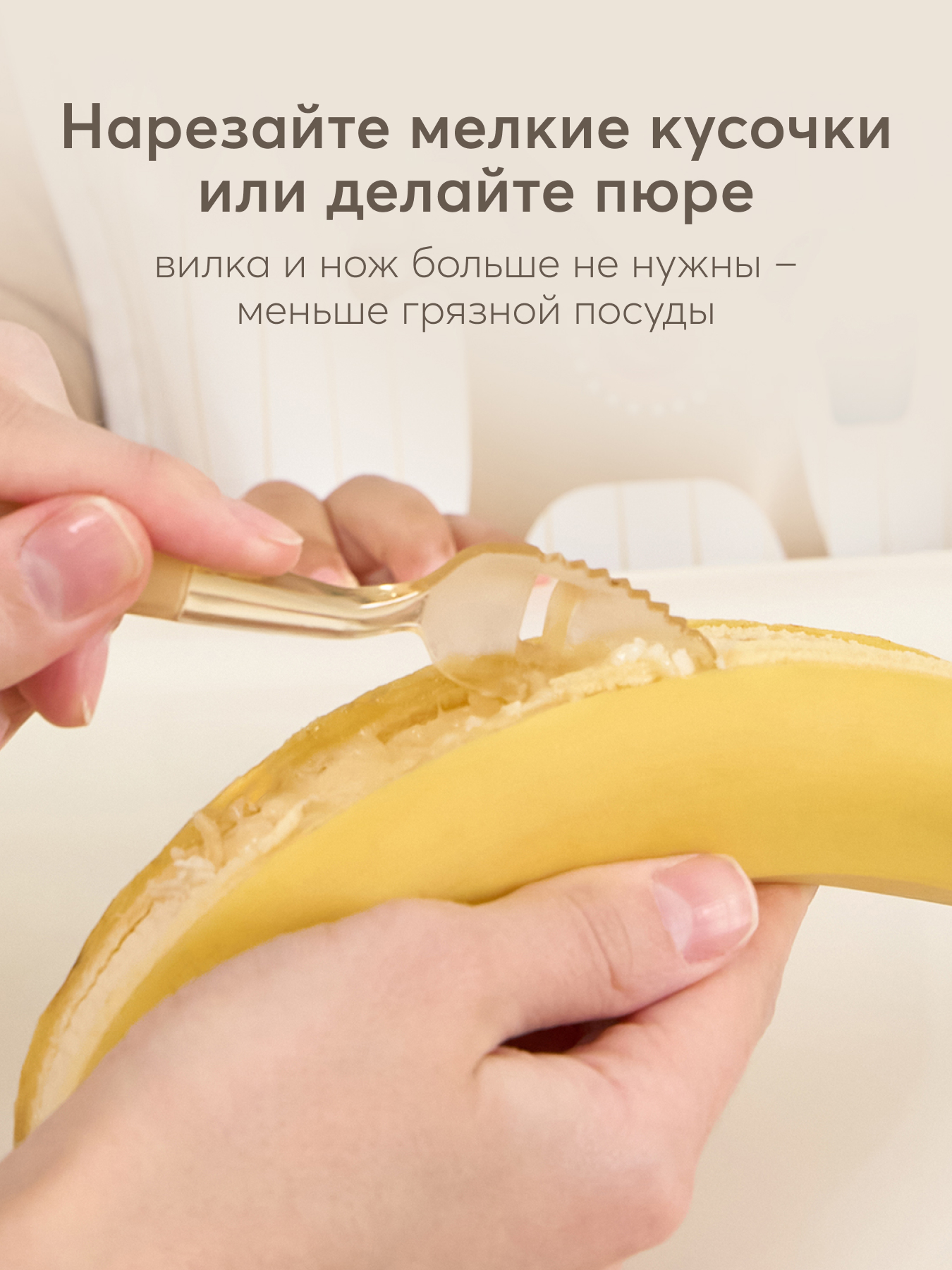 Двусторонняя ложка создана для удобства родителей при введении прикорма. Гладкая часть идеальна для каш и пюре. Имеет удобный размер и подойдет самым маленьким. Благодаря длинной ручке легко доставать питание из высоких баночек. С другой стороны – ложка с зубчиками, которая позволяет отрезать маленькие кусочки свежих фруктов и овощей или размять их в пюре. Такой вариант кормления помогает сохранить максимальное количество витаминов в пище и плавно приучить малыша к кусочкам, а также сохраняет время мамы – после обеда достаточно вымыть один столовый прибор.