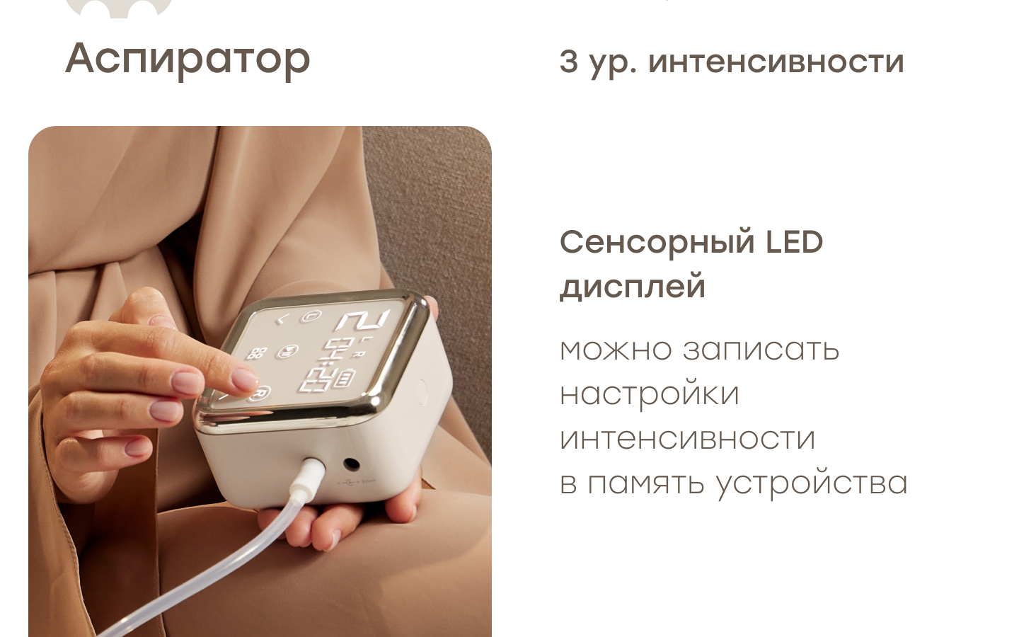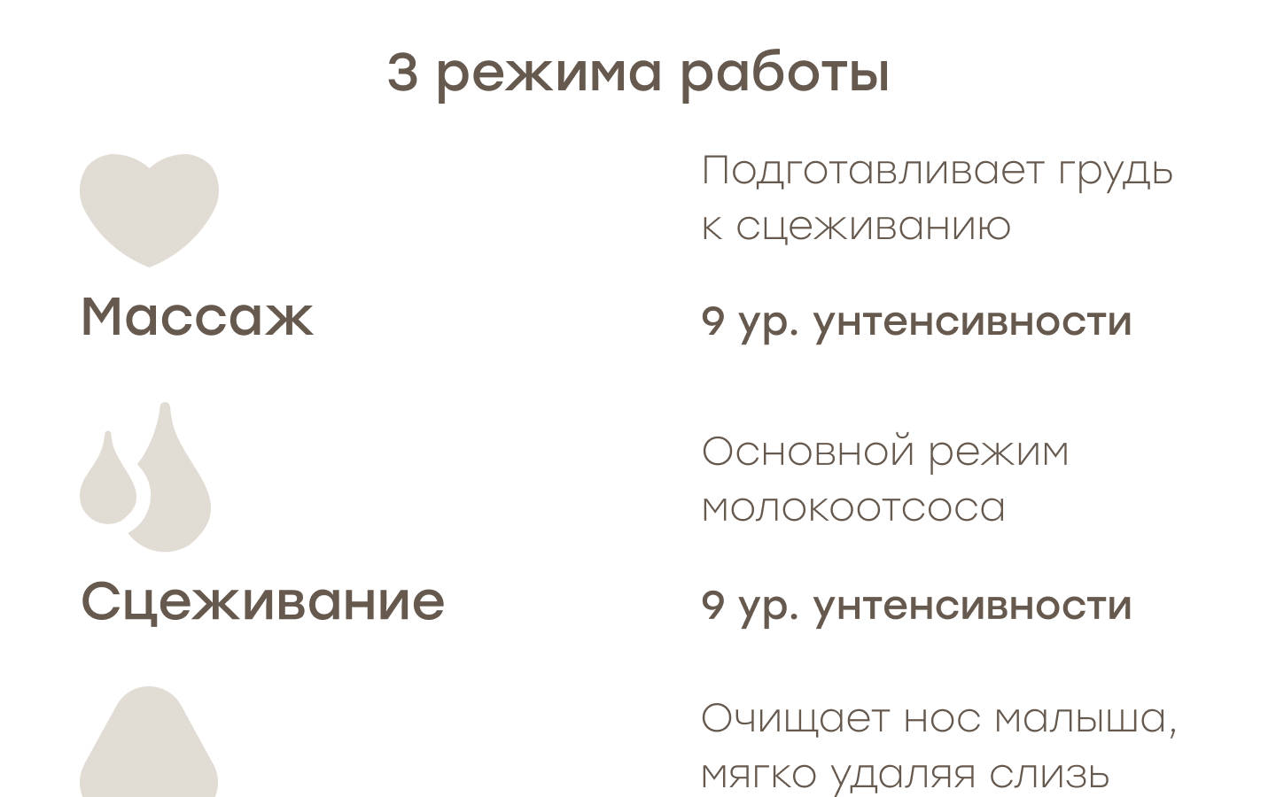 • 3 режима работы: стимулирующий массаж для подготовки груди к сцеживанию, сцеживание, режим назального аспиратора