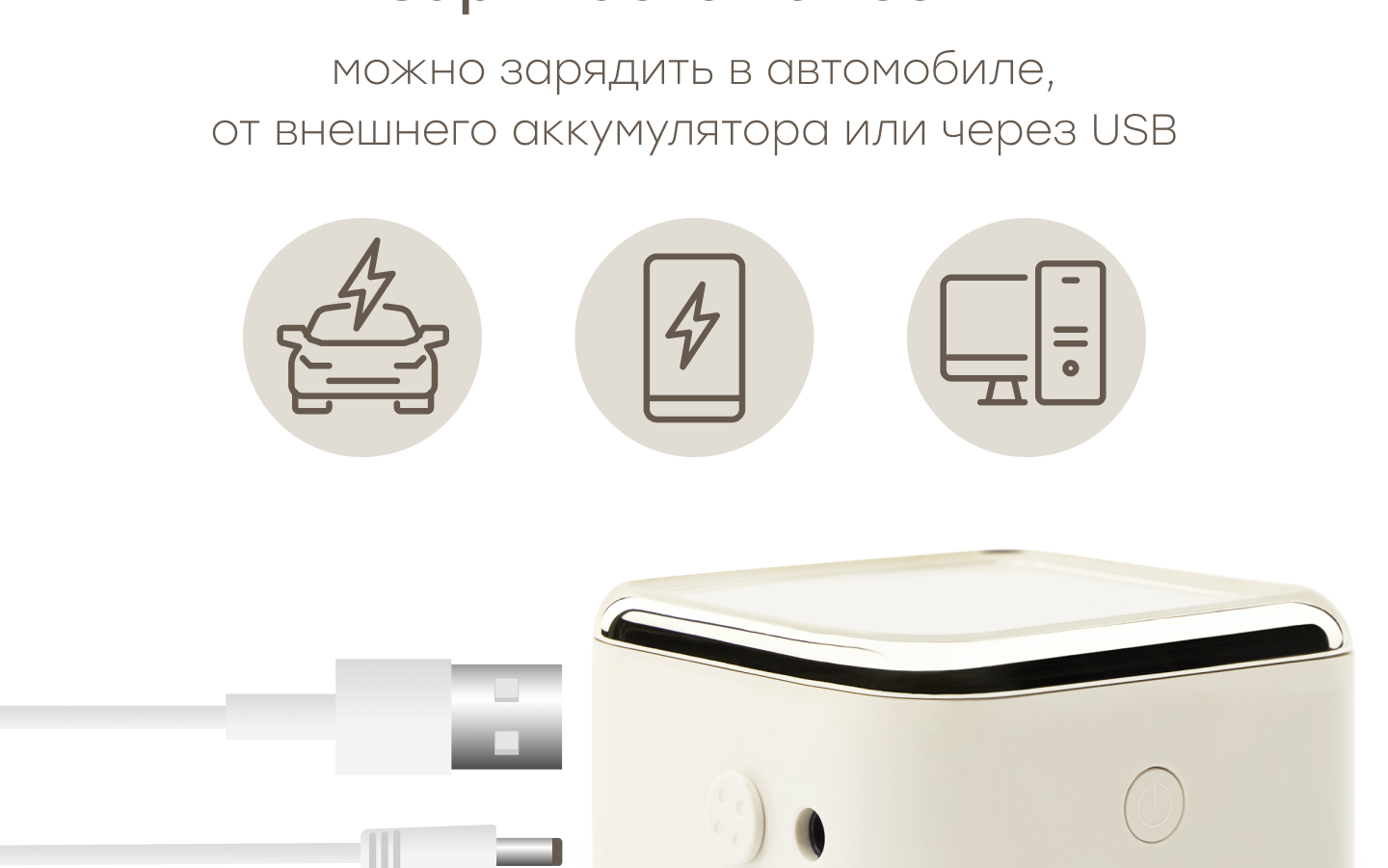 • Заряжается от сети, можно зарядить в автомобиле, от портативного зарядного устройства или от компьютера через USB