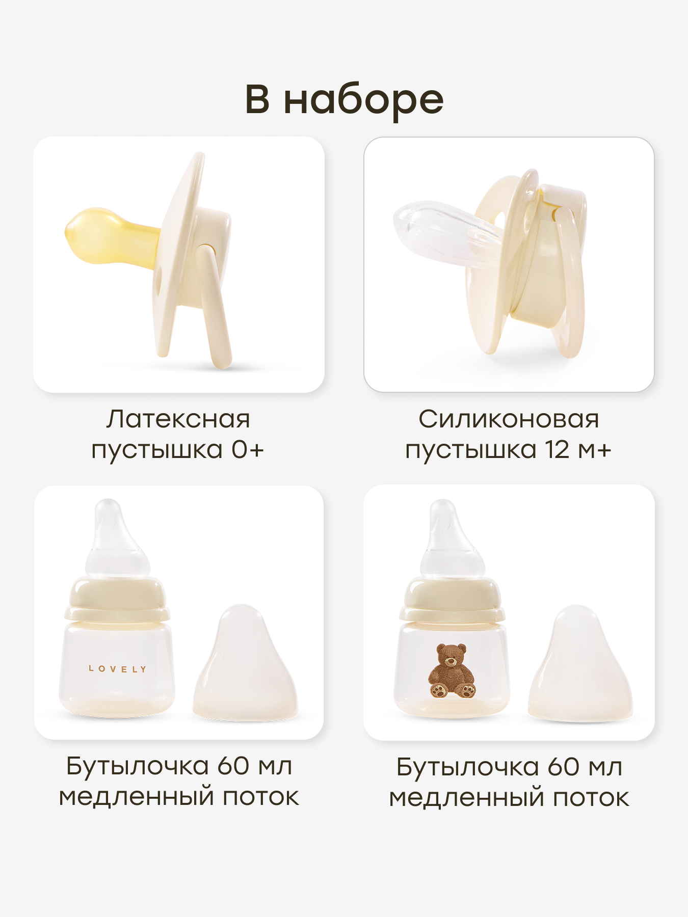 Комплектациябутылочка для кормления (60 мл) с силиконовой соской (медленный поток) - 2 шт., соска-пустышка латексная (форма вишня, 0-6) - 1 шт., соска-пустышка силиконовая (симметричной формы, 12-24) - 1 шт.