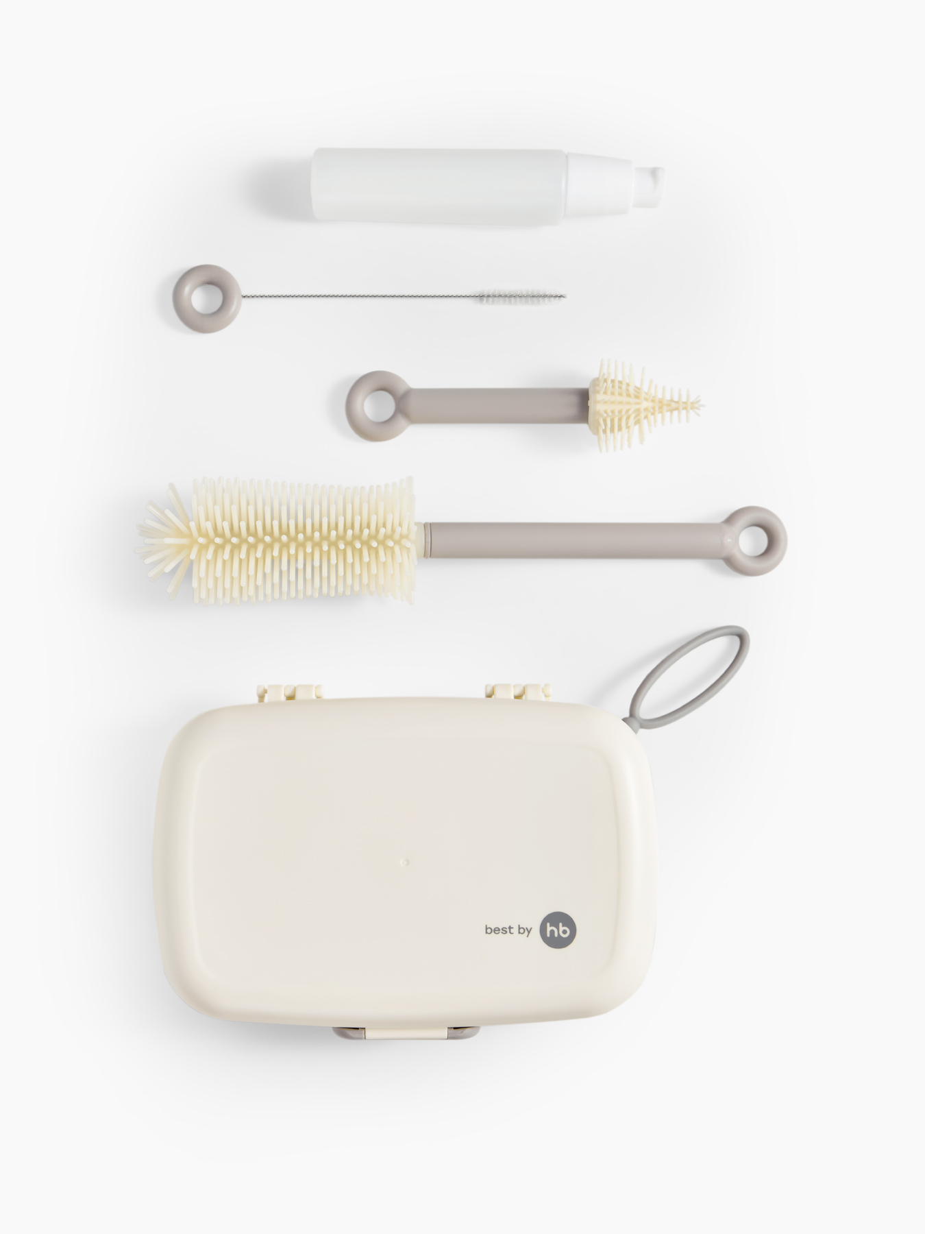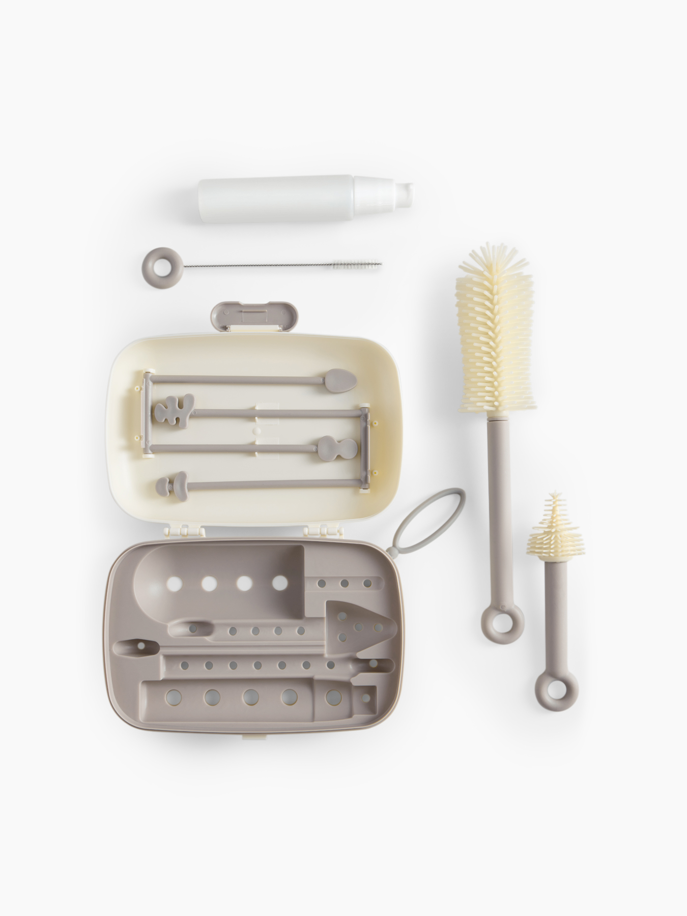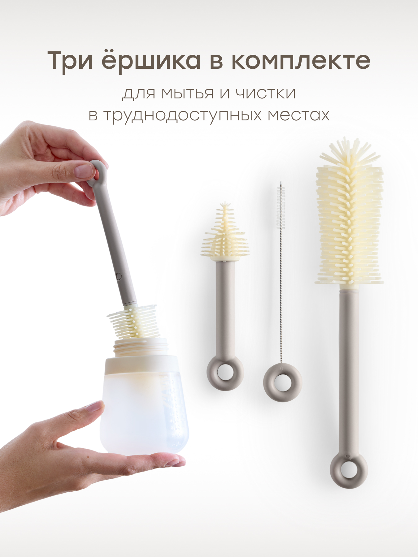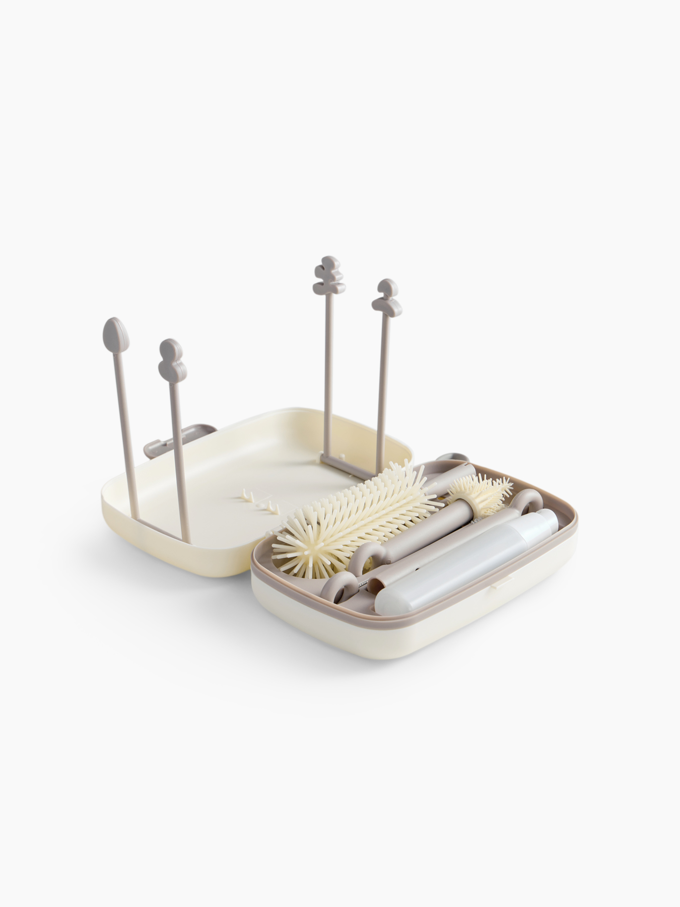 • В комплект входят: большой ершик для бутылок, щётка для сосок с гибким наконечником, щётка для трубочек, дозатор для моющего средства на 50 мл, сушилка-контейнер для хранения