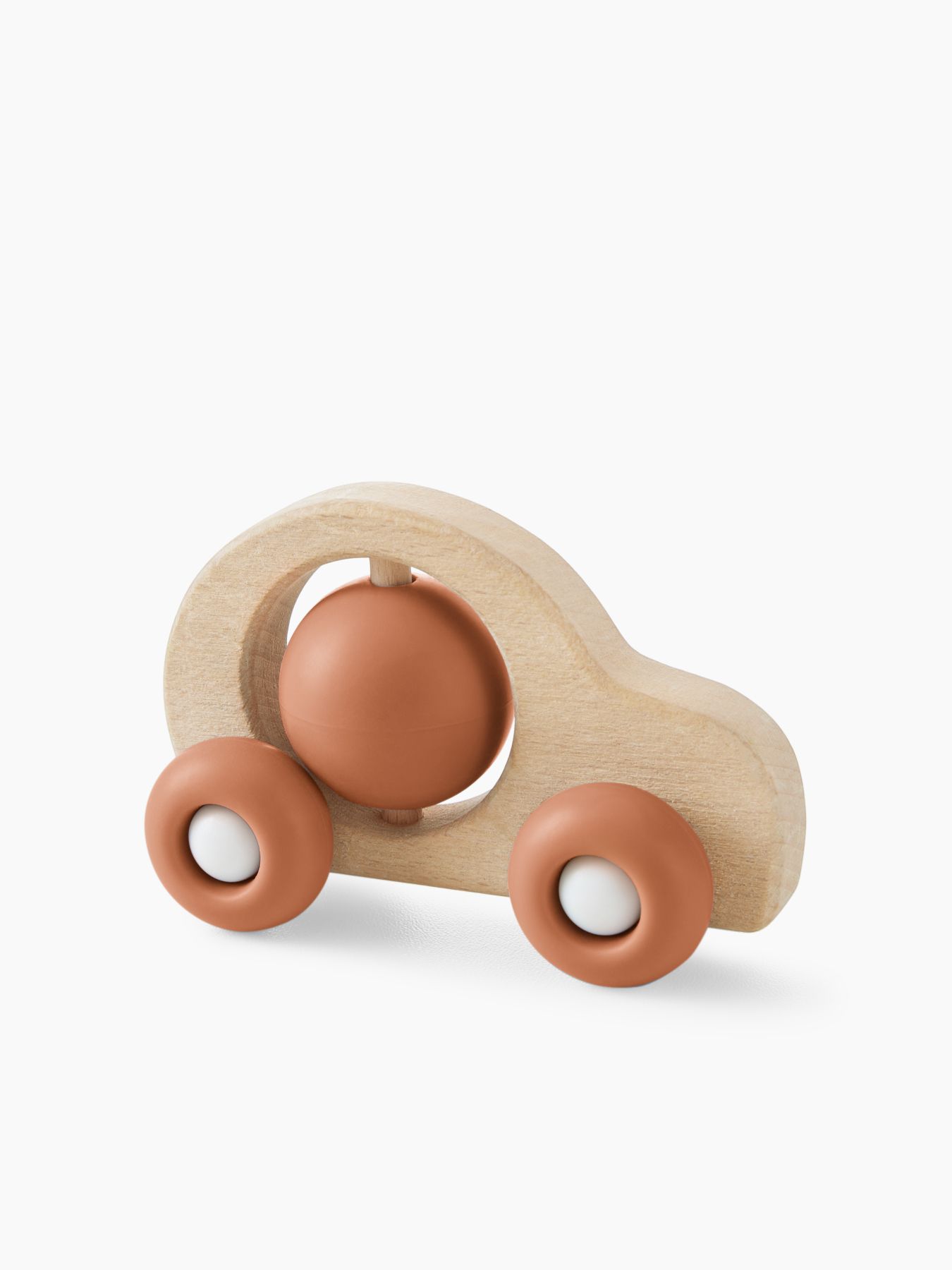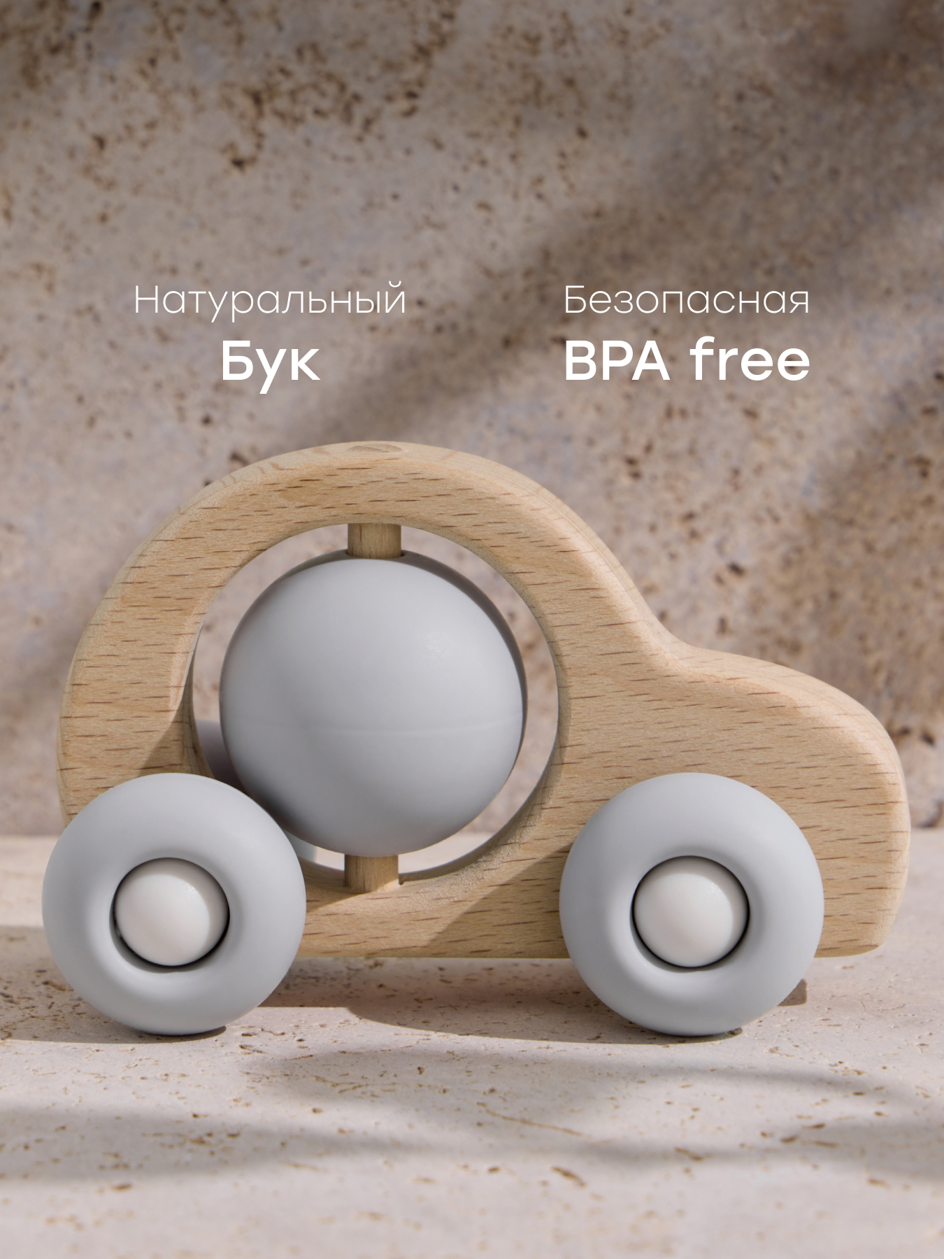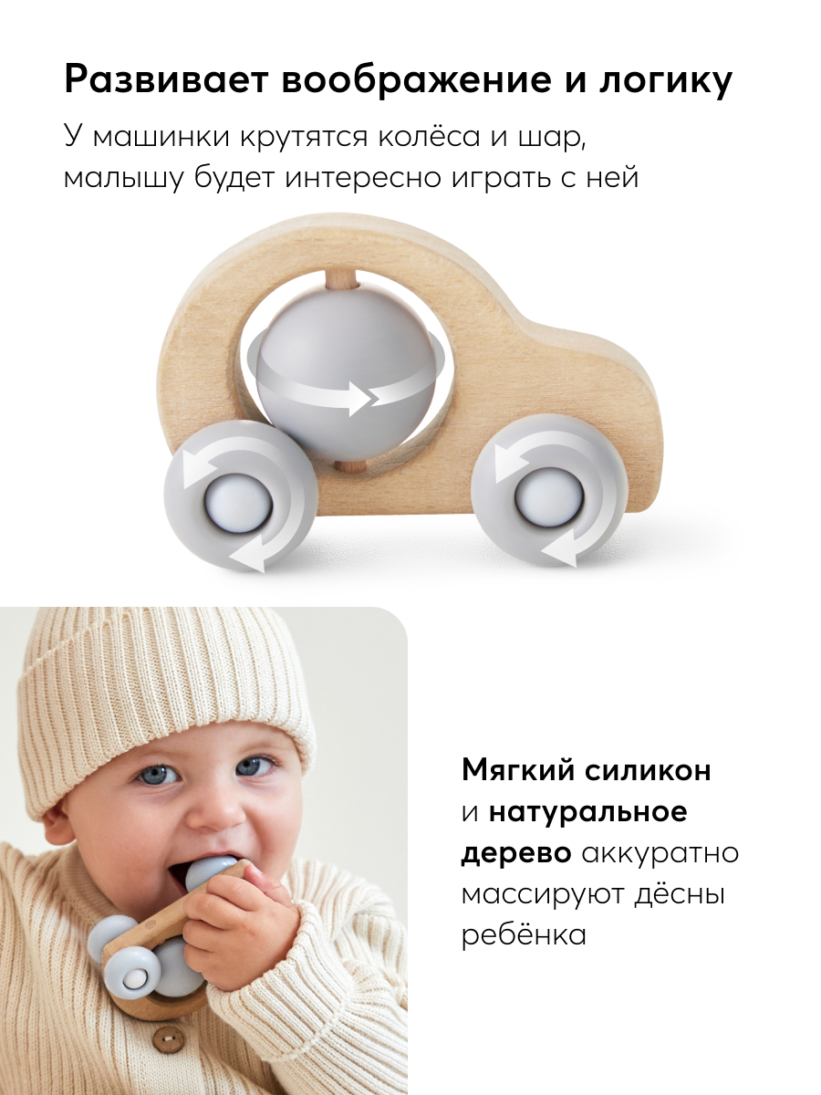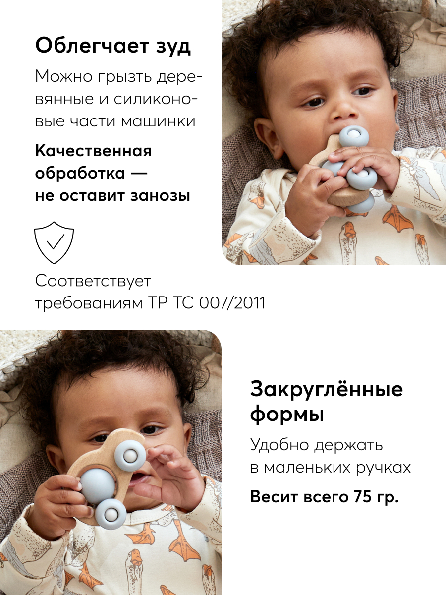 Прорезыватель в виде машинки из натурального бука - идеальная игрушка для малыша. Машинку можно грызть - дерево и силикон отлично массируют дёсны, а отсутствие острых углов делает ее безопасной игрушкой. Прорезыватель удобно держать в маленькой руке, а игры с ним успокаивают ребенка и помогут в развитии логики и воображения.