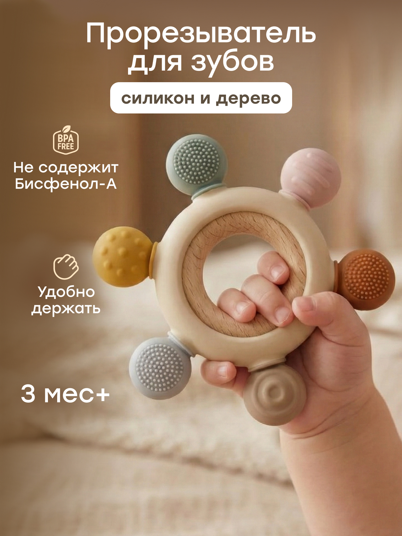 Прорезыватель необходим, чтобы облегчить малышу период появления первых зубов. Форму в виде кольца удобно держать в руках, а фактура натурального бука приятна на ощупь. Безопасную деревянную рукоятку тоже можно грызть, но силиконовые лепесточки понравятся малышу больше - они отличаются рельефом, чтобы ребёнок мог выбрать любимую поверхность, а также познавал тактильное разнообразие мира.
