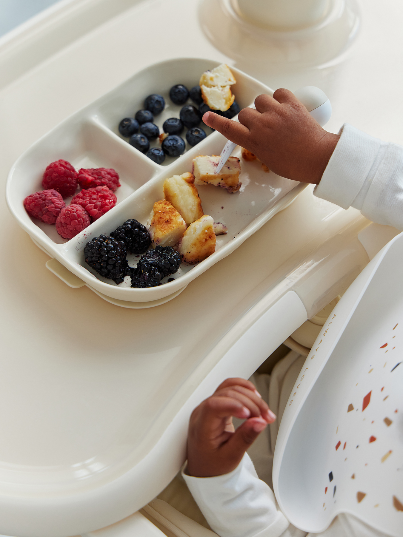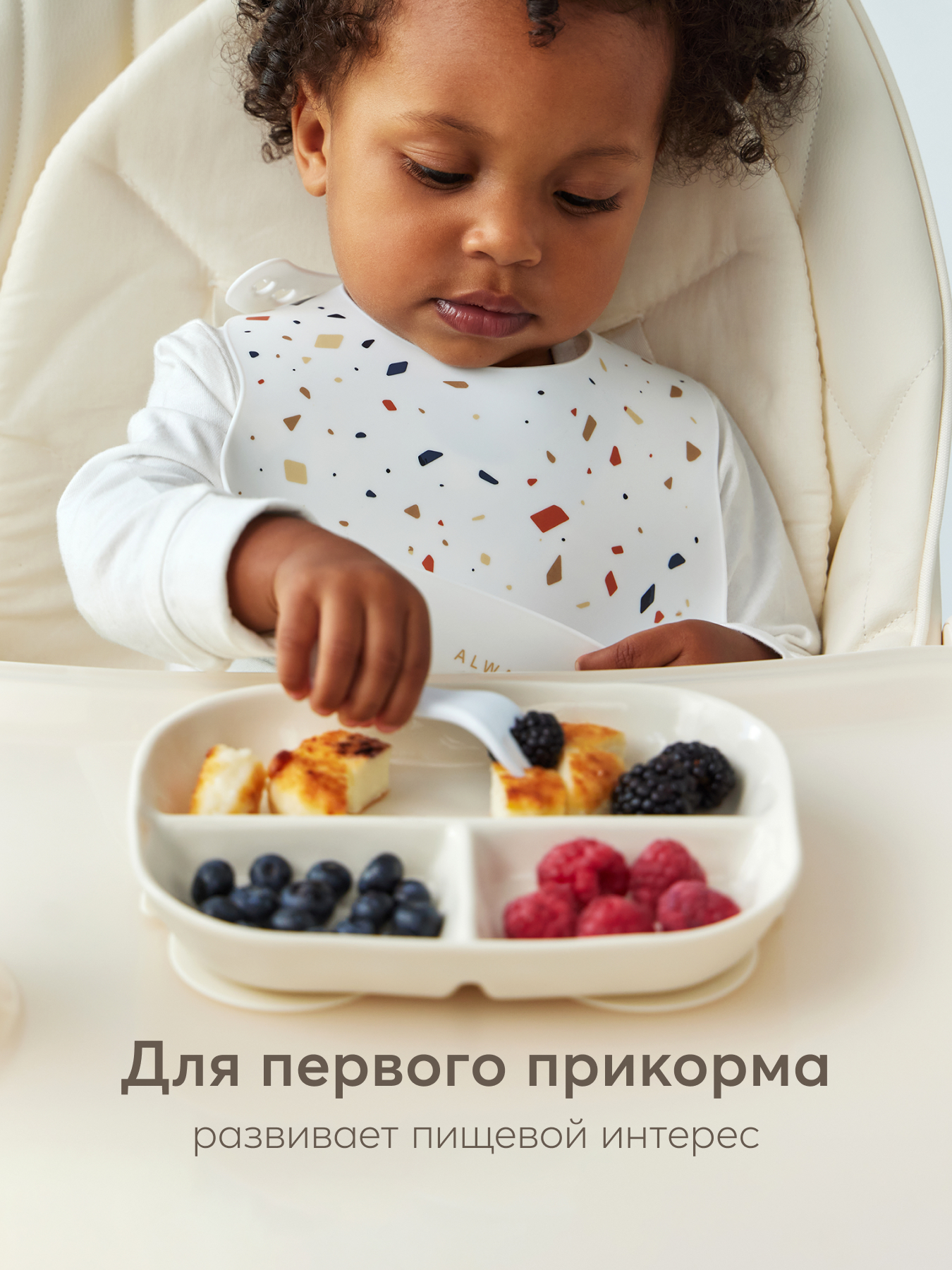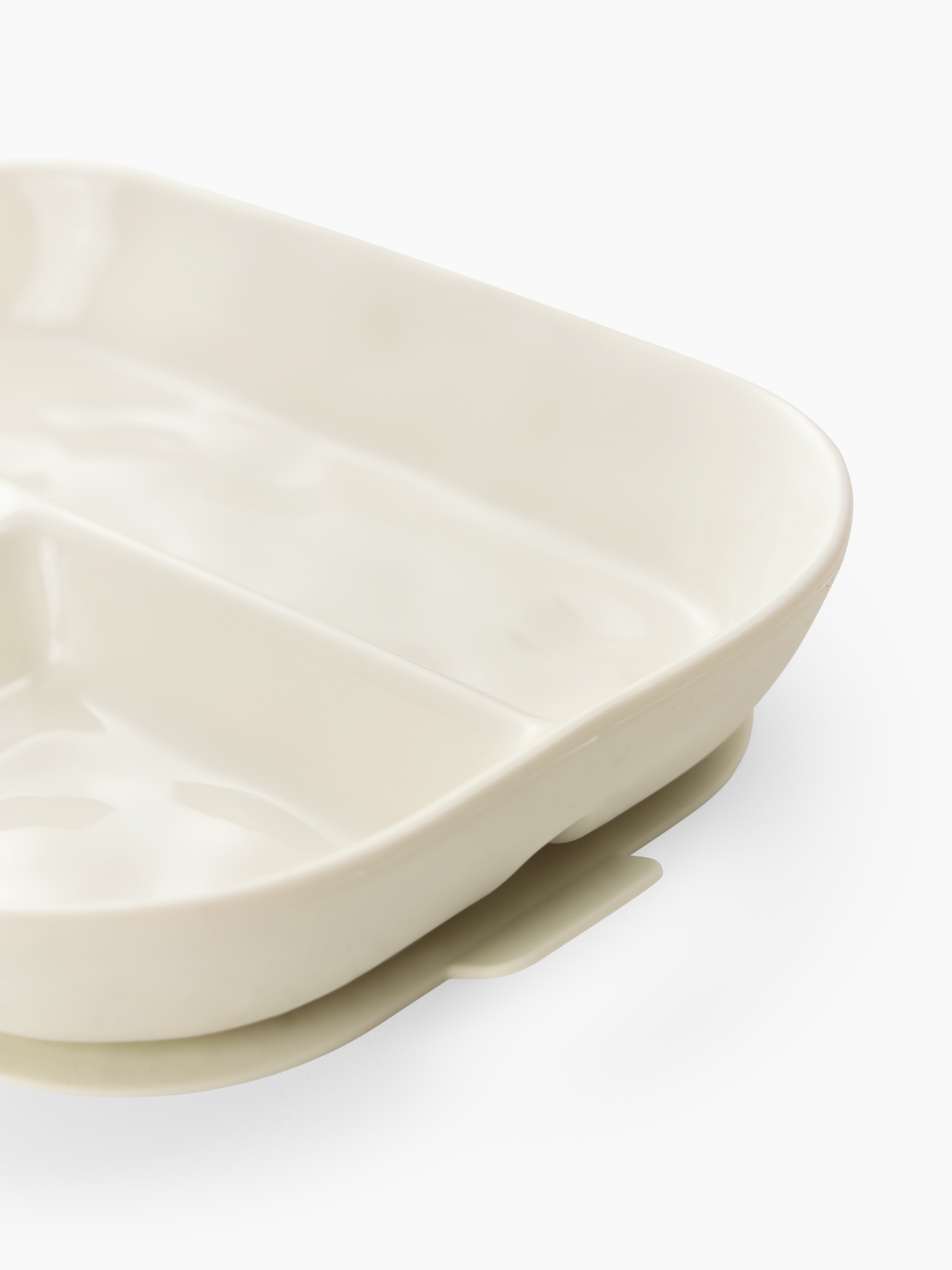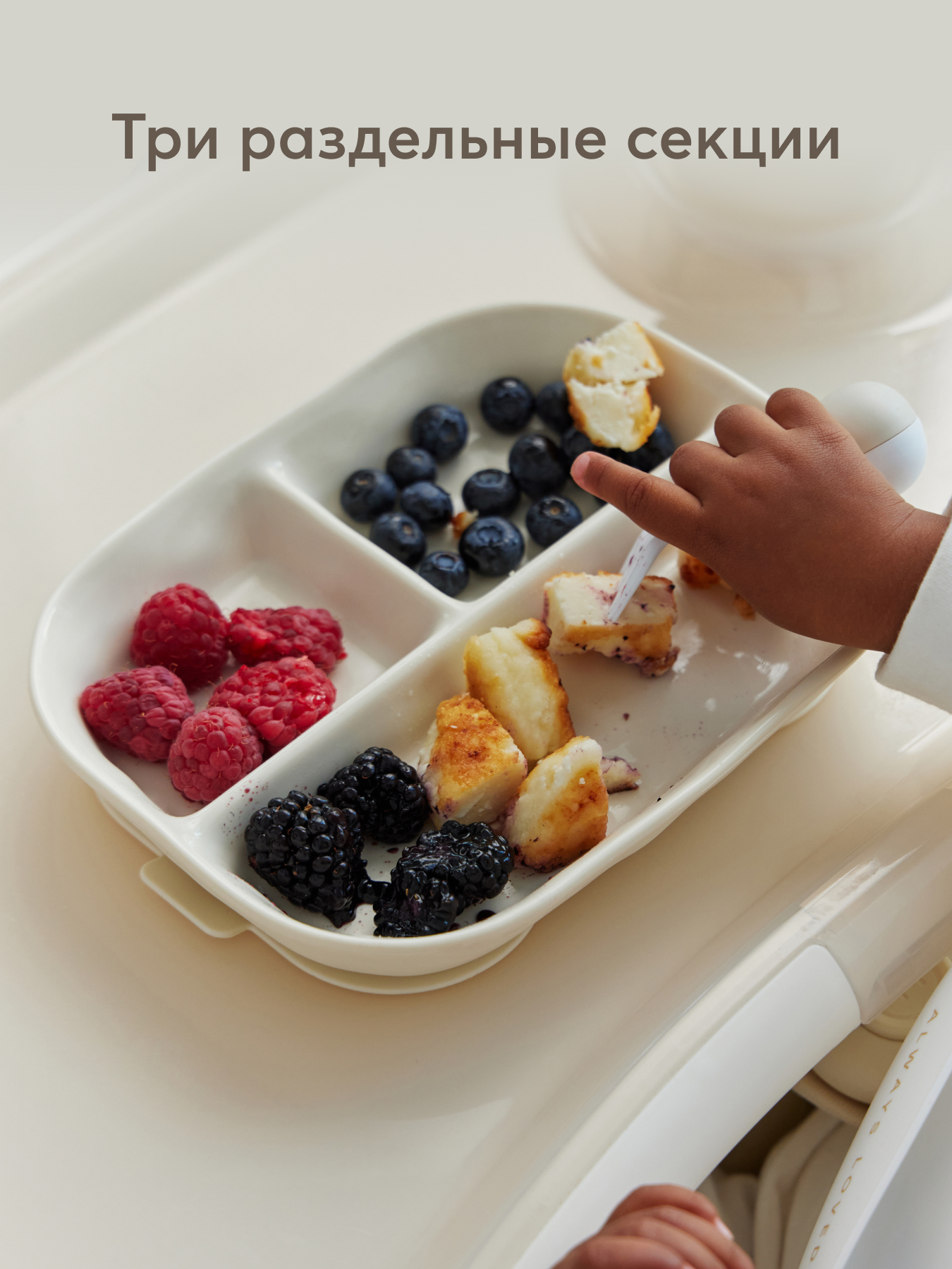 Порционная силиконовая тарелка идеально подходит для первых самостоятельных приемов пищи малыша. Разделена на три секции: это позволяет удобно раскладывать разные виды продуктов, избегая их смешивания. Благодаря надежной присоске тарелка прочно фиксируется на поверхности, предотвращая переворачивание и разливы.